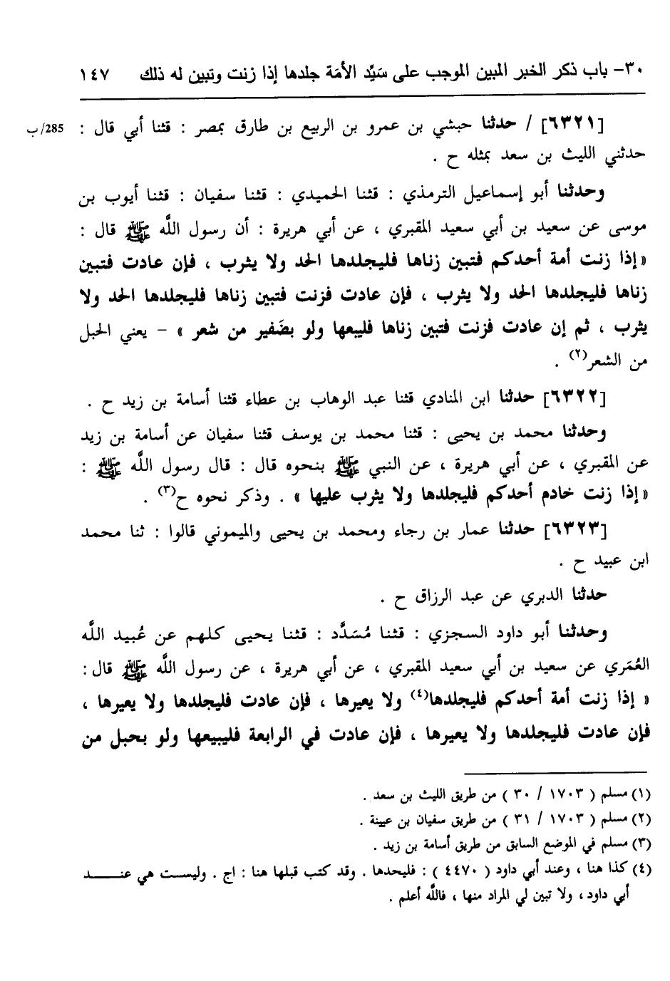 6321 - حَدَّثَنَا حَبَشِيُّ بْنُ عَمْرِو بْنِ الرَّبِيعِ بْنِ طَارِقٍ، بِمِصْرَ، قثنا أَبِي، قَالَ: حَدَّثَنِي اللَّيْثُ بْنُ سَعْدٍ، بِمِثْلِهِ ح، وَحَدَّثَنَا أَبُو إِسْمَاعِيلَ التِّرْمِذِيُّ، قثنا الْحُمَيْدِيُّ، قثنا سُفْيَانُ، قثنا أَيُّوبُ بْنُ مُوسَى، عَنْ سَعِيدِ بْنِ أَبِي سَعِيدٍ الْمَقْبُرِيِّ، عَنْ أَبِي هُرَيْرَةَ، أَنَّ رَسُولَ اللَّهِ صَلَّى اللهُ عَلَيْهِ وَسَلَّمَ قَالَ: «§إِذَا زَنَتْ أَمَةُ أَحَدِكُمْ فَتَبَيَّنَ زِنَاهَا فَلْيَجْلِدْهَا الْحَدَّ، وَلَا يُثَرِّبْ، فَإِنْ عَادَتْ فَتَبَيَّنَ زِنَاهَا فَلْيَجْلِدْهَا الْحَدَّ، وَلَا يُثَرِّبْ، فَإِنْ عَادَتْ فَزَنَتْ فَتَبَيَّنَ زِنَاهَا فَلْيَجْلِدْهَا الْحَدَّ، وَلَا يُثَرِّبْ، ثُمَّ إِنْ عَادَتْ فَزَنَتْ فَتَبَيَّنَ زِنَاهَا فَلْيَبِعْهَا، وَلَوْ بِضَفِيرٍ مِنْ شَعَرٍ» يَعْنِي: الْحَبْلَ مِنَ الشَّعْرِ،