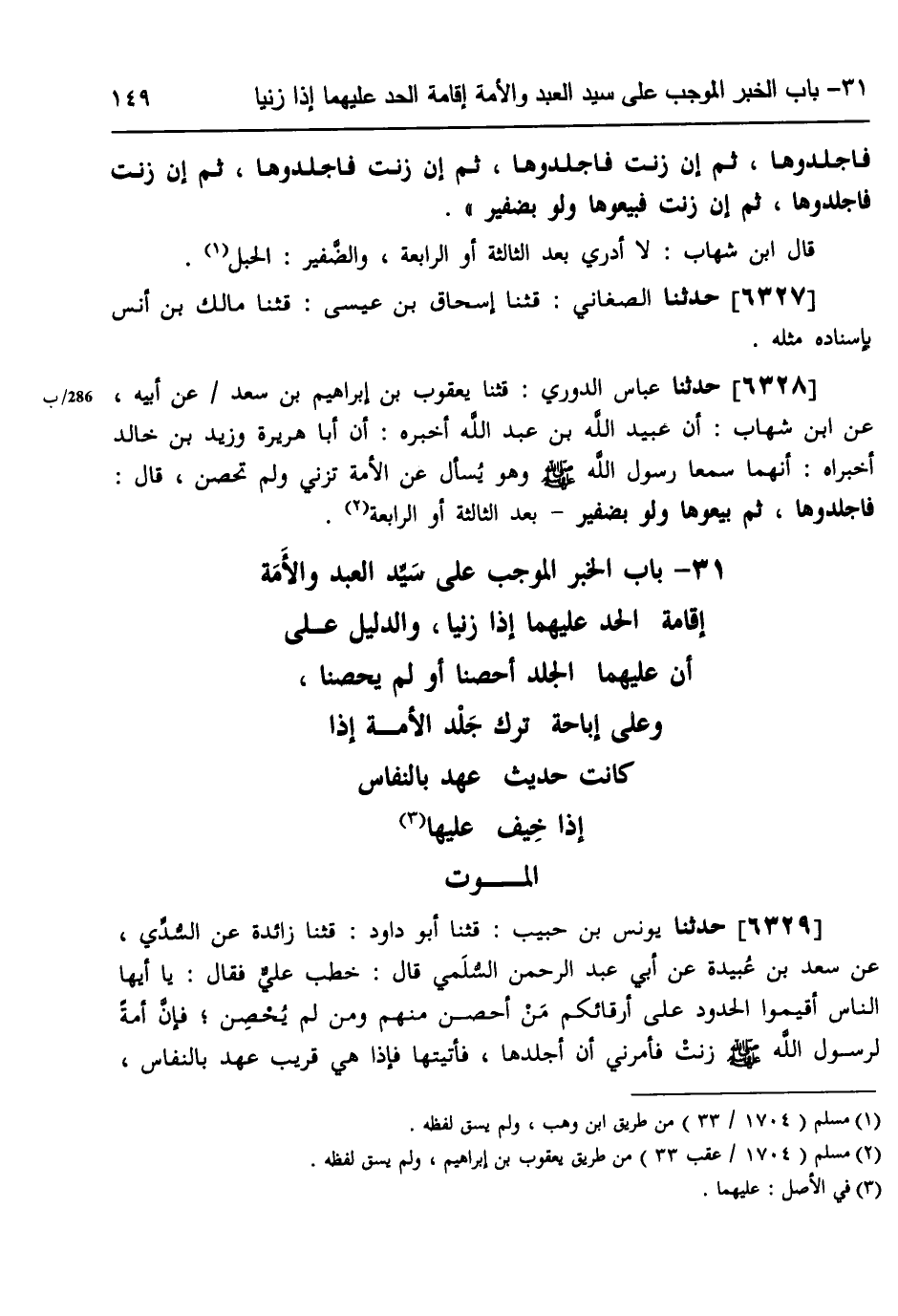 §بَابُ الْخَبَرِ المُوجِبِ عَلَى سَيِّدِ الْعَبْدِ وَالْأَمَةِ إِقَامَةَ الْحَدِّ عَلَيْهِمَا إِذَا زَنَيَا، وَالدَّلِيلِ عَلَى أَنَّ عَلَيْهِمَا الْجَلْدَ أُحْصِنَا أَوْ لَمْ يُحْصَنَا، وَعَلَى إِبَاحَةِ تَرْكِ جَلْدِ الْأَمَةِ إِذَا كَانَتْ حَدِيثَ عَهْدٍ بالنِّفَاسِ إِذَا خِيفَ عَلَيْهَا الْمَوْتُ