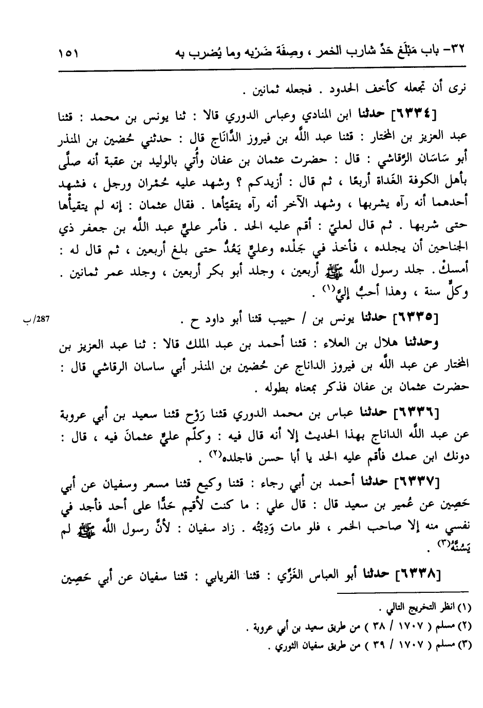 6334 - حَدَّثَنَا ابْنُ الْمُنَادِي، وَعَبَّاسٌ الدُّورِيُّ، قَالَا: ثَنَا يُونُسُ بْنُ مُحَمَّدٍ، قثنا عَبْدُ الْعَزِيزِ بْنُ الْمُخْتَارِ، قثنا عَبْدُ اللَّهِ بْنُ فَيْرُوزَ الدَّانَاجُ، قَالَ: حَدَّثَنِي حُضَيْنُ بْنُ الْمُنْذِرِ أَبُو سَاسَانَ الرَّقَاشِيُّ، قَالَ: حَضَرْتُ عُثْمَانَ بْنَ عَفَّانَ، وَأُتِيَ بِالْوَلِيدِ بْنِ عُقْبَةَ، أَنَّهُ صَلَّى بِأَهْلِ الْكُوفَةِ الْغَدَاةَ أَرْبَعًا، ثُمَّ قَالَ: أَزِيدُكُمْ وَشَهِدَ عَلَيْهِ حُمْرَانُ وَرَجُلٌ فَشَهِدَ أَحَدُهُمَا أَنَّهُ رَآهُ يَشْرَبُهَا، وَشَهِدَ الْآخَرُ أَنَّهُ رَآهُ يَتَقَيَّؤُهَا، فَقَالَ عُثْمَانُ: إِنَّهُ لَمْ يَتَقَيَّأْهَا حَتَّى شَرِبَهَا، ثُمَّ قَالَ لِعَلِيٍّ: أَقِمْ عَلَيْهِ الْحَدَّ فَأَمَرَ عَلِيٌّ عَبْدَ اللَّهِ بْنَ جَعْفَرٍ ذِي الْجَنَاحَيْنِ أَنْ يَجْلِدَهُ، فَأَخَذَ فِي جَلْدِهِ وَعَلِيٌّ يَعِدُّ حَتَّى بَلَغَ أَرْبَعِينَ، ثُمَّ قَالَ لَهُ: أَمْسِكْ، §جَلْدَ رَسُولُ اللَّهِ صَلَّى اللهُ عَلَيْهِ وَسَلَّمَ أَرْبَعِينَ، وَجَلَدَ أَبُو بَكْرٍ أَرْبَعِينَ، وَجَلَدَ عُمَرُ ثَمَانِينَ وَكُلٌّ سُنَّةٌ وَهَذَا أَحَبُّ إِلَيَّ،