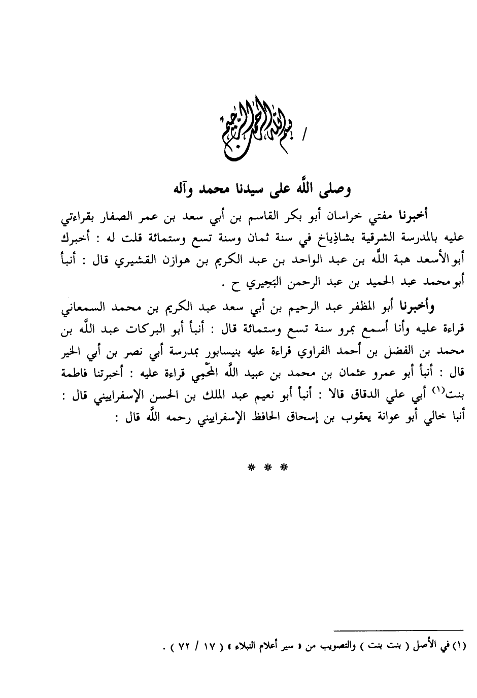 أَخْبَرَنَا مُفْتِي خُرَاسَانَ أَبُو بَكْرٍ الْقَاسِمُ بْنُ أَبِي سَعْدِ بْنِ عُمَرَ الصَّفَّارُ بِقَرَاءَتِي عَلَيْهِ بِالْمَدْرَسَةِ الشَّرْقِيَّةِ بِشَاذْيَاخَ فِي سَنَةَ ثَمَانٍ وَسَنَةَ تِسْعٍ وَسِتِّمِائَةٍ قُلْتُ لَهُ: أَخْبَرَكَ أَبُو الْأَسْعَدِ هِبَةُ اللَّهِ بْنُ عَبْدِ الْوَاحِدِ بْنِ عَبْدِ الْكَرِيمِ بْنِ هَوَازِنَ الْقُشَيْرِيُّ قَالَ: أَنْبَأَ أَبُو مُحَمَّدٍ عَبْدُ الْحَمِيدِ بْنُ عَبْدِ الرَّحْمَنِ الْبُحَيْرِيُّ ح. وَأَخْبَرَنَا أَبُو الْمُظَفَّرِ عَبْدُ الرَّحِيمِ بْنُ أَبِي سَعْدٍ عَبْدُ الْكَرِيمِ بْنُ مُحَمَّدٍ السَّمْعَانِيُّ قِرَاءَةً عَلَيْهِ وَأَنَا أَسْمَعُ بِمَرْوَ سَنَةَ تِسْعٍ وَسِتِّمِائَةٍ قَالَ: أَنْبَأَ أَبُو الْبَرَكَاتِ عَبْدُ اللَّهِ بْنُ مُحَمَّدِ بْنِ الْفَضْلِ بْنِ أَحْمَدَ الْفَرَاوِيُّ قِرَاءَةً عَلَيْهِ بِنَيْسَابُورَ بِمَدْرَسَةِ أَبِي نَصْرِ بْنِ أَبِي الْخَيْرِ قَالَ: أَنْبَأَ أَبُو عَمْرٍو عُثْمَانُ بْنُ مُحَمَّدِ بْنِ عُبَيْدِ اللَّهِ الْمَحْمِيُّ قِرَاءَةً عَلَيْهِ: أَخْبَرَتْنَا فَاطِمَةُ بِنْتُ أَبِي عَلِيٍّ الدَّقَّاقِ قَالَا: أَنْبَأَ أَبُو نُعَيْمٍ عَبْدُ الْمَلِكِ بْنُ الْحَسَنِ الْإِسْفَرَايِينِيُّ قَالَ: أَنْبَا خَالِي أَبُو عَوَانَةَ يَعْقُوبُ بْنُ إِسْحَاقَ الْحَافِظُ الْإِسْفَرَايِينِيُّ رَحِمَهُ اللَّهُ قَالَ -[163]-: حَدَّثَنَا عَلِيُّ بْنُ حَرْبٍ، قثنا أَبُو مُعَاوِيَةَ، عَنْ هِشَامِ بْنِ عُرْوَةَ، عَنْ أَبِيهِ، عَنْ زَيْنَبَ بِنْتِ أُمِّ سَلَمَةَ، رَضِيَ اللهُ عَنْهُمَا، عَنْ أُمِّ سَلَمَةَ، قَالَتْ: قَالَ رَسُولُ اللهِ صَلَّى اللهُ عَلَيْهِ وَسَلَّمَ: «إِنَّكُمْ §تَخْتَصِمُونَ إِلَيَّ، وَلَعَلَّ بَعْضَكُمْ أَنْ يَكُونَ أَلْحَنَ فِي الحُجَّةِ مِنْ بَعْضٍ، وَإِنَّمَا أَنَا بَشَرٌ أَقْضِي عَلَى مَا أَسْمَعُ، فَمَنْ قَضَيْتُ لَهُ بِشَيْءٍ مِنْ حَقِّ أَخِيهِ فَلَا يَأْخُذْهُ فَإِنَّمَا أَقْطَعُ لَهُ قِطْعَةً مِنَ النَّارِ» ، حَدَّثَنَا يُوسُفُ بْنُ مُسْلِمٍ، قثنا حَجَّاجٌ، عَنِ ابْنِ جُرَيْجٍ، قَالَ: أَخْبَرَنِي هِشَامُ بْنُ عُرْوَةَ، عَنْ عُرْوَةَ، عَنْ زَيْنَبَ بِنْتِ أَبِي سَلَمَةَ رَضِيَ اللَّهُ عَنْهُمَا، عَنْ أُمِّ سَلَمَةَ، قَالَتْ: قَالَ النَّبِيُّ صَلَّى اللهُ عَلَيْهِ وَسَلَّمَ بِمِثْلِهِ: «فَلَا يَأْخُذَنَّ مِنْهُ شَيْئًا»