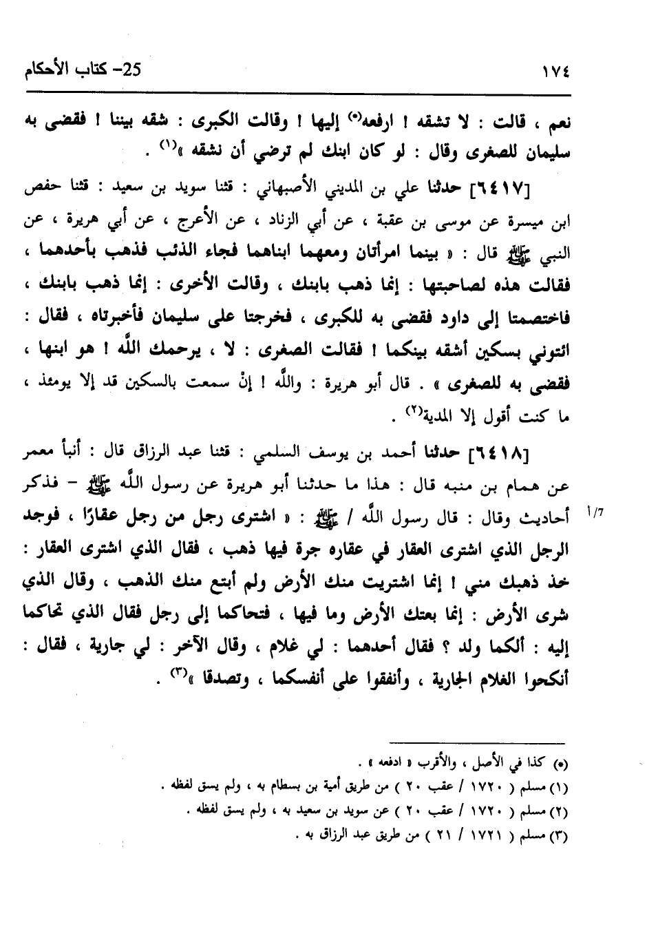 6417 - حَدَّثَنَا عَلِيُّ بْنُ الْمَدِينِيِّ الْأَصْبَهَانِيُّ، قثنا سُوَيْدُ بْنُ سَعِيدٍ، قثنا حَفْصُ بْنُ مَيْسَرَةَ، عَنْ مُوسَى بْنِ عُقْبَةَ، عَنْ أَبِي الزِّنَادِ، عَنِ الْأَعْرَجِ، عَنْ أَبِي هُرَيْرَةَ، عَنِ النَّبِيِّ صَلَّى اللهُ عَلَيْهِ وَسَلَّمَ قَالَ: " §بَيْنَمَا امْرَأَتَانِ وَمَعَهُمَا ابْنَاهُمَا، فَجَاءَ الذِّئْبُ فَذَهَبَ بِأَحَدِهِمَا، فَقَالَتْ هَذِهِ لِصَاحِبَتِهَا: إِنَّمَا ذَهَبَ بِابْنِكِ، وَقَالَتِ الْأُخْرَى: إِنَّمَا ذَهَبَ بِابْنِكِ، فَاخْتَصَمَتَا إِلَى دَاوُدَ، فَقَضَى بِهِ لِلْكُبْرَى، فَخَرَجَتَا عَلَى سُلَيْمَانَ فَأَخْبَرَتَاهُ، فَقَالَ: ائْتُونِي بِسِكِّينٍ أَشُقُّهُ بَيْنَكُمَا، فَقَالَتِ الصُّغْرَى: لَا يرْحَمُكَ اللَّهُ هُوَ ابْنُهَا، فَقَضَى بِهِ لِلصُّغْرَى "، قَالَ أَبُو هُرَيْرَةَ: وَاللَّهِ إنْ سَمِعْتُ بِالسِّكِّينِ قَدْ إِلَّا يَوْمَئِذٍ مَا كُنْتُ أَقُولُ إِلَّا الْمُدْيَةَ