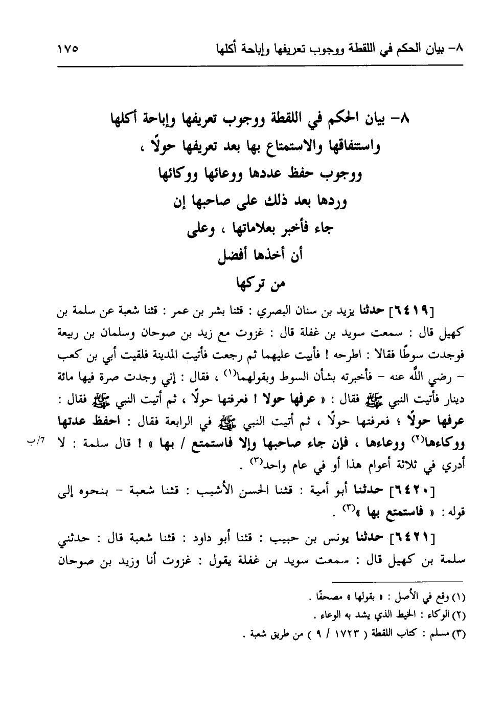 §بَيَانُ الْحُكْمِ فِي اللُّقَطَةِ، وَوُجُوبِ تَعْرِيفِهَا وَإِبَاحَةِ أَكْلِهَا، واسْتِنْفَاقِهَا، وَالِاسْتِمْتَاعِ بِهَا بَعْدَ تَعْرِيفِهَا حَوْلًا، وَوُجُوبِ حِفْظِ عَدَدِهَا وَوِعَائِهَا وَوِكَائِهَا وَرَدِّهَا بَعْدَ ذَلِكَ عَلَى صَاحِبِهَا إِنْ جَاءَ فَأَخْبَرَ بِعَلَامَاتِهَا وَعَلَى أَنَّ أَخْذَهَا أَفْضَلُ مِنْ تَرْكِهَا