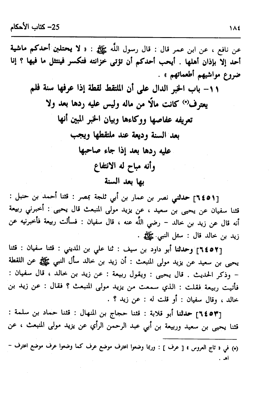 6453 - حَدَّثَنَا أَبُو قِلَابَةَ، قثنا حَجَّاجُ بْنُ الْمِنْهَالِ، قثنا حَمَّادُ بْنُ سَلَمَةَ، قثنا يَحْيَى بْنُ سَعِيدٍ، وَرَبِيعَةُ بْنُ أَبِي عَبْدِ الرَّحْمَنِ الرَّأْيُ، عَنْ يَزِيدَ، مَوْلَى الْمُنْبَعِثِ، عَنْ -[185]- زَيْدِ بْنِ خَالِدٍ الْجُهَنِيِّ، أَنَّ رَسُولَ اللَّهِ صَلَّى اللهُ عَلَيْهِ وَسَلَّمَ سُئِلَ عَنِ §اللُّقَطَةِ، فَقَالَ: «اعْرِفْ عِفَاصَهَا وَوِكَاءَهَا، فَإِنْ جَاءَ صَاحِبُهَا وَإِلَّا فَشَأْنُكَ بِهَا» ،