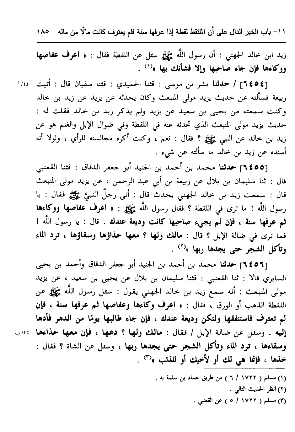 6456 - حَدَّثَنَا مُحَمَّدُ بْنُ أَحْمَدَ بْنِ الْجُنَيْدِ أَبُو جَعْفَرٍ الدَّقَّاقُ، وَأَحْمَدُ بْنُ يَحْيَى السَّابِرِيُّ، قَالَا: ثنا الْقَعْنَبِيُّ، قثنا سُلَيْمَانُ بْنُ بِلَالٍ، عَنْ يَحْيَى بْنِ سَعِيدٍ، عَنْ يَزِيدَ، مَوْلَى الْمُنْبَعِثِ، أَنَّهُ سَمِعَ زَيْدَ بْنَ خَالِدٍ الْجُهَنِيَّ، يَقُولُ: سُئِلَ رَسُولُ اللَّهِ صَلَّى اللهُ عَلَيْهِ وَسَلَّمَ عَنِ §اللُّقَطَةِ الذَّهَبِ أَوِ الْوَرِقِ، فَقَالَ: «اعْرِفْ وِكَاءَهَا وَعِفَاصَهَا، ثُمَّ عَرِّفْهَا سَنَةً فَإِنْ لَمْ تُعْتَرَفْ فَاسْتَنْفِقْهَا، وَلْتَكُنْ وَدِيعَةً عِنْدَكَ فَإِنْ جَاءَ طَالِبُهَا يَوْمًا مِنَ الدَّهْرِ فَأَدِّهَا إِلَيْهِ» ، وَسُئِلَ عَنْ ضَالَّةِ الْإِبِلِ، فَقَالَ: «مَا لَكَ وَلَهَا دَعْهَا، فَإِنَّ مَعَهَا حِذَاءَهَا وَسِقَاءَهَا، تَرِدُ الْمَاءَ وَتَأْكُلُ الشَّجَرَ حَتَّى يجِدَهَا رَبُّهَا» ، وَسُئِلَ عَنِ الشَّاةِ، فَقَالَ: «خُذْهَا فَإِنَّمَا هِيَ لَكَ أَوْ لِأَخِيكَ أَوْ لِلذِّئْبِ» -[186]-،
