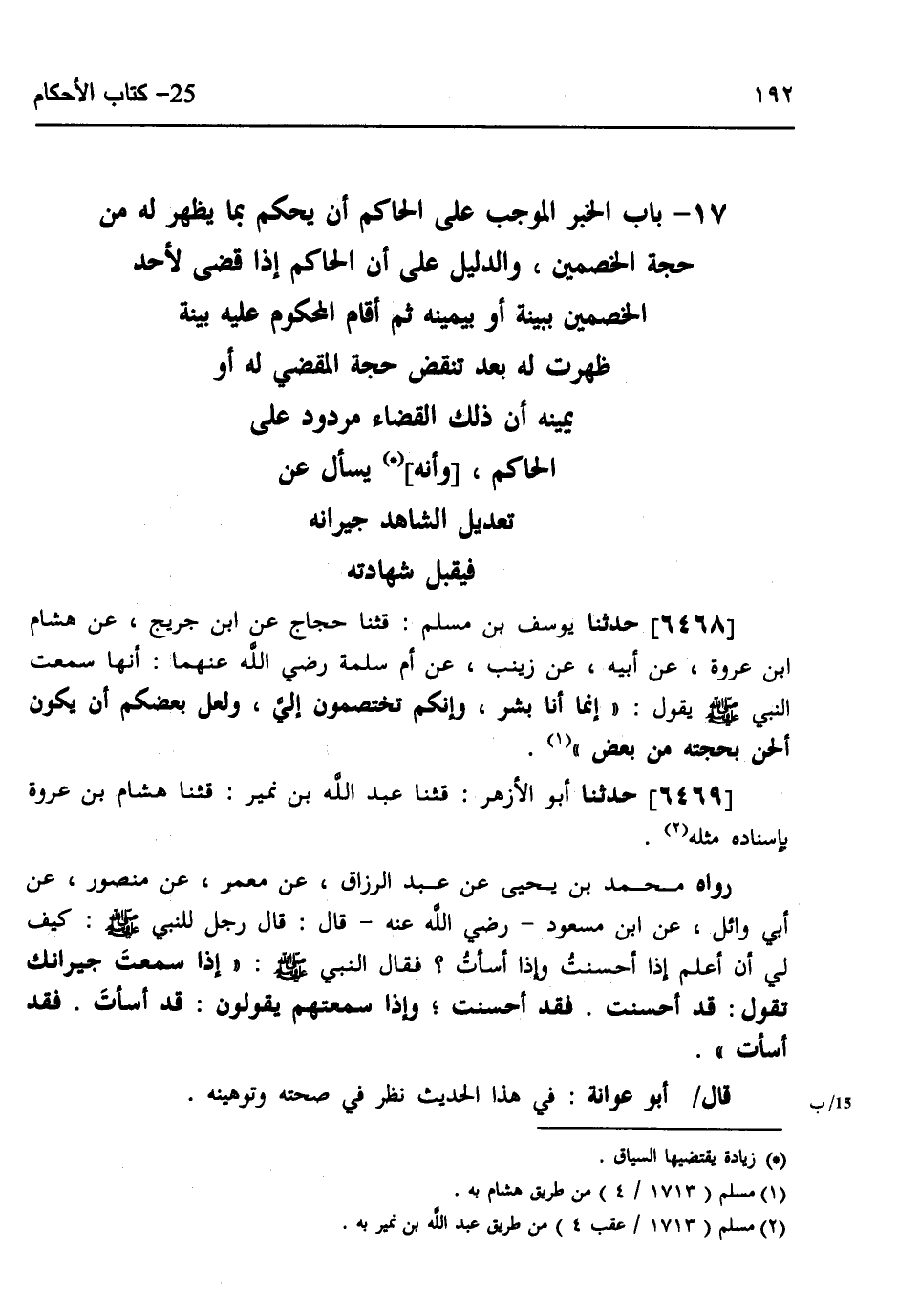 6468 - حَدَّثَنَا يُوسُفُ بْنُ مُسْلِمٍ، قثنا حَجَّاجٌ، عَنِ ابْنِ جُرَيْجٍ، عَنْ هِشَامِ بْنِ عُرْوَةَ، عَنْ أَبِيهِ، عَنْ زَيْنَبَ، عَنْ أُمِّ سَلَمَةَ رَضِيَ اللَّهُ عَنْهُمَا أَنَّهَا سَمِعْتِ النَّبِيَّ صَلَّى اللهُ عَلَيْهِ وَسَلَّمَ يَقُولُ: «§إِنَّمَا أَنَا بِشْرٌ، وَإِنَّكُمْ تَخْتَصِمُونَ إِلَيَّ، وَلَعَلَّ بَعْضَكُمْ أَنْ يَكُونَ أَلْحَنَ بِحُجَّتِهِ مِنْ بَعْضٍ»