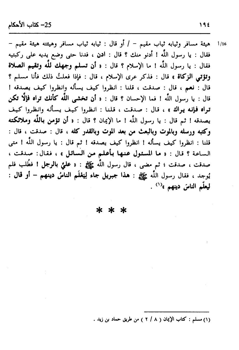 قَالَ : فَإِذَا فَعَلْتُ ذَلِكَ فَأَنَا مُسْلِمٌ ؟ قَالَ : نَعَمْ ، قَالَ : صَدَقْتَ ، قُلْنَا : انْظُرُوا كَيْفَ يسْأَلُهُ ، وَانْظُرُوا كَيْفَ يُصَدِّقُهُ , قَالَ : يَا رَسُولَ اللهِ ، فَمَا الإِحْسَانُ ؟ قَالَ : أَنْ تَخْشَى اللَّهَ كَأَنَّكَ تَرَاهُ ، فَإِلا تَكُنْ تَرَاهُ ، فَإِنَّهُ يَرَاكَ ، قَالَ : صَدَقْتَ ، قُلْنَا : انْظُرُوا كَيْفَ يسْأَلُهُ ، وَانْظُرُوا كَيْفَ يُصَدِّقُهُ , ثُمَّ قَالَ : يَا رَسُولَ اللهِ ، مَا الإِيمَانُ ؟ قَالَ : أَنْ تُؤْمِنَ بِاللَّهِ وَمَلائِكَتِهِ ، وَكُتُبِهِ وَرُسُلِهِ ، وبِالْمَوتِ وَبِالْبَعْثِ مِنْ بَعْدِ الْمَوْتِ ، وَبِالْقَدَرِ كُلِّهِ ، قَالَ : صَدَقْتَ ، قَالَ : قُلْنَا انْظُرُوا كَيْفَ يسْأَلُهُ ، انْظُرُوا كَيْفَ يُصَدِّقُهُ , ثُمَّ قَالَ : يَا رَسُولَ اللهِ ، مَتَى السَّاعَةُ ؟ قَالَ : مَا الْمَسْؤُولُ عَنْهَا بِأَعْلَمَ مِنَ السَّائِلِ ، فَقَالَ : صَدَقْتَ ، صَدَقْتَ ، صَدَقْتَ ، ثُمَّ مَضَى ، قَالَ رَسُولُ اللهِ صَلَّى الله عَلَيهِ وسَلَّم : عَلَيَّ بِالرَّجُلِ ، فَطُلِبَ فَلَمْ يُوجَدْ ، فَقَالَ رَسُولُ اللهِ صَلَّى الله عَلَيهِ وسَلَّم : هَذَا جِبْرِيلُ جَاءَ لِيعْلَمَ النَّاسَ دِينَهُمْ ، أَوْ قَالَ : لِيُعَلِّمَ النَّاسُ دِينَهُمْ.