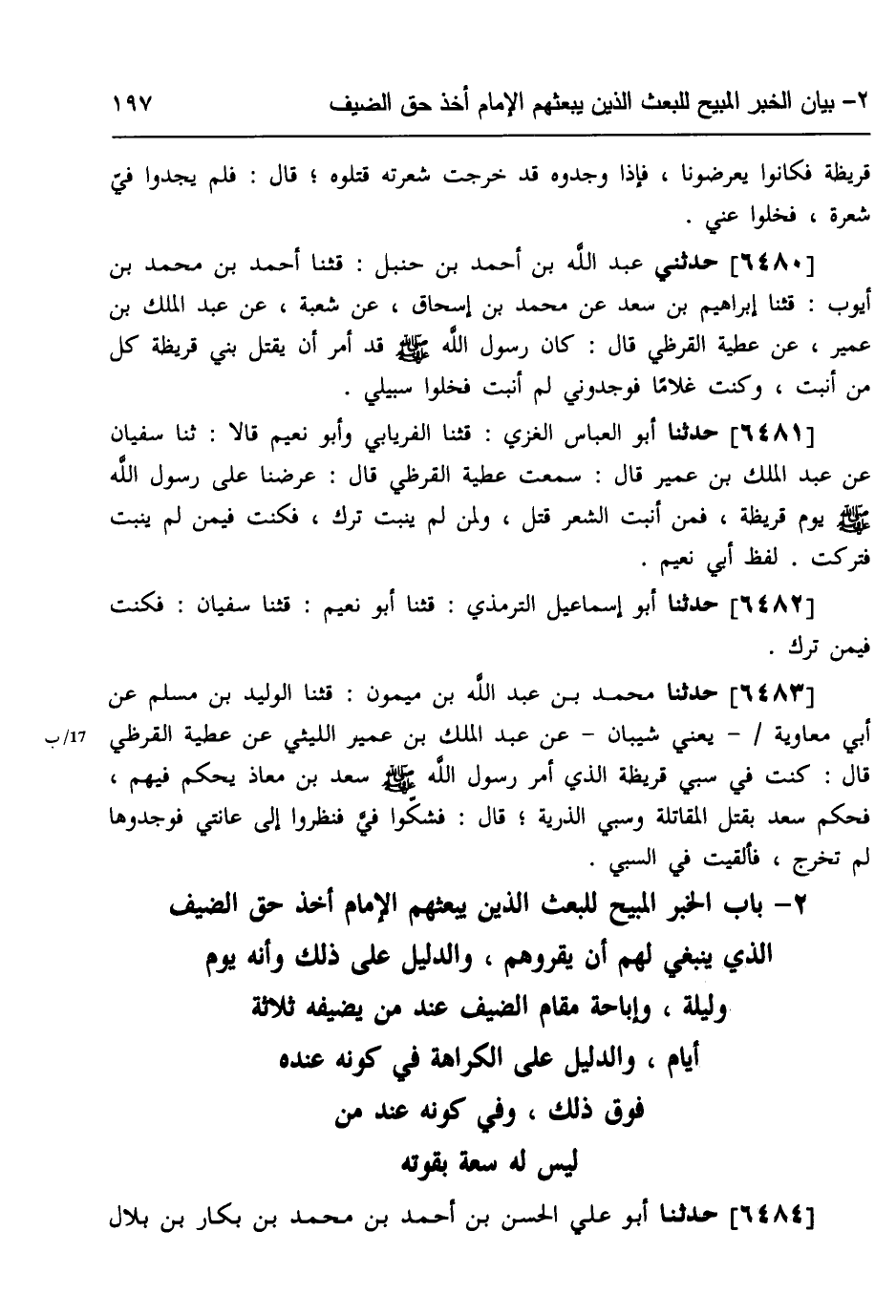 6480 - حَدَّثَنِي عَبْدُ اللَّهِ بْنُ أَحْمَدَ بْنِ حَنْبَلٍ، قثنا أَحْمَدُ بْنُ مُحَمَّدِ بْنِ أَيُّوبَ، قثنا إِبْرَاهِيمُ بْنُ سَعْدٍ، عَنْ مُحَمَّدِ بْنِ إِسْحَاقَ، عَنْ شُعْبَةَ، عَنْ عَبْدِ الْمَلِكِ بْنِ عُمَيْرٍ، عَنْ عَطِيَّةَ الْقُرَظِيِّ، قَالَ: «كَانَ §رَسُولُ اللَّهِ صَلَّى اللهُ عَلَيْهِ وَسَلَّمَ قَدْ أُمِرَ أَنْ يَقْتُلَ بَنِي قُرَيْظَةَ كُلَّ مَنْ أَنْبَتَ وَكُنْتُ غُلَامًا، فَوَجَدُونِي لَمْ أُنْبِتْ فَخَلُّوا سَبِيلِي»