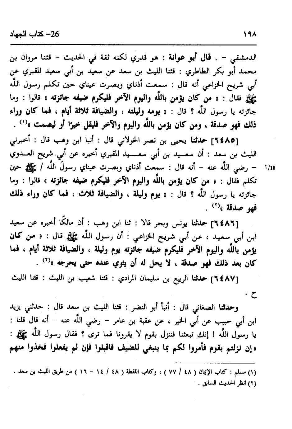 6485 - حَدَّثَنَا يَحْيَى بْنُ نَصْرٍ الْخَوْلَانِيُّ، قَالَ: أَنْبَا ابْنُ وَهْبٍ، قَالَ: أَخْبَرَنِي اللَّيْثُ بْنُ سَعْدٍ، أَنَّ سَعِيدَ بْنَ أَبِي سَعِيدٍ الْمَقْبُرِيَّ، أَخْبَرَهُ عَنْ أَبِي شُرَيْحٍ الْعَدَوِيِّ رَضِيَ اللَّهُ عَنْهُ أَنَّهُ، قَالَ: سَمِعَتْ أُذُنَايَ وَبَصُرَتْ عَيْنَايَ رَسُولَ اللَّهِ صَلَّى اللهُ عَلَيْهِ وَسَلَّمَ حِينَ تَكَلَّمَ، فَقَالَ: «§مَنْ كَانَ يُؤْمِنُ بِاللَّهِ وَالْيَوْمِ الْآخِرِ فَلْيُكْرِمْ ضَيْفَهُ جَائِزَتَهُ» ، قَالُوا: وَمَا جَائِزَتُهُ يَا رَسُولَ اللَّهِ؟، قَالَ: «يَوْمٌ وَلَيْلَةٌ وَالضِّيافَةُ ثَلَاثٌ فَمَا كَانَ وَرَاءَ ذَلِكَ فَهُوَ صَدَقَةٌ»
