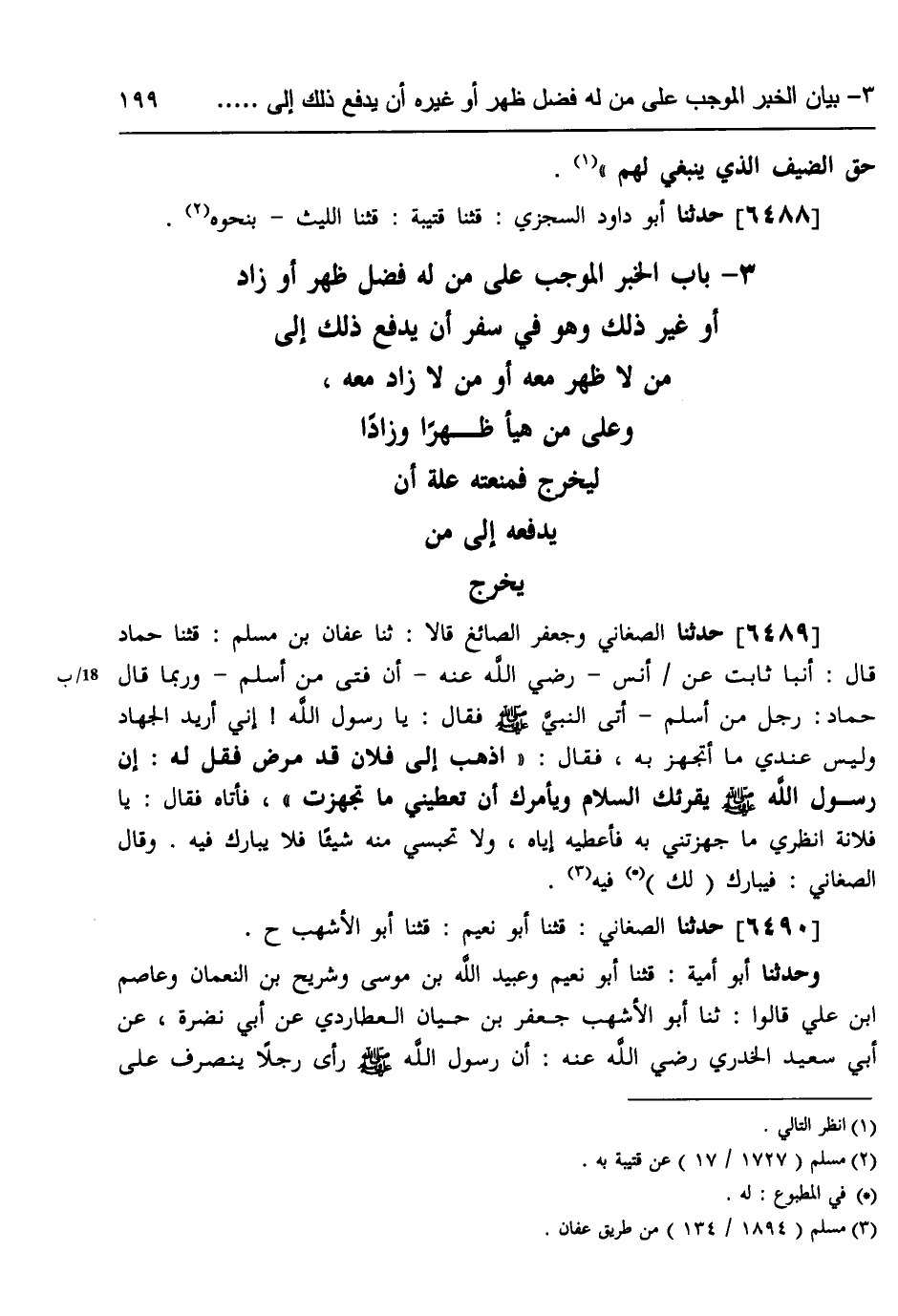 6490 - حَدَّثَنَا الصَّغَانِيُّ، قثنا أَبُو نُعَيْمٍ، قثنا أَبُو الْأَشْهَبِ ح، وَحَدَّثَنَا أَبُو أُمَيَّةَ، قثنا أَبُو نُعَيْمٍ، وَعُبَيْدُ اللَّهِ بْنُ مُوسَى، وَشُرَيْحُ بْنُ النُّعْمَانِ، وَعَاصِمُ بْنُ عَلِيٍّ، قَالُوا: ثنا أَبُو الْأَشْهَبِ جَعْفَرُ بْنُ حَيَّانَ الْعُطَارِدِيُّ، عَنْ أَبِي نَضْرَةَ، عَنْ أَبِي سَعِيدٍ الْخُدْرِيِّ رَضِيَ اللَّهُ عَنْهُ أَنَّ رَسُولَ اللَّهِ صَلَّى اللهُ عَلَيْهِ وَسَلَّمَ رَأَى رَجُلًا ينْصَرِفُ عَلَى -[200]- رَاحِلَتِهِ فِي نَوَاحِي الْقَوْمِ، فَقَالَ يَعْنِي النَّبِيَّ صَلَّى اللهُ عَلَيْهِ وَسَلَّمَ: «§مَنْ كَانَ عِنْدَهُ فَضْلُ ظَهْرٍ فَلْيعُدْ بِهِ عَلَى مَنْ لَا ظَهْرَ لَهُ، وَمَنْ كَانَ عِنْدَهُ فَضْلٌ مِنْ زَادٍ فَلْيعُدْ بِهِ عَلَى مَنْ لَا زَادَ لَهُ» ، فَذَكَرَ مِنَ الْأَصْنَافِ مَا ذَكَرَ، قَالَ أَبُو الْأَشْهَبِ: يَعْنِي الْمَالَ حَتَّى ظَنَنَّا أَنَّهُ لَا حَقَّ لِأَحَدٍ مِنَّا فِي فَضْلٍ