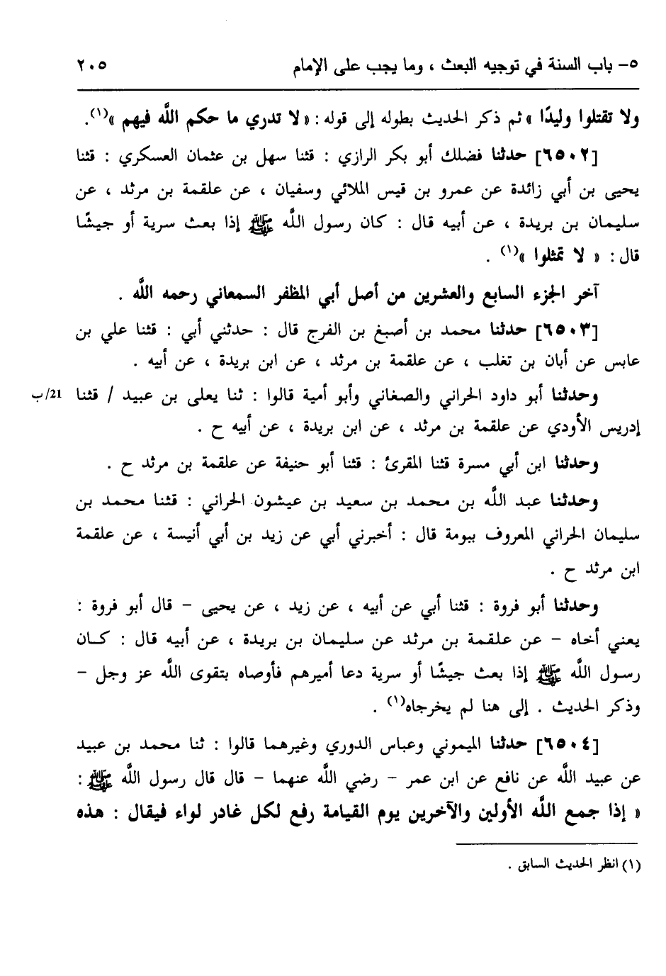 6503 - حَدَّثَنَا مُحَمَّدُ بْنُ أَصْبَغَ بْنِ الْفَرَجِ، قَالَ: حَدَّثَنِي أَبِي، قثنا عَلِيُّ بْنُ عَابِسٍ، عَنْ أَبَانَ بْنِ تَغْلِبٍ، عَنْ عَلْقَمَةَ بْنِ مَرْثَدٍ، عَنْ ابْنِ بُرَيْدَةَ، عَنْ أَبِيهِ، وَحَدَّثَنَا أَبُو دَاوُدَ الْحَرَّانِيُّ، والصَّغَانِيُّ، وَأَبُو أُمَيَّةَ، قَالُوا: ثنا يَعْلَى بْنُ عُبَيْدٍ، قثنا إِدْرِيسُ الْأَوْدِيُّ، عَنْ عَلْقَمَةَ بْنِ مَرْثَدٍ، عَنِ ابْنِ بُرَيْدَةَ، عَنْ أَبِيهِ ح، وَحَدَّثَنَا ابْنُ أَبِي مَسَرَّةَ، قثنا الْمُقْرِئُ، قثنا أَبُو حَنِيفَةَ، عَنْ عَلْقَمَةَ بْنِ مَرْثَدٍ، ح وَحَدَّثَنَا عَبْدُ اللَّهِ بْنُ مُحَمَّدِ بْنِ سَعِيدِ بْنِ عَيْشُونٍ الْحَرَّانِيُّ، قثنا مُحَمَّدُ بْنُ سُلَيْمَانَ الْحَرَّانِيُّ الْمَعْرُوفُ بِبُومَةَ، قَالَ: أَخْبَرَنِي أَبِي، عَنْ زَيْدِ بْنِ أَبِي أُنَيْسَةَ، عَنْ عَلْقَمَةَ بْنِ مَرْثَدٍ، ح وَحَدَّثَنَا أَبُو فَرْوَةَ، قثنا أَبِي، عَنْ أَبِيهِ، عَنْ زَيْدٍ، عَنْ يَحْيَى، قَالَ أَبُو فَرْوَةَ، يَعْنِي أَخَاهُ، عَنْ عَلْقَمَةَ بْنِ مَرْثَدٍ، عَنْ سُلَيْمَانَ بْنِ بُرَيْدَةَ، عَنْ أَبِيهِ، قَالَ: «§كَانَ رَسُولُ اللَّهِ صَلَّى اللهُ عَلَيْهِ وَسَلَّمَ إِذَا بَعَثَ جَيْشًا أَوْ سَرِيَّةً دَعَا أَمِيرَهُمْ فَأَوْصَاهُ بِتَقْوَى اللَّهِ عَزَّ وَجَلَّ» ، وَذَكَرَ الْحَدِيثَ إِلَى هُنَا لَمْ يُخَرِّجَاهُ
