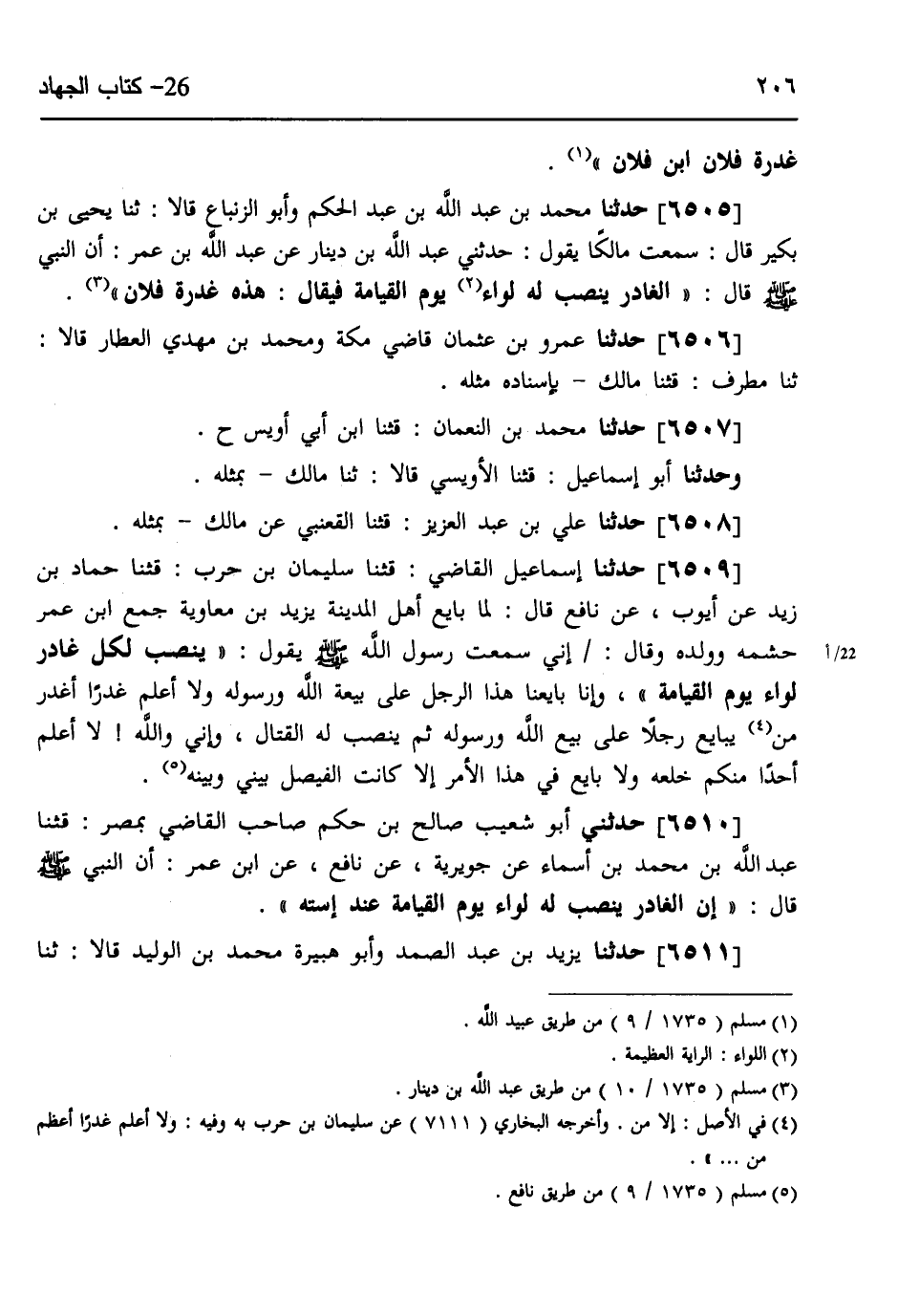 6511 - حَدَّثَنَا يَزِيدُ بْنُ عَبْدِ الصَّمَدِ، وَأَبُو هُبَيْرَةَ مُحَمَّدُ بْنُ الْوَلِيدِ، قَالَا: ثنا -[207]- سَلَامَةُ بْنُ بِشْرٍ، قثنا يَزِيدُ بْنُ السِّمْطِ، عَنِ الْأَوْزَاعِيِّ، عَنْ مَالِكِ بْنِ أَنَسٍ، عَنْ عَبْدِ اللَّهِ بْنِ دِينَارٍ، عَنِ ابْنِ عُمَرَ، أَنَّ النَّبِيَّ صَلَّى اللهُ عَلَيْهِ وَسَلَّمَ، قَالَ: «إِنَّ §الْغَادِرَ يُنْصَبُ لَهُ لِوَاءٌ يَوْمَ الْقِيَامَةِ، فَيُقَالُ هَذِهِ غَدْرَةُ فُلَانٍ» ،