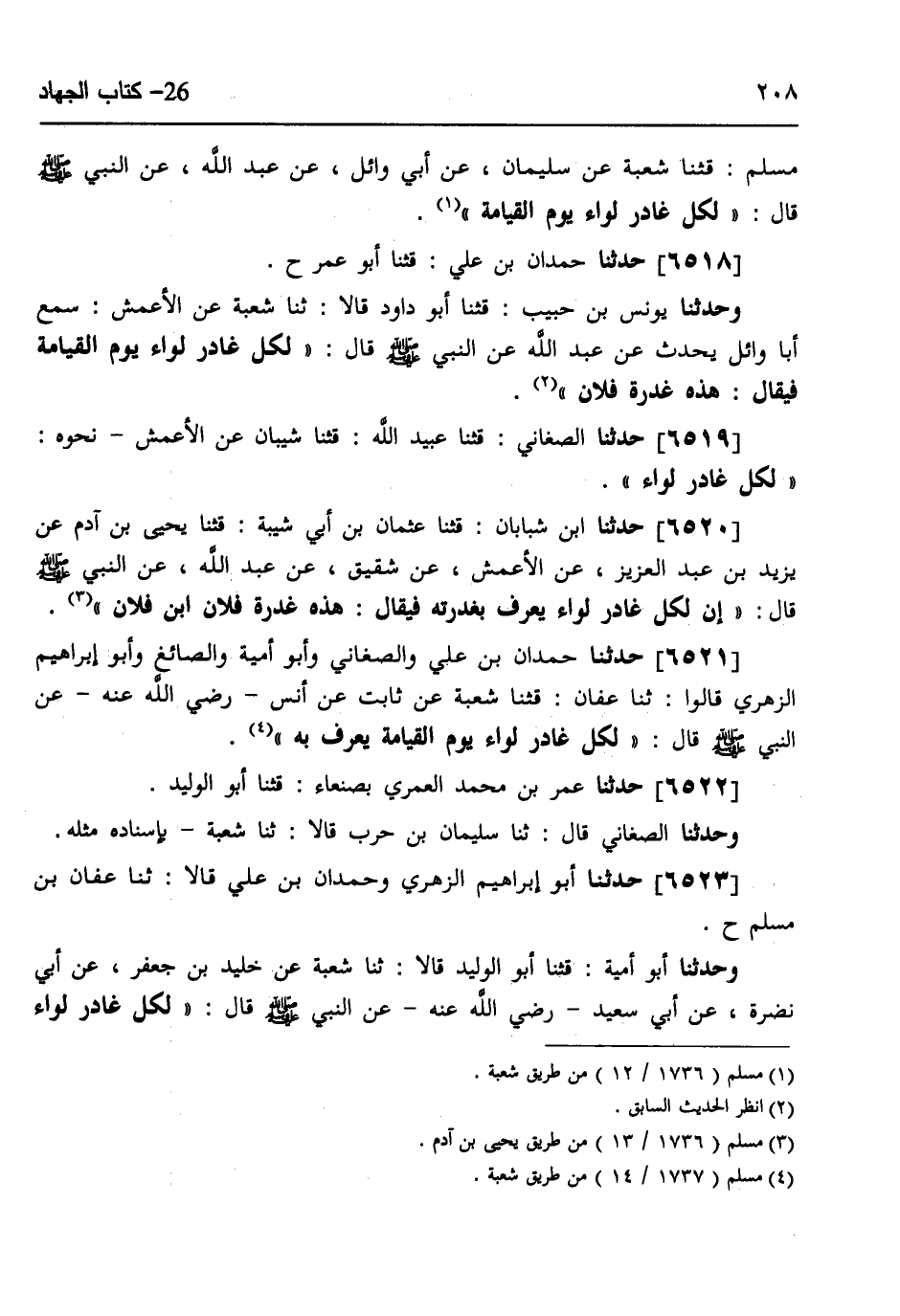 6521 - حَدَّثَنَا حَمْدَانُ بْنُ عَلِيٍّ، والصَّغَانِيُّ، وَأَبُو أُمَيَّةَ، وَالصَّائِغُ، وَأَبُو إِبْرَاهِيمَ الزُّهْرِيُّ، قَالُوا: ثنا عَفَّانُ، قثنا شُعْبَةُ، عَنْ ثَابِتٍ، عَنْ أَنَسٍ، رَضِي اللَّهُ عَنْهُ عَنِ النَّبِيِّ صَلَّى اللهُ عَلَيْهِ وَسَلَّمَ قَالَ: «§لِكُلِّ غَادِرٍ لِوَاءٌ يَوْمَ الْقِيَامَةِ يُعْرَفُ بِهِ» ،