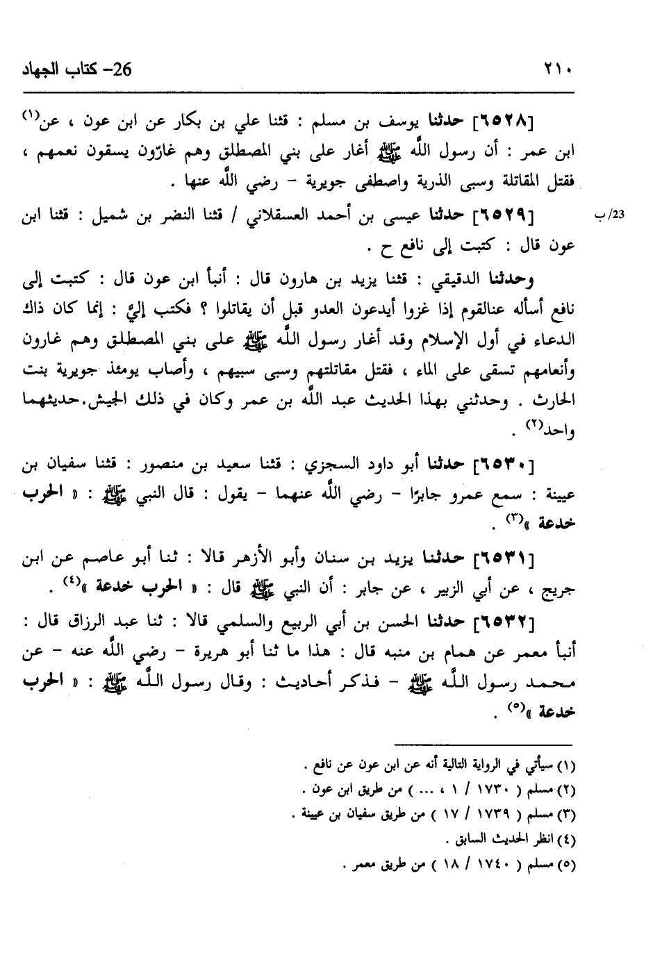 6529 - حَدَّثَنَا عِيسَى بْنُ أَحْمَدَ الْعَسْقَلَانِيُّ، قثنا النَّضْرُ بْنُ شُمَيْلٍ، قثنا ابْنُ عَوْنٍ، قَالَ: كَتَبْتُ إِلَى نَافِعٍ ح، وَحَدَّثَنَا الدَّقِيقِيُّ، قثنا يَزِيدُ بْنُ هَارُونَ، قَالَ: أَنْبَأَ ابْنُ عَوْنٍ، قَالَ: كَتَبْتُ إِلَى نَافِعٍ أَسْأَلُهُ عَنِ الْقَوْمِ إِذَا غَزَوْا أَيَدْعُونَ الْعَدُوَّ قَبْلَ أَنْ يُقَاتِلُوا؟، فَكَتَبَ إِلَيَّ: إِنَّمَا كَانَ ذَاكَ الدُّعَاءُ فِي أَوَّلِ الْإِسْلَامِ وَقَدْ §أَغَارَ رَسُولُ اللَّهِ صَلَّى اللهُ عَلَيْهِ وَسَلَّمَ عَلَى بَنِي الْمُصْطَلِقِ وَهُمْ غَارُّونَ وَأَنْعَامُهُمْ تُسْقَى عَلَى الْمَاءِ، فَقَتَلَ مُقَاتِلَتَهُمْ وَسَبَى سَبْيَهُمْ، وَأَصَابَ يَوْمَئِذٍ جُوَيْرِيَةَ بِنْتَ الْحَارِثِ ". وَحَدَّثَنِي بِهَذَا الْحَدِيثِ عَبْدُ اللَّهِ بْنُ عُمَرَ وَكَانَ فِي ذَلِكَ الْجَيْشِ، حَدِيثُهُمَا وَاحِدٌ