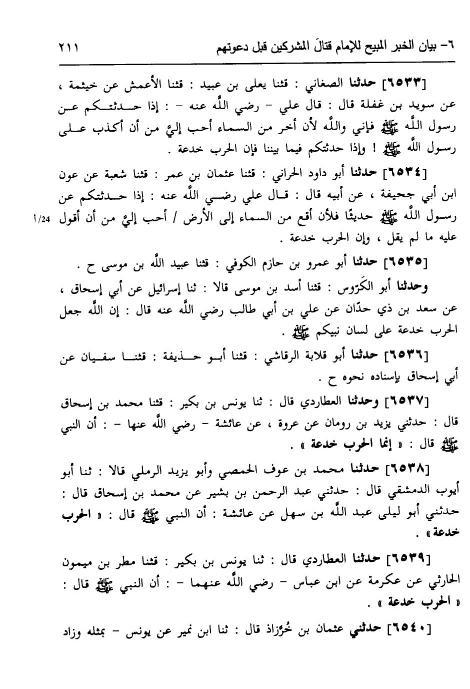 6537 - وَحَدَّثَنَا الْعُطَارِدِيُّ، قَالَ: ثنا يُونُسُ بْنُ بُكَيْرٍ، قثنا مُحَمَّدُ بْنُ إِسْحَاقَ، قَالَ: حَدَّثَنِي يَزِيدُ بْنُ رُومَانَ، عَنْ عُرْوَةَ، عَنْ عَائِشَةَ، رَضِيَ اللَّهُ عَنْهَا أَنَّ النَّبِيَّ صَلَّى اللهُ عَلَيْهِ وَسَلَّمَ، قَالَ: «§إِنَّمَا الْحَرْبُ خُدْعَةٌ»