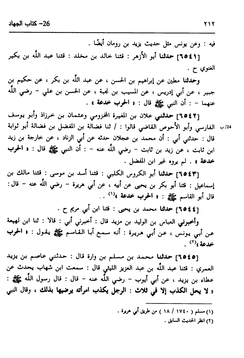 6543 - حَدَّثَنَا أَبُو الكَرَوَّسِ الْكَلْبِيُّ، قثنا أَسَدُ بْنُ مُوسَى، قثنا مَالِكُ بْنُ إِسْمَاعِيلَ، قثنا أَبُو بَكْرِ بْنُ يَحْيَى، عَنْ أَبِيهِ، عَنْ أَبِي هُرَيْرَةَ رَضِيَ اللَّهُ عَنْهُ، قَالَ: قَالَ أَبُو الْقَاسِمِ صَلَّى اللهُ عَلَيْهِ وَسَلَّمَ: «§الْحَرْبُ خُدْعَةٌ»