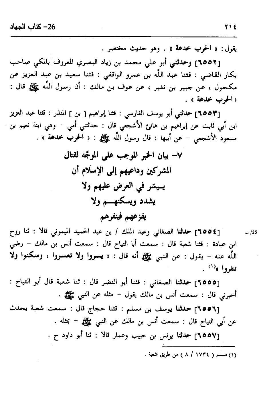 6552 - وَحَدَّثَنِي أَبُو عَلِيٍّ مُحَمَّدُ بْنُ زِيَادٍ الْبَصْرِيُّ الْمَعْرُوفُ بِالْمَكِّيِّ صَاحِبُ بَكَّارٍ الْقَاضِي، قثنا عَبْدُ اللَّهِ بْنُ عَمْرٍو الْوَاقِفِيُّ، قثنا سَعِيدُ بْنُ عَبْدِ الْعَزِيزِ عَنْ مَكْحُولٍ، عَنْ جُبَيْرِ بْنِ نُفَيْرٍ، عَنْ عَوْفِ بْنِ مَالِكٍ، أَنَّ رَسُولَ اللَّهِ صَلَّى اللهُ عَلَيْهِ وَسَلَّمَ قَالَ: «§الْحَرْبُ خُدْعَةٌ»
