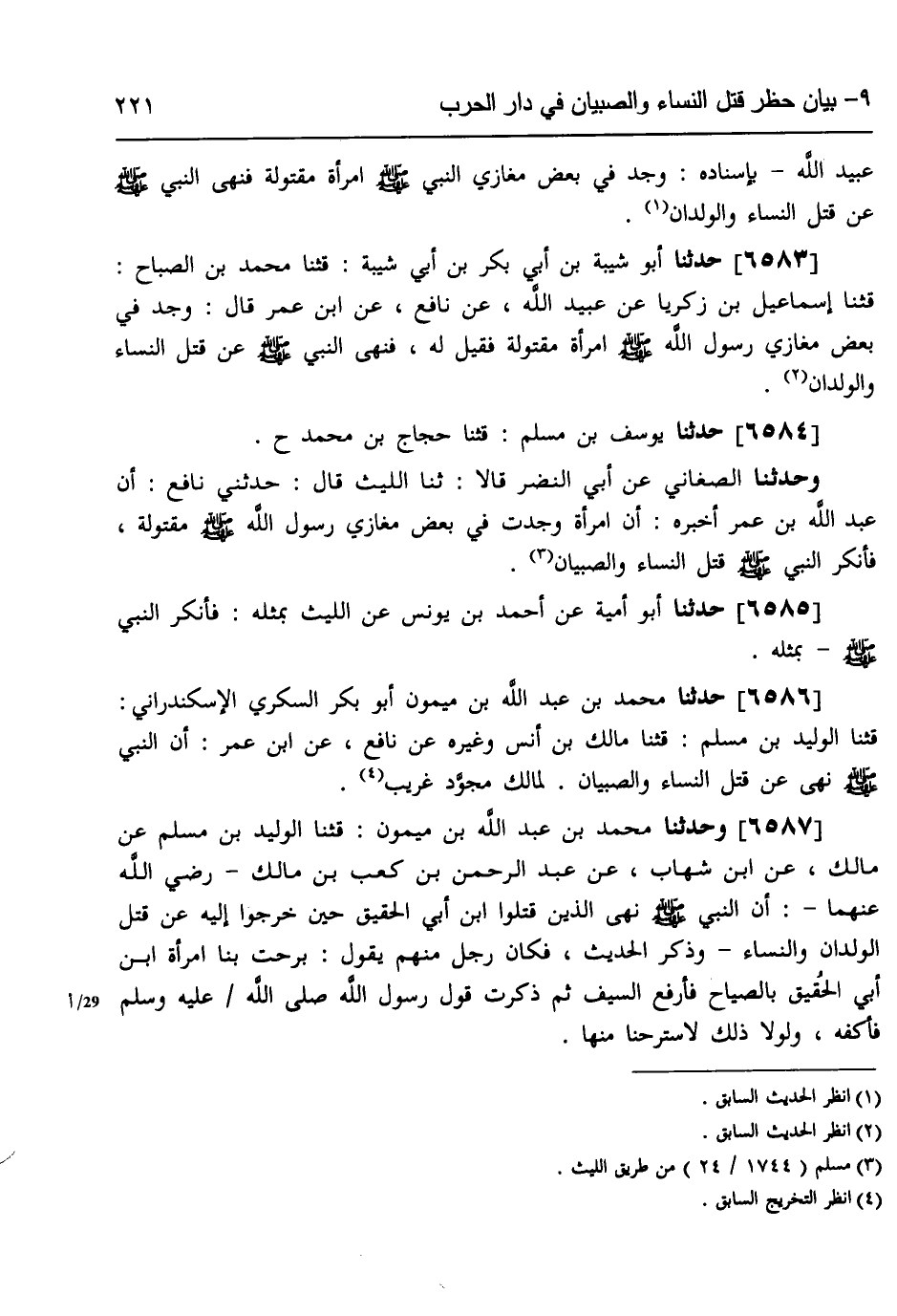 6584 - حَدَّثَنَا يُوسُفُ بْنُ مُسْلِمٍ، قثنا حَجَّاجُ بْنُ مُحَمَّدٍ، ح وَحَدَّثَنَا الصَّغَانِيُّ، عَنْ أَبِي النَّضْرِ، قَالَا: ثنا اللَّيْثُ، قَالَ: حَدَّثَنِي نَافِعٌ، أَنَّ عَبْدَ اللَّهِ بْنَ عُمَرَ، أَخْبَرَهُ: «أَنَّ امْرَأَةً وُجِدَتْ فِي بَعْضِ مَغَازِي رَسُولِ اللَّهِ صَلَّى اللهُ عَلَيْهِ وَسَلَّمَ مَقْتُولَةً، §فَأَنْكَرَ النَّبِيُّ صَلَّى اللهُ عَلَيْهِ وَسَلَّمَ قَتَلَ النِّسَاءِ وَالصِّبْيَانِ» ،