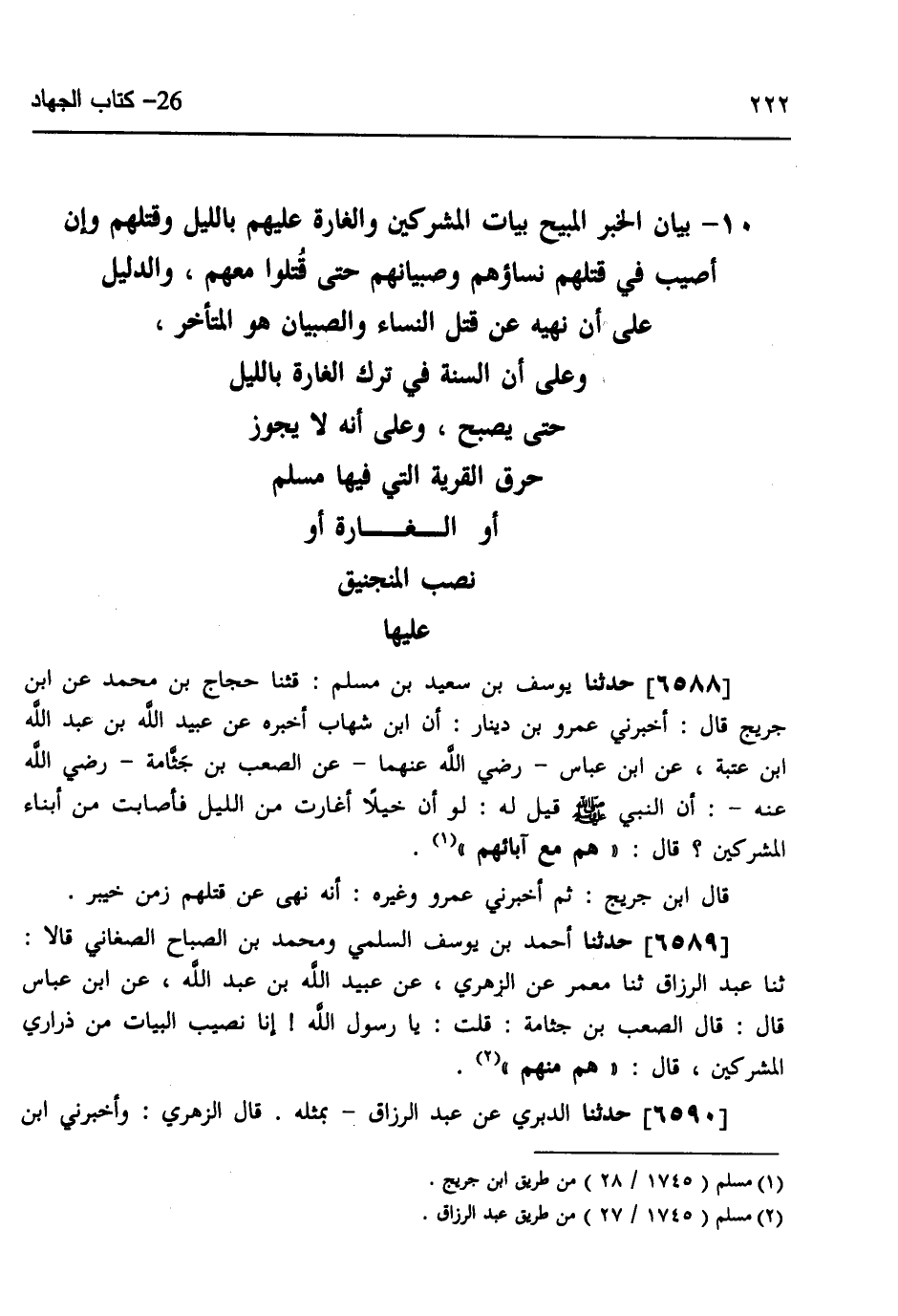 6588 - حَدَّثَنَا يُوسُفُ بْنُ سَعِيدِ بْنِ مُسْلِمٍ، قثنا حَجَّاجُ بْنُ مُحَمَّدٍ، عَنِ ابْنِ جُرَيْجٍ، قَالَ: أَخْبَرَنِي عَمْرُو بْنُ دِينَارٍ، أَنَّ ابْنَ شِهَابٍ، أَخْبَرَهُ، عَنْ عُبَيْدِ اللَّهِ بْنِ عَبْدِ اللَّهِ بْنِ عُتْبَةَ، عَنِ ابْنِ عَبَّاسٍ رَضِيَ اللَّهُ عَنْهُمَا، عَنِ الصَّعْبِ بْنِ جَثَّامَةَ رَضِيَ اللَّهُ عَنْهُ: أَنَّ §النَّبِيَّ صَلَّى اللهُ عَلَيْهِ وَسَلَّمَ قِيلَ لَهُ لَوْ أَنَّ خَيْلًا أَغَارَتْ مِنَ اللَّيْلِ فَأَصَابَتْ مِنْ أَبْنَاءِ الْمُشْرِكِينَ، قَالَ: «هُمْ مَعَ آبَائِهِمْ» ، قَالَ ابْنُ جُرَيْجٍ: ثُمَّ أَخْبَرَنِي عَمْرٌو وَغَيْرُهُ: أَنَّهُ نَهَى عَنْ قَتْلِهِمْ زَمَنَ خَيْبَرَ