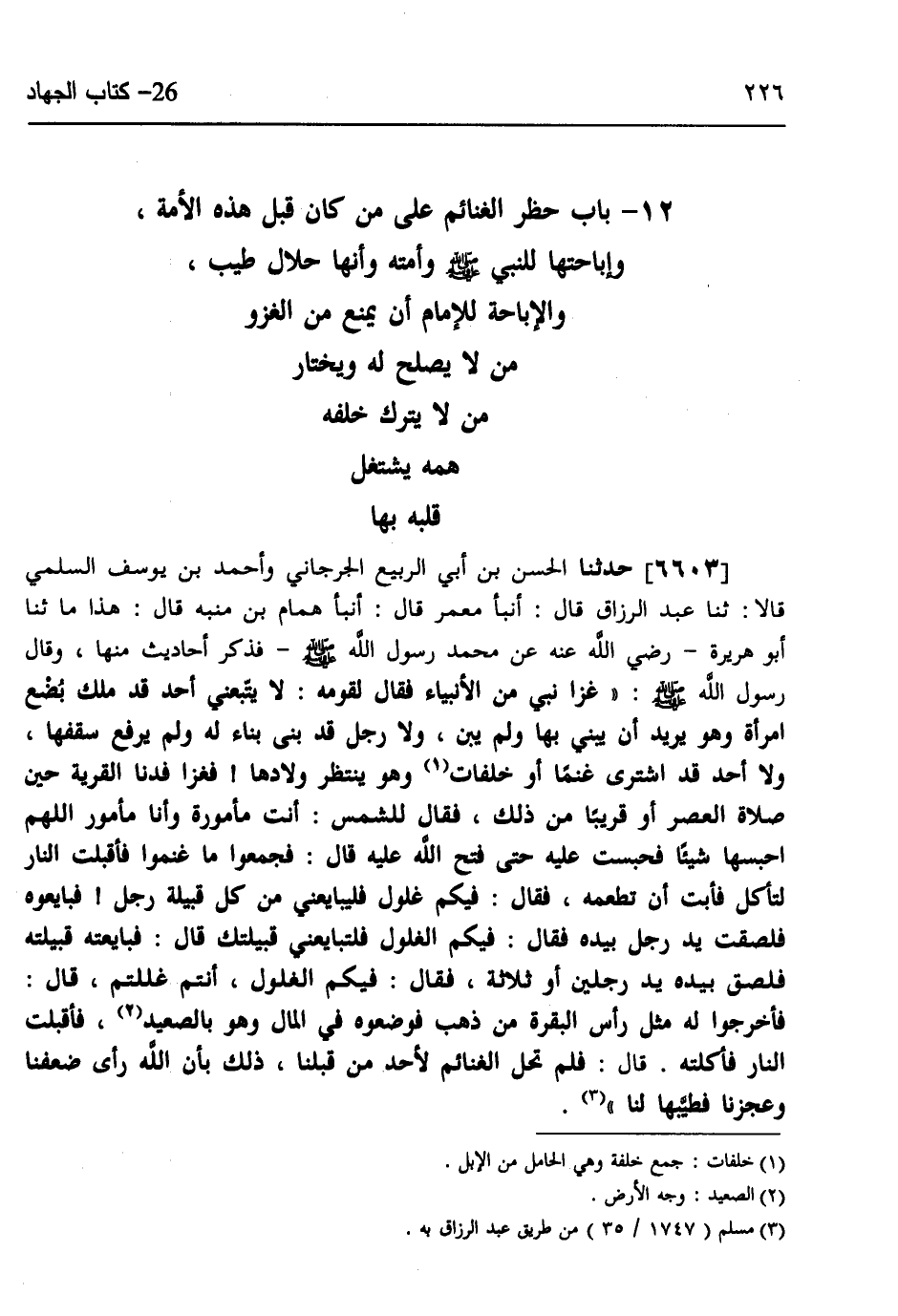 6603 - حَدَّثَنَا الْحَسَنُ بْنُ أَبِي الرَّبِيعِ الْجُرْجَانِيُّ، وَأَحْمَدُ بْنُ يُوسُفَ السُّلَمِيُّ، قَالَا: ثنا عَبْدُ الرَّزَّاقِ، قَالَ: أنبأ مَعْمَرٌ، قَالَ: أنبأ هَمَّامُ بْنُ مُنَبِّهٍ، قَالَ: هَذَا مَا ثنا أَبُو هُرَيْرَةَ رَضِيَ اللَّهُ عَنْهُ، عَنْ مُحَمَّدٍ رَسُولِ اللَّهِ صَلَّى اللهُ عَلَيْهِ وَسَلَّمَ فَذَكَرَ أَحَادِيثَ مِنْهَا، وَقَالَ رَسُولُ اللَّهِ صَلَّى اللهُ عَلَيْهِ وَسَلَّمَ: " §غَزَا نَبِيٌّ مِنَ الْأَنْبِيَاءِ، فَقَالَ لِقَوْمِهِ لَا يَتَّبِعُنِي أَحَدٌ، قَدْ مَلَكَ بِضْعَ امْرَأَةٍ، وَهُوَ يُرِيدُ أَنْ يَبْنِيَ بِهَا، وَلَمْ يَبْنِ، وَلَا رَجُلٌ قَدْ بَنَى بِنَاءً لَهُ، وَلَمْ يَرْفَعْ سُقُفَهَا، وَلَا أَحَدٌ قَدِ اشْتَرَى غَنَمًا أَوْ خَلِفَاتٍ وَهُوَ يَنْتَظِرُ وِلَادَهَا فَغَزَا، فَدَنَا الْقَرْيَةَ حِينَ صَلَاةِ الْعَصْرِ أَوْ قَرِيبًا مِنْ ذَلِكَ، فَقَالَ لِلشَّمْسِ: أَنْتِ مَأْمُورَةٌ، وَأَنَا مَأْمُورٌ، اللَّهُمَّ احْبِسْهَا شَيْئًا، فَحُبِسَتْ عَلَيْهِ حَتَّى فَتْحَ اللَّهُ عَلَيْهِ، قَالَ: فَجَمَعُوا مَا غَنِمُوا فَأَقْبَلَتِ النَّارُ لَتَأْكُلَ فَأَبَتْ أَنْ تَطْعَمَهُ، فَقَالَ: فِيكُمْ غُلُولٌ فَلْيُبَايِعْنِي مِنْ كُلِّ قَبِيلَةٍ رَجُلٌ فَبَايَعُوهُ، فَلَصِقَتْ يَدُ رَجُلٍ بِيَدِهِ، فَقَالَ: فِيكُمُ الْغُلُولُ فَلْتُبَايِعْنِي قَبِيلَتُكَ، قَالَ: فَبَايَعَتْهُ قَبِيلَتُهُ فَلَصِقَ بِيَدِهِ يَدُ رَجُلَيْنِ أَوْ ثَلَاثَةٍ، فَقَالَ: فِيكُمُ الْغُلُولُ أَنْتُمْ غَلَلْتُمْ، قَالَ: فَأَخْرَجُوا لَهُ مِثْلَ رَأْسِ الْبَقَرَةِ مِنْ ذَهَبٍ، فَوَضَعُوهُ فِي الْمَالِ وَهُوَ بِالصَّعِيدِ، فَأَقْبَلَتِ النَّارُ فَأَكَلَتْهُ، قَالَ: «فَلَمْ تَحِلَّ الْغَنَائِمُ لِأَحَدٍ مِنْ قَبْلِنَا ذَلِكَ بِأَنَّ اللَّهَ رَأَى ضَعْفَنَا وَعَجْزَنَا فَطَيَّبَهَا لَنَا»