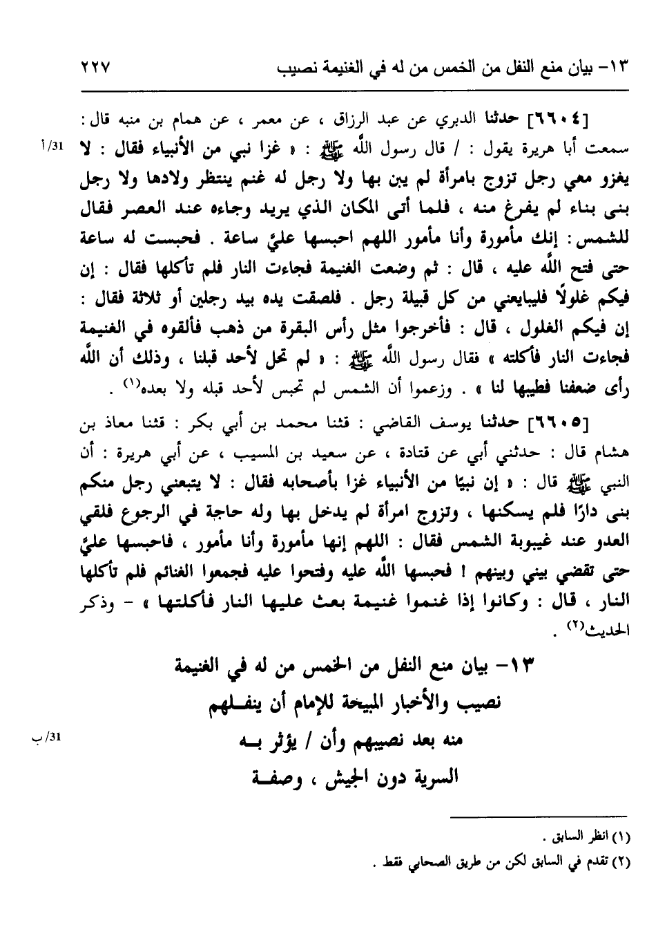 6604 - حَدَّثَنَا الدَّبَرِيُّ، عَنْ عَبْدِ الرَّزَّاقِ، عَنْ مَعْمَرٍ، عَنْ هَمَّامِ بْنِ مُنَبِّهٍ، قَالَ: سَمِعْتُ أَبَا هُرَيْرَةَ، يَقُولُ: قَالَ رَسُولُ اللَّهِ صَلَّى اللهُ عَلَيْهِ وَسَلَّمَ: " §غَزَا نَبِيٌّ مِنَ الْأَنْبِيَاءِ، فَقَالَ: لَا يَغْزُو مَعِي رَجُلٌ تَزَوَّجَ بِامْرَأَةٍ لَمْ يَبْنِ بِهَا، وَلَا رَجُلٌ لَهُ غَنْمٌ يَنْتَظِرُ وِلَادَهَا، وَلَا رَجُلٌ بَنَى بِنَاءً لَمْ يَفْرُغْ مِنْهُ، فَلَمَّا أَتَى الْمَكَانَ الَّذِي يُرِيدُ وَجَاءَهُ عِنْدَ الْعَصْرِ، فَقَالَ لِلشَّمْسِ: إِنَّكِ مَأْمُورَةٌ وَأَنَا مَأْمُورٌ، اللَّهُمَّ احْبِسْهَا عَلَيَّ سَاعَةً، فَحُبِسَتْ لَهُ سَاعَةً حَتَّى فَتَحَ اللَّهُ عَلَيْهِ، قَالَ: ثُمَّ وُضِعَتِ الْغَنِيمَةُ، فَجَاءَتِ النَّارُ فَلَمْ تَأْكُلْهَا، فَقَالَ: إِنَّ فِيكُمْ غُلُولًا فَلْيُبَايِعْنِي مِنْ كُلِّ قَبِيلَةٍ رَجُلٌ، فَلَصِقَتْ يَدُهُ بِيَدِ رَجُلَيْنِ أَوْ ثَلَاثَةٍ، فَقَالَ: إِنَّ فِيكُمُ الْغُلُولَ، قَالَ: فَأَخْرَجُوا مِثْلَ رَأْسِ الْبَقَرَةِ مِنْ ذَهَبٍ فَأَلْقُوهُ فِي الْغَنِيمَةِ فَجَاءَتِ النَّارُ فَأَكَلَتْهُ، فَقَالَ رَسُولُ اللَّهِ صَلَّى اللهُ عَلَيْهِ وَسَلَّمَ: «لَمْ تَحِلَّ لِأَحَدٍ قَبْلَنَا وَذَلِكَ أَنَّ اللَّهَ رَأَى ضَعْفَنَا فَطَيَّبَهَا لَنَا» ، وَزَعَمُوا أَنَّ الشَّمْسَ لَمْ تُحْبَسْ لِأَحَدٍ قَبْلَهُ وَلَا بَعْدَهُ