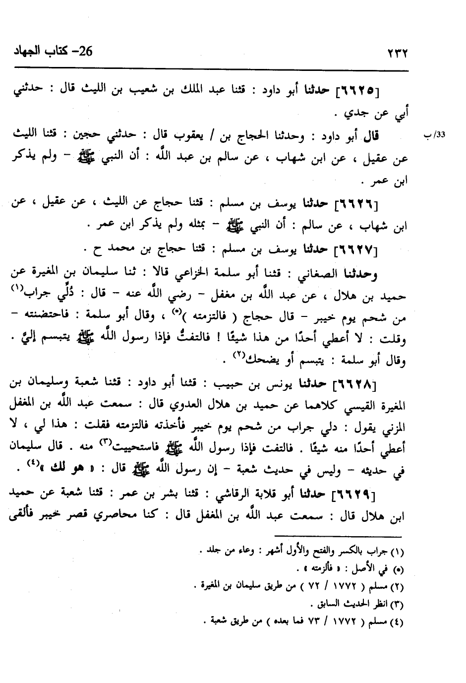 6627 - حَدَّثَنَا يُوسُفُ بْنُ مُسْلِمٍ، قثنا حَجَّاجُ بْنُ مُحَمَّدٍ، ح وَحَدَّثَنَا الصَّغَانِيُّ، قثنا أَبُو سَلَمَةَ الْخُزَاعِيُّ، قَالَا: ثنا سُلَيْمَانُ بْنُ الْمُغِيرَةِ، عَنْ حُمَيْدِ بْنِ هِلَالٍ، عَنْ عَبْدِ اللَّهِ بْنِ مُغَفَّلٍ رَضِيَ اللَّهُ عَنْهُ، قَالَ: " §دُلِّيَ جِرَابٌ مِنْ شَحْمٍ يَوْمَ خَيْبَرَ، قَالَ حَجَّاجٌ: فَالْتَزَمْتُهُ، وَقَالَ أَبُو سَلَمَةَ: فَاحْتَضَنْتُهُ، وَقُلْتُ: لَا أُعْطِي أَحَدًا مِنْ هَذَا شَيْئًا فَالْتَفَتُّ فَإِذَا رَسُولُ اللَّهِ صَلَّى اللهُ عَلَيْهِ وَسَلَّمَ يَتَبَسَّمُ إِلَيَّ. وَقَالَ أَبُو سَلَمَةَ: يَتَبَسَّمُ أَوْ يَضْحَكُ