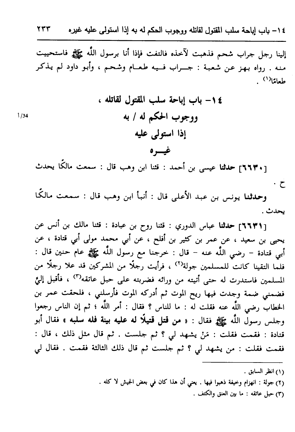 6631 - حَدَّثَنَا عَبَّاسٌ الدُّورِيُّ، قثنا رَوْحُ بْنُ عُبَادَةَ، قثنا مَالِكُ بْنُ أَنَسٍ، عَنْ يَحْيَى بْنِ سَعِيدٍ، عَنْ عُمَرَ بْنِ كَثِيرِ بْنِ أَفْلَحَ، عَنْ أَبِي مُحَمَّدٍ، مَوْلَى أَبِي قَتَادَةَ، عَنْ أَبِي قَتَادَةَ رَضِيَ اللَّهُ عَنْهُ، قَالَ: §خَرَجْنَا مَعَ رَسُولِ اللَّهِ صَلَّى اللهُ عَلَيْهِ وَسَلَّمَ عَامَ حُنَيْنٍ، قَالَ: فَلَمَّا الْتَقَيْنَا كَانَتْ لِلْمُسْلِمِينَ جَوْلَةٌ، فَرَأَيْتُ رَجُلًا مِنَ الْمُشْرِكِينَ قَدْ عَلَا رَجُلًا مِنَ الْمُسْلِمِينَ فَاسْتَدَرْتُ لَهُ حَتَّى أَتَيْتُهُ مِنْ وَرَائِهِ، فَضَرَبْتُهُ عَلَى حَبْلِ عَاتِقِهِ فَأَقْبَلَ إِلَيَّ، فَضَمَّنِي ضَمَّةً، وَجَدْتُ فِيهَا رِيحَ الْمَوْتِ، ثُمَّ أَدْرَكَهُ الْمَوْتُ، فَأَرْسَلَنِي فَلَحِقْتُ عُمَرَ بْنَ الْخَطَّابِ رَضِيَ اللَّهُ عَنْهُ، فَقُلْتُ لَهُ: مَا لِلنَّاسِ؟، فَقَالَ: أَمْرُ اللَّهِ، ثُمَّ إِنَّ النَّاسَ رَجَعُوا وَجَلَسَ رَسُولُ اللَّهِ صَلَّى اللهُ عَلَيْهِ وَسَلَّمَ، فَقَالَ: «مَنْ قَتَلَ قَتِيلًا لَهُ عَلَيْهِ بَيِّنَةٌ فَلَهُ سَلَبُهُ» ، فَقَالَ أَبُو قَتَادَةَ: فَقُمْتُ فَقُلْتُ: مَنْ يَشْهَدُ لِي؟، ثُمَّ جَلَسْتُ، ثُمَّ قَالَ مِثْلَ ذَلِكَ، قَالَ: فَقُمْتُ فَقُلْتُ: مَنْ يَشْهَدُ لِي، ثُمَّ جَلَسْتُ، ثُمَّ قَالَ ذَلِكَ الثَّالِثَةَ، فَقُمْتُ فَقَالَ لِي -[234]- رَسُولُ اللَّهِ صَلَّى اللهُ عَلَيْهِ وَسَلَّمَ: «مَا لَكَ يَا أَبَا قَتَادَةَ؟» ، فَقَصَصْتُ عَلَيْهِ الْقِصَّةَ، فَقَالَ رَجُلٌ مِنَ الْقَوْمِ: صَدَقَ يَا رَسُولَ اللَّهِ وَسَلَبُ ذَلِكَ الْقَتِيلِ عِنْدِي فَأَرْضِهِ مِنْ حَقِّهِ، فَقَالَ أَبُو بَكْرٍ رَضِيَ اللَّهُ عَنْهُ: لَاهَا اللهِ إِذًا لَا يَعْمِدُ إِلَى أَسَدٍ مِنْ أُسْدِ اللَّهِ يُقَاتِلُ عَنِ اللَّهِ وَعَنْ رَسُولِهِ فَيُعْطِيَكَ سَلَبَهُ، فَقَالَ رَسُولُ اللَّهِ صَلَّى اللهُ عَلَيْهِ وَسَلَّمَ: «صَدَقَ أَعْطِهِ إِيَّاهُ» ، فَأَعْطَانِي، فَبِعْتُ الدِّرْعَ، فَابْتَعْتُ بِهِ مَخْرَفًا فِي بَنِي سَلَمَةَ، فَإِنَّهُ لَأَوَّلُ مَالٍ تَأَثَّلْتُهُ فِي الْإِسْلَامِ،