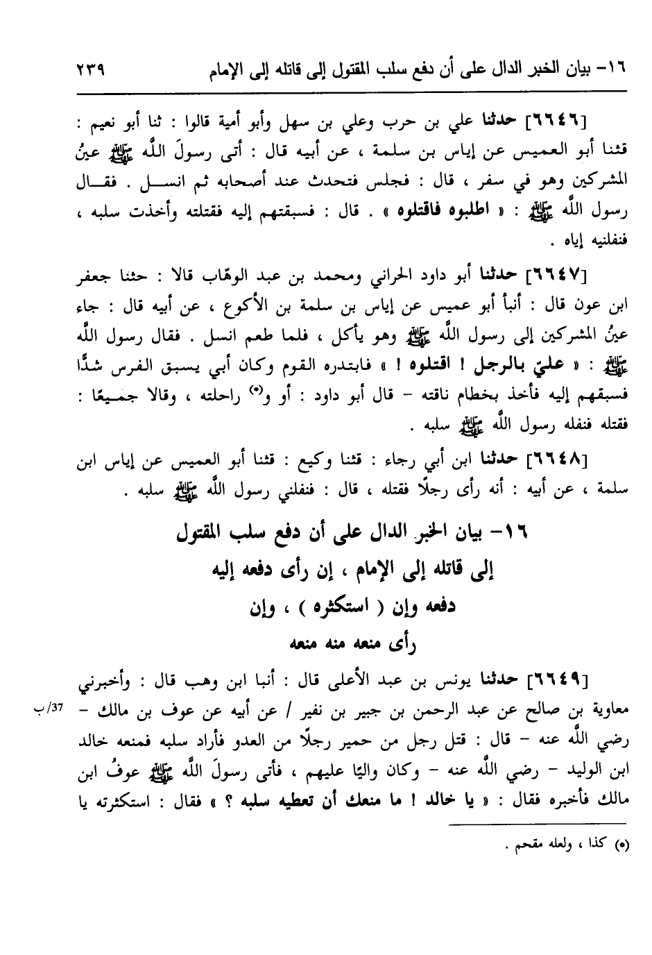 6648 - حَدَّثَنَا ابْنُ أَبِي رَجَاءٍ، قثنا وَكِيعٌ، قثنا أَبُو الْعُمَيْسِ، عَنْ إِيَاسِ بْنِ سَلَمَةَ، عَنْ أَبِيهِ، أَنَّهُ §رَأَى رَجُلًا فَقَتَلَهُ، قَالَ: «فَنَفَّلَنِي رَسُولُ اللَّهِ صَلَّى اللهُ عَلَيْهِ وَسَلَّمَ سَلَبَهُ»