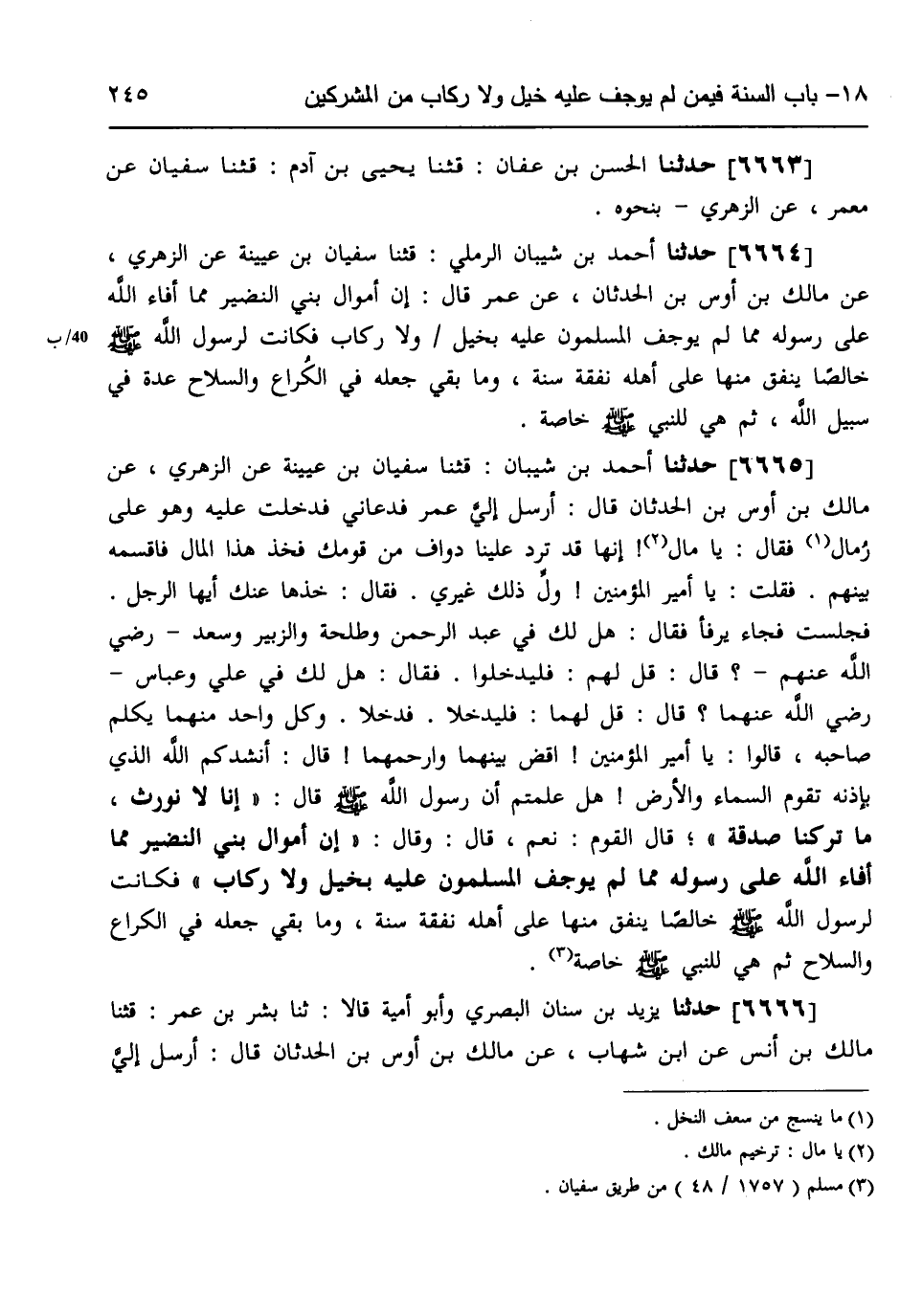 6664 - حَدَّثَنَا أَحْمَدُ بْنُ شَيْبَانَ الرَّمْلِيُّ، قثنا سُفْيَانُ بْنُ عُيَيْنَةَ، عَنِ الزُّهْرِيِّ، عَنْ مَالِكِ بْنِ أَوْسِ بْنِ الْحَدَثَانِ، عَنْ عُمَرَ، قَالَ: «إِنَّ §أَمْوَالَ بَنِي النَّضِيرِ مِمَّا أَفَاءَ اللَّهُ عَلَى رَسُولِهِ مِمَّا لَمْ يُوجِفِ الْمُسْلِمُونَ عَلَيْهِ بِخَيْلٍ وَلَا رِكَابٍ، فَكَانَتْ لِرَسُولِ اللَّهِ صَلَّى اللهُ عَلَيْهِ وَسَلَّمَ خَالِصًا يُنْفِقُ مِنْهَا عَلَى أَهْلِهِ نَفَقَةَ سَنَةٍ وَمَا بَقِيَ جَعَلَهُ فِي الْكُرَاعِ وَالسِّلَاحِ عِدَّةً فِي سَبِيلِ اللَّهِ، ثُمَّ هِيَ لِلنَّبِيِّ صَلَّى اللهُ عَلَيْهِ وَسَلَّمَ خَاصَّةً»