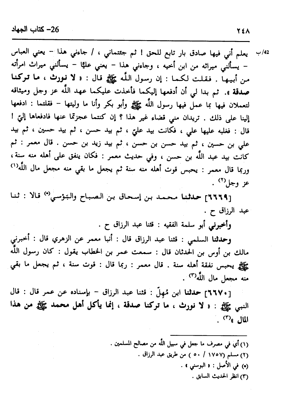 6670 - حَدَّثَنَا ابْنُ مُهِلٍّ، قثنا عَبْدُ الرَّزَّاقِ، بِإِسْنَادِهِ، عَنْ عُمَرَ، قَالَ: قَالَ النَّبِيُّ صَلَّى اللهُ عَلَيْهِ وَسَلَّمَ: " §لَا نُورَثُ، مَا تَرَكْنَا صَدَقَةٌ، إِنَّمَا يَأْكُلُ أَهْلُ مُحَمَّدٍ صَلَّى اللهُ عَلَيْهِ وَسَلَّمَ مِنْ هَذَا الْمَالِ -[249]- مِنْ هُنَا لَمْ يُخَرِّجَاهُ: