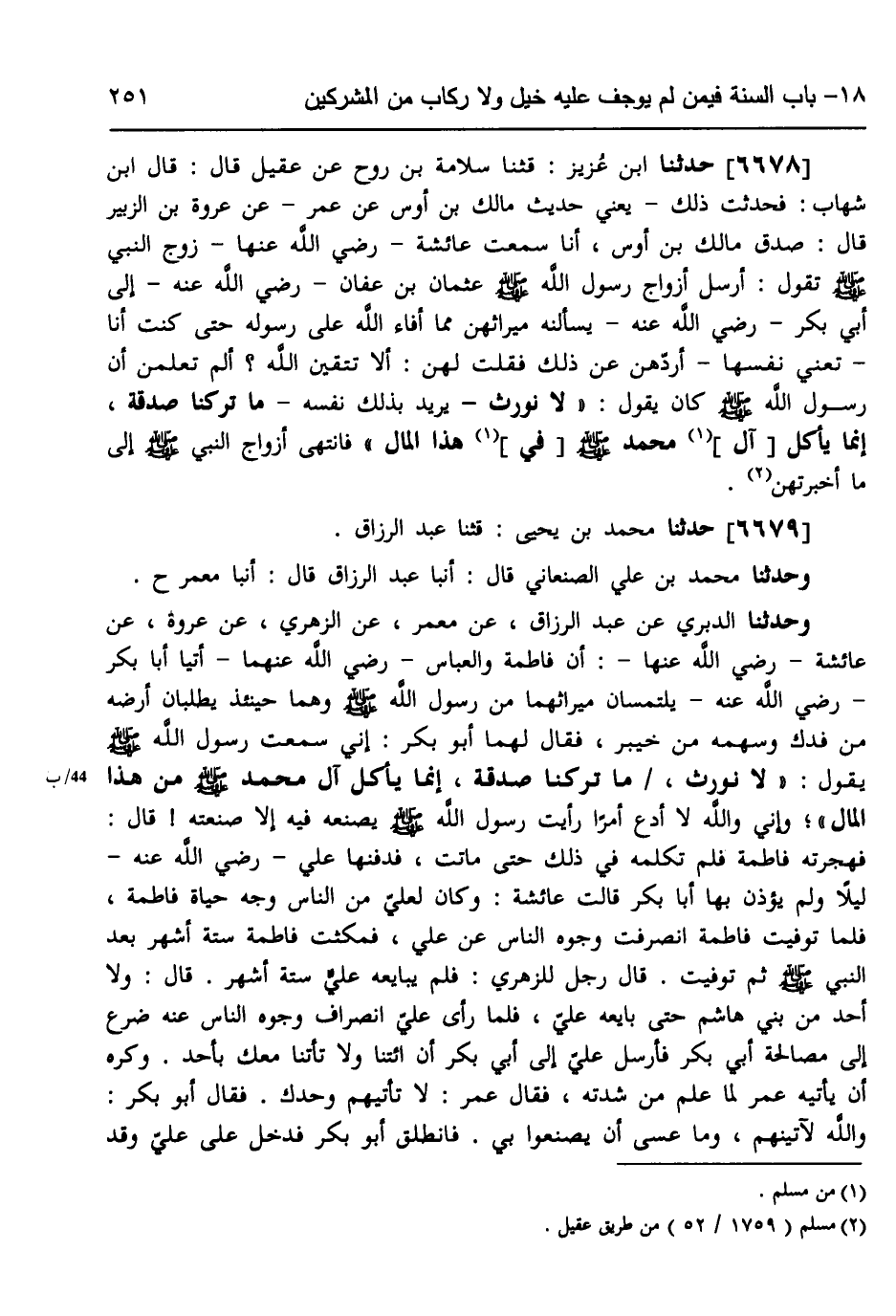 6679 - حَدَّثَنَا مُحَمَّدُ بْنُ يَحْيَى، قثنا عَبْدُ الرَّزَّاقِ، وَحَدَّثَنَا مُحَمَّدُ بْنُ عَلِيٍّ الصَّنْعَانِيُّ، قَالَ: أَنْبَا عَبْدُ الرَّزَّاقِ، قَالَ: أَنْبَا مَعْمَرٌ، ح وَحَدَّثَنَا الدَّبَرِيُّ، عَنْ عَبْدِ الرَّزَّاقِ، عَنْ مَعْمَرٍ، عَنِ الزُّهْرِيِّ، عَنْ عُرْوَةَ، عَنْ عَائِشَةَ، رَضِيَ اللَّهُ عَنْهَا أَنَّ فَاطِمَةَ، وَالْعَبَّاسَ رَضِيَ اللَّهُ عَنْهُمَا أَتَيَا أَبَا بَكْرٍ رَضِيَ اللَّهُ عَنْهُ يَلْتَمِسَانِ مِيرَاثَهُمَا مِنْ رَسُولِ اللَّهِ صَلَّى اللهُ عَلَيْهِ وَسَلَّمَ، وَهُمَا حِينَئِذٍ يَطْلُبَانِ أَرْضَهُ مِنْ فَدَكَ، وَسَهْمَهُ مِنْ خَيْبَرَ، فَقَالَ لَهُمَا أَبُو بَكْرٍ: إِنِّي سَمِعْتُ رَسُولَ اللَّهِ صَلَّى اللهُ عَلَيْهِ وَسَلَّمَ يَقُولُ: «§لَا نُوَرَّثُ، مَا تَرَكْنَا صَدَقَةٌ، إِنَّمَا يَأْكُلُ آلُ مُحَمَّدٍ صَلَّى اللهُ عَلَيْهِ وَسَلَّمَ مِنْ هَذَا الْمَالِ» ، وَإِنِّي وَاللَّهِ لَا أَدَعُ أَمْرًا رَأَيْتُ رَسُولَ اللَّهِ صَلَّى اللهُ عَلَيْهِ وَسَلَّمَ يَصْنَعُهُ فِيهِ إِلَّا صَنَعْتُهُ، قَالَ: فَهَجَرَتْهُ فَاطِمَةُ فَلَمْ تُكَلِّمُهُ فِي ذَلِكَ حَتَّى مَاتَتْ، فَدَفَنَهَا عَلِيٌّ رَضِيَ اللَّهُ عَنْهُ لَيْلًا وَلَمْ يؤَذِّنْ بِهَا أَبَا بَكْرٍ، قَالَتْ عَائِشَةُ: وَكَانَ لِعَلِيٍّ مِنَ النَّاسِ وَجْهُ حَيَاةِ فَاطِمَةَ، فَلَمَّا تُوُفِّيَتْ فَاطِمَةُ انْصَرَفَتْ وجُوهُ النَّاسِ عَنْ عَلِيٍّ، فَمَكَثَتْ فَاطِمَةُ سِتَّةَ أَشْهُرٍ بَعْدَ النَّبِيِّ صَلَّى اللهُ عَلَيْهِ وَسَلَّمَ ثُمَّ تُوُفِّيَتْ، قَالَ رَجُلٌ لِلزُّهْرِيِّ: فَلَمْ يُبَايِعْهُ عَلِيٌّ سِتَّةَ أَشْهُرٍ، قَالَ: وَلَا أَحَدٌ مِنْ بَنِي هَاشِمٍ، حَتَّى بَايَعَهُ عَلِيٌّ فَلَمَّا رَأَى عَلِيٌّ انْصِرَافَ وجُوهِ النَّاسِ عَنْهُ ضَرَعَ إِلَى مُصَالَحَةِ أَبِي بَكْرٍ، فَأَرْسَلَ عَلِيٌّ إِلَى أَبِي بَكْرٍ أَنِ ائْتِنَا وَلَا تَأْتِنَا مَعَكَ بِأَحَدٍ، وَكَرِهَ أَنْ يَأْتِيَهُ عُمَرُ لِمَا عَلِمَ مِنْ شِدَّتِهِ، فَقَالَ عُمَرُ: لَا تَأْتِيهِمْ وَحْدَكَ، فَقَالَ أَبُو بَكْرٍ: وَاللَّهِ لَآتِيَنَّهُمْ، وَمَا عَسَى أَنْ يَصْنَعُوا بِي، فَانْطَلَقَ أَبُو بَكْرٍ فَدَخَلَ عَلَى عَلِيٍّ وَقَدْ -[252]- جَمَعَ بَنِي هَاشِمٍ عِنْدَهُ، فَقَامَ عَلِيٌّ فَحَمِدَ اللَّهَ وَأَثْنَى عَلَيْهِ بِمَا هُوَ أَهْلُهُ، ثُمَّ قَالَ: أَمَا بَعْدُ فَإِنَّهُ لَمْ يَمْنَعْنَا أَنْ نُبَايِعَكَ يَا أَبَا بَكْرٍ إِنْكَارًا لِفَضِيلَتِكَ، وَلَا نَفَاسَةً عَلَيْكَ لَخَيْرٍ سَاقَهُ اللَّهُ إِلَيْكَ، وَلَكِنَّا كُنَّا نَرَى أَنَّ لَنَا فِي هَذَا الْأَمْرِ حَقًّا فَاسْتَبْدَدْتُمْ بِهِ عَلَيْنَا، ثُمَّ قَالَ: ثُمَّ ذَكَرَ قَرَابَتَهُمْ مِنْ رَسُولِ اللَّهِ صَلَّى اللهُ عَلَيْهِ وَسَلَّمَ وَحَقَّهُمْ فَلَمْ يَزَلْ عَلِيٌّ يَذْكُرُ ذَلِكَ حَتَّى بَكَى أَبُو بَكْرٍ، فَلَمَّا سَكَتَ عَلِيٌّ، تَشَهَّدَ أَبُو بَكْرٍ فَحَمِدَ اللَّهَ وَأَثْنَى عَلَيْهِ بِمَا هُوَ أَهْلُهُ، ثُمَّ قَالَ: أَمَّا بَعْدُ فَوَاللَّهِ لَقَرَابَةُ رَسُولِ اللَّهِ صَلَّى اللهُ عَلَيْهِ وَسَلَّمَ أَحَبُّ إِلَيَّ أَنْ أَصِلَ مِنْ قَرَابَتِي، وَإِنِّي وَاللَّهِ مَا أَلَوْتُ فِي هَذِهِ الْأَمْوَالِ الَّتِي كَانَتْ بَيْنِي وَبَيْنَكُمْ عَلَى الْخَيْرِ، وَلَكِنِّي سَمِعْتُ رَسُولَ اللَّهِ صَلَّى اللهُ عَلَيْهِ وَسَلَّمَ، يَقُولُ: «لَا نُوَرَّثُ، مَا تَرَكْنَا صَدَقَةٌ، إِنَّمَا يَأْكُلُ آلُ مُحَمَّدٍ مِنْ هَذَا الْمَالِ» ، وَإِنِّي وَاللَّهِ لَا أَدَعُ أَمْرًا رَأَيْتُ رَسُولَ اللَّهِ صَلَّى اللهُ عَلَيْهِ وَسَلَّمَ يَصْنَعُهُ فِيهِ إِلَّا صَنَعْتُهُ إِنْ شَاءَ اللَّهُ، قَالَ عَلِيٌّ: مَوْعِدُكَ الْعَشِيَّةَ لِلْبَيْعَةِ، فَ
