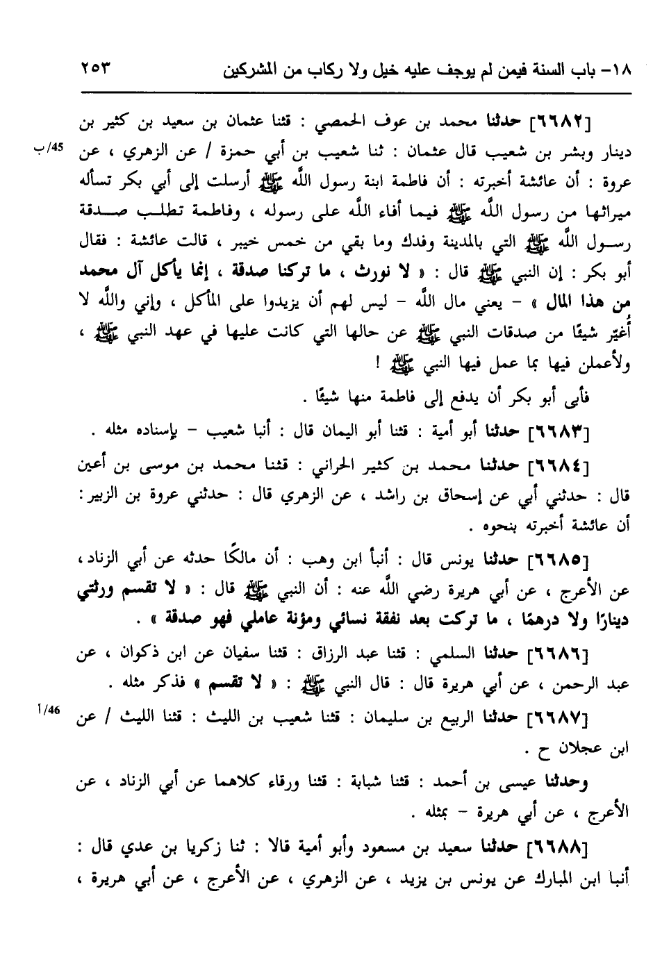 6682 - حَدَّثَنَا مُحَمَّدُ بْنُ عَوْفٍ الْحِمْصِيُّ، قثنا عُثْمَانُ بْنُ سَعِيدِ بْنِ كَثِيرِ بْنِ دِينَارٍ، وَبِشْرُ بْنُ شُعَيْبٍ، قَالَ عُثْمَانُ: ثنا شُعَيْبُ بْنُ أَبِي حَمْزَةَ، عَنِ الزُّهْرِيِّ، عَنْ عُرْوَةَ، أَنَّ عَائِشَةَ، أَخْبَرَتْهُ: أَنَّ فَاطِمَةَ ابْنَةَ رَسُولِ اللَّهِ صَلَّى اللهُ عَلَيْهِ وَسَلَّمَ أَرْسَلَتْ إِلَى أَبِي بَكْرٍ تَسْأَلُهُ مِيرَاثَهَا مِنْ رَسُولِ اللَّهِ صَلَّى اللهُ عَلَيْهِ وَسَلَّمَ فِيمَا أَفَاءَ اللَّهُ عَلَى رَسُولِهِ، وَفَاطِمَةُ تَطْلُبُ صَدَقَةَ رَسُولِ اللَّهِ صَلَّى اللهُ عَلَيْهِ وَسَلَّمَ الَّتِي بِالْمَدِينَةِ وَفَدَكَ وَمَا بَقِيَ مِنْ خُمُسِ خَيْبَرَ، قَالَتْ عَائِشَةُ: فَقَالَ أَبُو بَكْرٍ إِنَّ النَّبِيَّ صَلَّى اللهُ عَلَيْهِ وَسَلَّمَ، قَالَ: «§لَا نُوَرَّثُ، مَا تَرَكْنَا صَدَقَةٌ، إِنَّمَا يَأْكُلُ آلُ مُحَمَّدٍ مِنْ هَذَا الْمَالِ» ، يَعْنِي مَالَ اللَّهِ، «لَيْسَ لَهُمْ أَنْ يَزِيدُوا عَلَى الْمَأْكَلِ» ، وَإِنِّي وَاللَّهِ لَا أُغَيِّرُ شَيْئًا مِنْ صَدَقَاتِ النَّبِيِّ صَلَّى اللهُ عَلَيْهِ وَسَلَّمَ عَنْ حَالِهَا الَّتِي كَانَتْ عَلَيْهَا فِي عَهْدِ النَّبِيِّ صَلَّى اللهُ عَلَيْهِ وَسَلَّمَ، وَلَأَعْمَلَنَّ فِيهَا بِمَا عَمِلَ فِيهَا النَّبِيُّ صَلَّى اللهُ عَلَيْهِ وَسَلَّمَ، فَأَبَى أَبُو بَكْرٍ أَنْ يَدْفَعَ إِلَى فَاطِمَةَ مِنْهَا شَيْئًا،