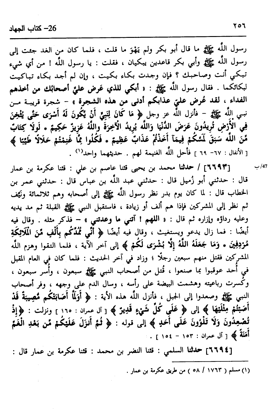 6693 - حَدَّثَنَا مُحَمَّدُ بْنُ يَحْيَى، قثنا عَاصِمُ بْنُ عَلِيٍّ، قثنا عِكْرِمَةُ بْنُ عَمَّارٍ، قَالَ: حَدَّثَنِي أَبُو زُمَيْلٍ، قَالَ: حَدَّثَنِي عَبْدُ اللَّهِ بْنُ عَبَّاسٍ، قَالَ: حَدَّثَنِي عُمَرُ بْنُ الْخَطَّابِ، قَالَ: لَمَّا كَانَ §يَوْمُ بَدْرٍ نَظَرَ رَسُولُ اللَّهِ صَلَّى اللهُ عَلَيْهِ وَسَلَّمَ إِلَى أَصْحَابِهِ، وَهُمْ ثَلَاثُمِائَةٍ وَنَيِّفٌ، ثُمَّ نَظَرَ إِلَى الْمُشْرِكِينَ فَإِذَا هُمْ أَلْفٌ أَوْ زِيَادَةٌ، فَاسْتَقْبَلَ النَّبِيُّ صَلَّى اللهُ عَلَيْهِ وَسَلَّمَ الْقِبْلَةَ، ثُمَّ مَدَّ يَدَيْهِ وَعَلَيْهِ رِدَاؤُهُ وَإِزَارُهُ، ثُمَّ قَالَ: «اللَّهُمَّ آتِنِي مَا وَعَدْتَنِي» ، فَذَكَرَ مِثْلَهُ، وَقَالَ فِيهِ أَيْضًا: فَمَا زَالَ يَدْعُو وَيَسْتَغِيثُ، وَقَالَ فِيهِ أَيْضًا: {أَنِّي مُمِدُّكُمْ بِأَلْفٍ مِنَ الْمَلَائِكَةِ مُرْدِفِينَ وَمَا جَعَلَهُ اللَّهُ إِلَّا بُشْرَى لَكُمْ} ، إِلَى آخِرِ الْآيَةِ، فَلَمَّا الْتَقَوْا وَهَزَمَ اللَّهُ الْمُشْرِكِينَ، فَقَتَلَ مِنْهُمْ سَبْعِينَ رَجُلًا، وَزَادَ فِي آخِرِ الْحَدِيثِ، فَلَمَّا كَانَ فِي الْعَامِ الْمُقْبِلِ فِي أُحُدٍ، عُوقِبُوا بِمَا صَنَعُوا، قُتِلَ مِنْ أَصْحَابِ النَّبِيِّ صَلَّى اللهُ عَلَيْهِ وَسَلَّمَ سَبْعُونَ، وَأُسِرَ سَبْعُونَ، وَكُسِرَتْ رَبَاعِيَتُهُ وَهُشِمَتِ الْبَيْضَةُ عَلَى رَأْسِهِ، وَسَالَ الدَّمُ عَلَى وَجْهِهِ، وَفَرَّ أَصْحَابُ النَّبِيِّ صَلَّى اللهُ عَلَيْهِ وَسَلَّمَ وَصَعَدُوا إِلَى الْجَبَلِ، فَأَنْزَلَ اللَّهُ هَذِهِ الْآيَةَ {أَوَلَمَّا أَصَابَتْكُمْ مُصِيبَةٌ قَدْ أَصَبْتُمْ مِثْلَيْهَا} [آل عمران: 165] ، إِلَى {عَلَى كُلِّ شَيْءٍ قَدِيرٌ} [آل عمران: 165] ، وَنَزَلَتْ: {إِذْ تُصْعِدُونَ وَلَا تَلْوُونَ عَلَى أَحَدٍ} [آل عمران: 153] ، إِلَى قَوْلِهِ {ثُمَّ أَنْزَلَ عَلَيْكُمْ مِنْ بَعْدِ الْغَمِّ أَمَنَةً} [آل عمران: 154] ،