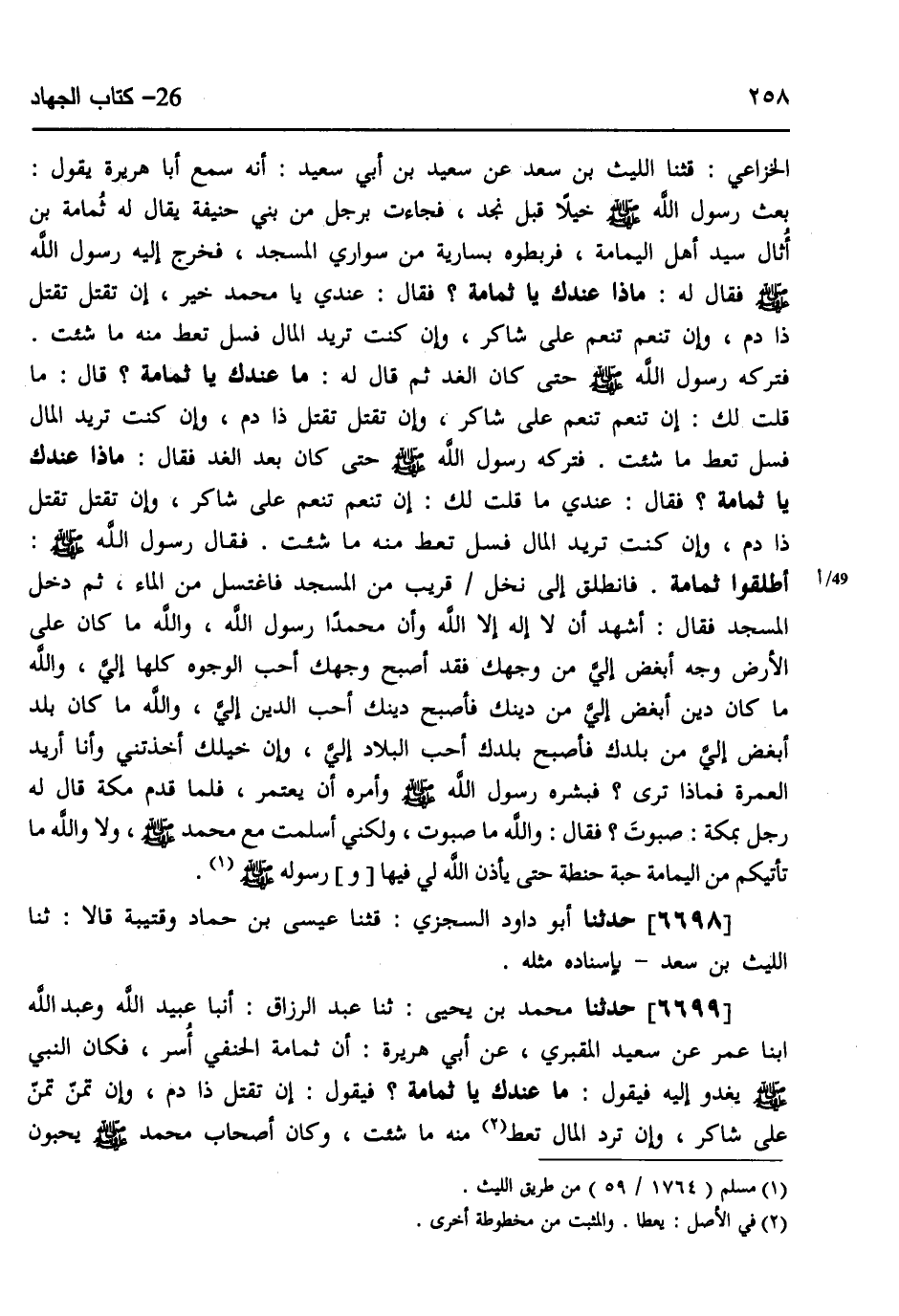 6699 - حَدَّثَنَا مُحَمَّدُ بْنُ يَحْيَى، ثنا عَبْدُ الرَّزَّاقِ، أَنْبَا عُبَيْدُ اللَّهِ، وَعَبْدُ اللَّهِ، ابْنَا عُمَرَ، عَنْ سَعِيدٍ الْمَقْبُرِيِّ، عَنْ أَبِي هُرَيْرَةَ: أَنَّ §ثُمَامَةَ الْحَنَفِيَّ أُسِرَ، فَكَانَ النَّبِيُّ صَلَّى اللهُ عَلَيْهِ وَسَلَّمَ يَغْدُو إِلَيْهِ، فَيَقُولُ: «مَا عِنْدَكَ يَا ثُمَامَةُ؟» ، فَيَقُولُ: إِنْ تَقْتُلْ ذَا دَمٍ، وَإِنْ تَمُنَّ تَمُنَّ عَلَى شَاكِرٍ، وَإِنْ تُرِدِ الْمَالَ تُعْطَ مِنْهُ مَا شِئْتَ، وَكَانَ أَصْحَابُ مُحَمَّدٍ صَلَّى اللهُ عَلَيْهِ وَسَلَّمَ يُحِبُّونَ -[259]- الْفِدَاءَ، وَيَقُولُونَ: مَا يَصْنَعُ بِقَتْلِ هَذَا، فَمَنَّ عَلَيْهِ النَّبِيُّ صَلَّى اللهُ عَلَيْهِ وَسَلَّمَ يَوْمًا فَأَسْلَمَ، فَحَلَّهُ إِلَى حَائِطِ ابْنِ طَلْحَةَ فَأَمَرَهُ أَنْ يَغْتَسِلَ، فَاغْتَسَلَ وَصَلَّى رَكْعَتَيْنِ، فَقَالَ النَّبِيُّ صَلَّى اللهُ عَلَيْهِ وَسَلَّمَ: «لَقَدْ حَسُنَ إِسْلَامُ أَخِيكُمْ»