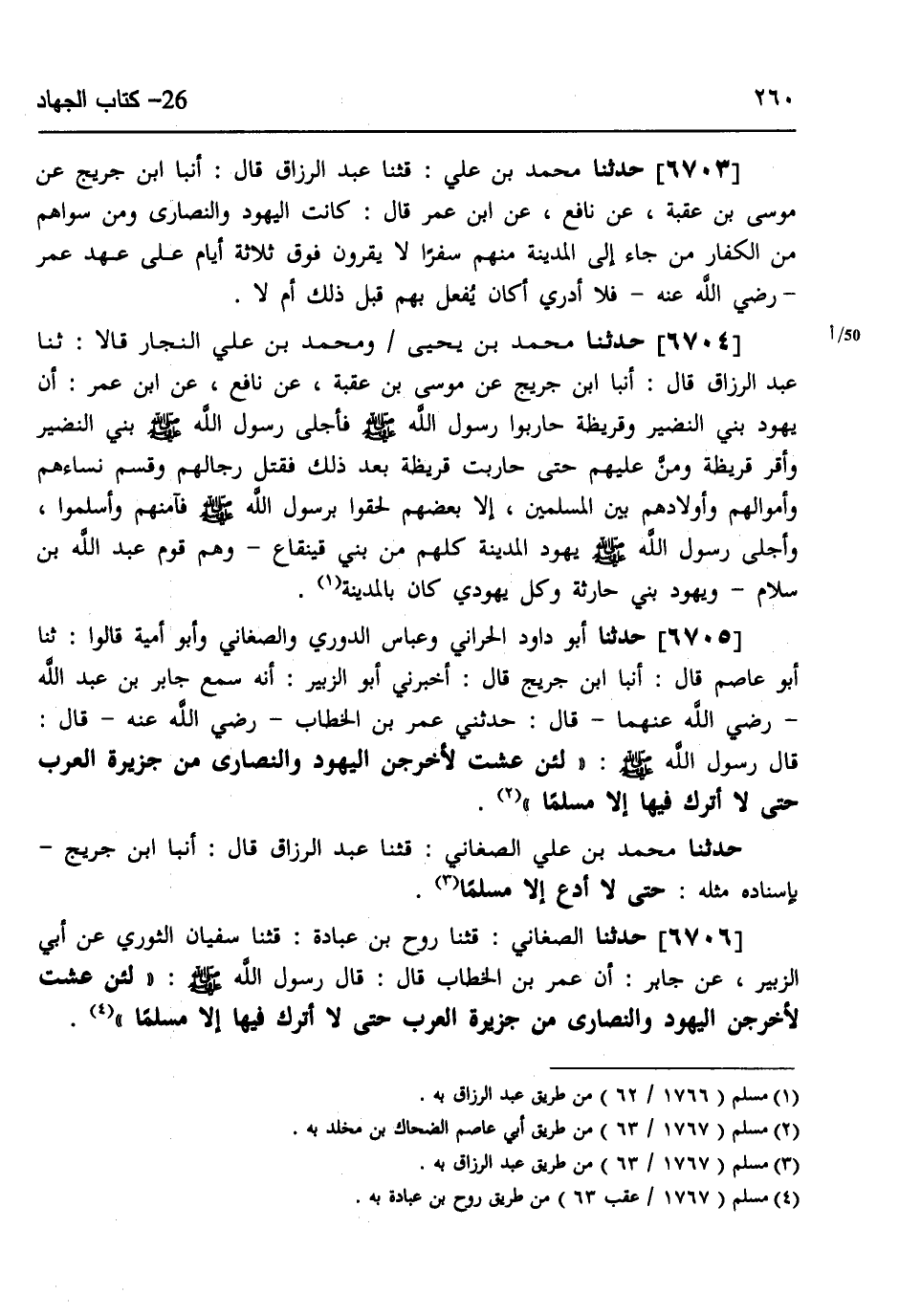 6706 - حَدَّثَنَا الصَّغَانِيُّ، قثنا رَوْحُ بْنُ عُبَادَةَ، قثنا سُفْيَانُ الثَّوْرِيُّ، عَنْ أَبِي الزُّبَيْرِ، عَنْ جَابِرٍ، أَنَّ عُمَرَ بْنَ الْخَطَّابِ، قَالَ: قَالَ رَسُولُ اللَّهِ صَلَّى اللهُ عَلَيْهِ وَسَلَّمَ: «§لَئِنْ عِشْتُ لَأُخْرِجَنَّ الْيَهُودَ وَالنَّصَارَى مِنْ جَزِيرَةِ الْعَرَبِ حَتَّى لَا أَتْرُكَ فِيهَا إِلَّا مُسْلِمًا»