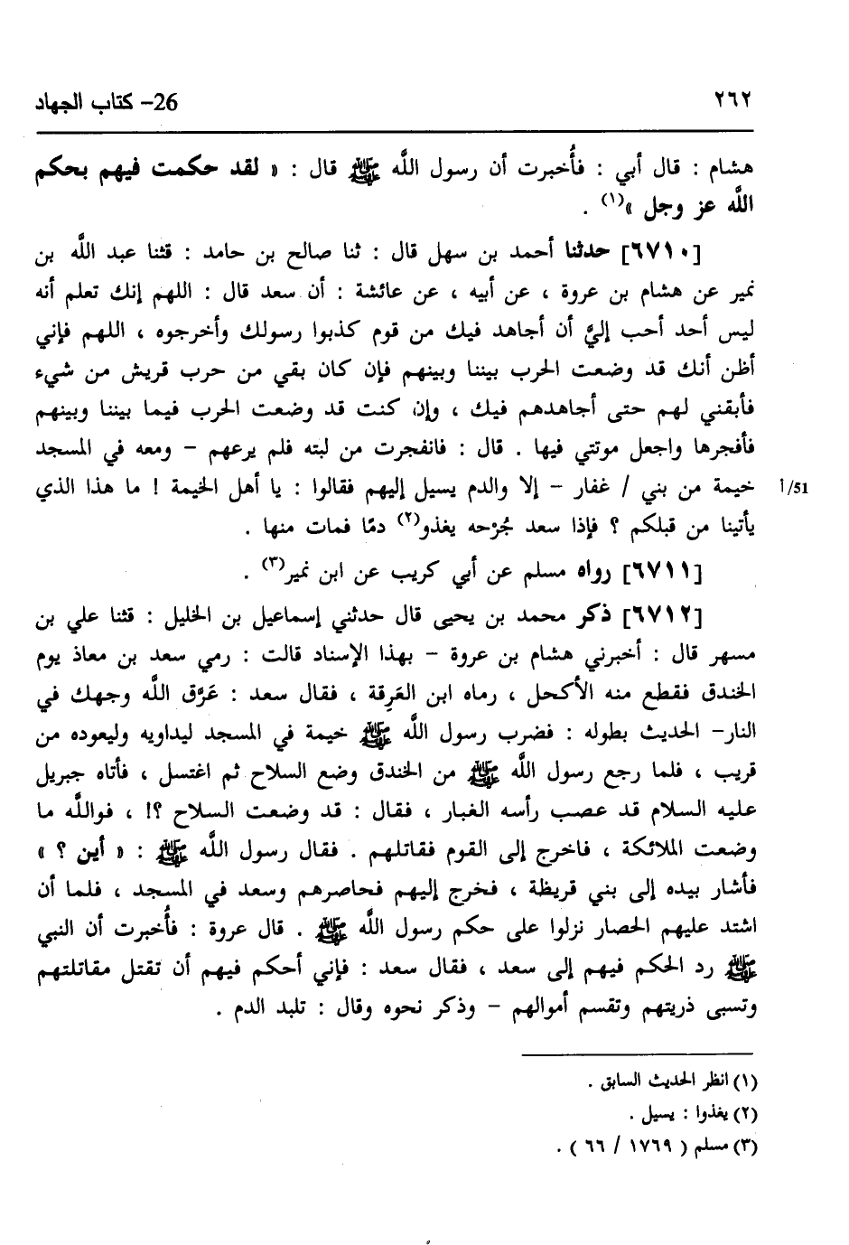 6712 - ذَكَرَ مُحَمَّدُ بْنُ يَحْيَى، قَالَ: حَدَّثَنِي إِسْمَاعِيلُ بْنُ الْخَلِيلِ، قثنا عَلِيُّ بْنُ مُسْهِرٍ، قَالَ: أَخْبَرَنِي هِشَامُ بْنُ عُرْوَةَ، بِهَذَا الْإِسْنَادِ، قَالَتْ: §رُمِيَ سَعْدُ بْنُ مُعَاذٍ يَوْمَ الْخَنْدَقِ، فَقُطِعَ مِنْهُ الْأَكْحَلُ رَمَاهُ ابْنُ الْعَرِقَةِ، فَقَالَ سَعْدٌ: عَرَّقَ اللَّهُ وَجْهَكَ فِي النَّارِ، الْحَدِيثَ بِطُولِهِ، فَضَرَبَ رَسُولُ اللَّهِ صَلَّى اللهُ عَلَيْهِ وَسَلَّمَ خَيْمَةً فِي الْمَسْجِدِ لِيُدَاوِيَهُ وَلْيَعُودَهُ مِنْ قَرِيبٍ، فَلَمَّا رَجَعَ رَسُولُ اللَّهِ صَلَّى اللهُ عَلَيْهِ وَسَلَّمَ مِنَ الْخَنْدَقِ وَضَعَ السِّلَاحَ ثُمَّ اغْتَسَلَ، فَأَتَاهُ جِبْرِيلُ عَلَيْهِ السَّلَامُ قَدْ عَصَبَ رَأْسَهُ الْغُبَارُ، فَقَالَ: قَدْ وَضَعْتَ السِّلَاحَ، فَوَاللَّهِ مَا وَضَعَتِ الْمَلَائِكَةُ فَاخْرُجْ إِلَى الْقَوْمِ فَقَاتِلْهُمْ، فَقَالَ رَسُولُ اللَّهِ صَلَّى اللهُ عَلَيْهِ وَسَلَّمَ: «أَيْنَ؟» ، فَأَشَارَ بِيَدِهِ إِلَى بَنِي قُرَيْظَةَ، فَخَرَجَ إِلَيْهِمْ فَحَاصَرَهُمْ وَسَعْدٌ فِي الْمَسْجِدِ، فَلَمَّا أَنِ اشْتَدَّ عَلَيْهِمُ الحِصَارَ نَزَلُوا عَلَى حُكْمِ رَسُولِ اللَّهِ صَلَّى اللهُ عَلَيْهِ وَسَلَّمَ قَالَ عُرْوَةُ: فَأُخْبِرْتُ أَنَّ النَّبِيَّ صَلَّى اللهُ عَلَيْهِ وَسَلَّمَ رَدَّ الْحُكْمَ فِيهِمْ إِلَى سَعْدٍ، فَقَالَ سَعْدٌ: فَإِنِّي أَحْكُمُ فِيهِمْ أَنْ تُقْتَلَ مُقَاتِلَتُهُمْ، وَتُسْبَى ذُرِّيَّتُهُمْ، وَتُقْسَمَ أَمْوَالُهُمْ، وَذَكَرَ نَحْوَهُ، وَقَالَ: تَلَبَّدَ الدَّمُ