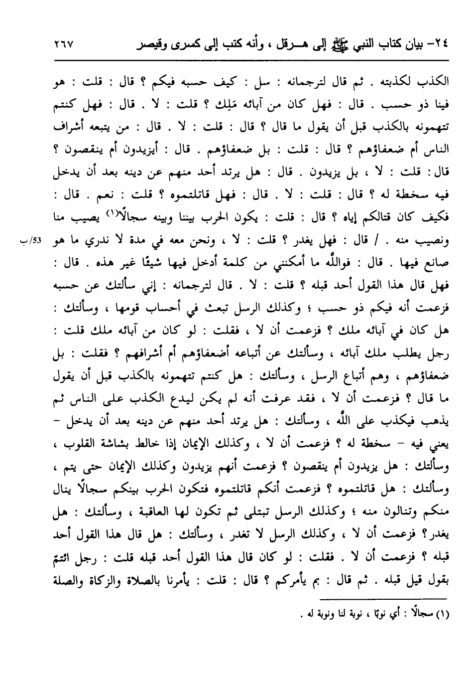عَلَيَّ الْكَذِبَ لَكَذَبْتُهُ ، ثُمَّ قَالَ لِتَرْجُمَانِهِ : سَلْ كَيْفَ حَسَبُهُ فِيكُمْ ؟ قَالَ : قُلْتُ : هُوَ فِينَا ذُو حَسَبٍ ، قَالَ : فَهَلْ كَانَ مِنْ آبَائِهِ مَلِكٌ ؟ قُلْتُ : لاَ ، قَالَ : فَهَلْ كُنْتُمْ تَتَّهِمُونَهُ بِالْكَذِبِ قَبْلَ أَنْ يَقُولَ مَا قَالَ ؟ قَالَ : قُلْتُ : لاَ ، قَالَ : مَنْ يَتْبَعُهُ أَشْرَافُ النَّاسِ أَمْ ضُعَفَاؤُهُمْ ؟ قَالَ : قُلْتُ : بَلْ ضُعَفَاؤُهُمْ ، قَالَ : أَيَزِيدُونَ أَمْ يَنْقُصُونَ ؟ قَالَ : قُلْتُ : لاَ ، بَلْ يَزِيدُونَ ، قَالَ : هَلْ يَرْتَدُّ أَحَدٌ مِنْهُمْ عَنْ دِينِهِ بَعْدَ أَنْ يَدْخُلَ فِيهِ سَخْطَةً لَهُ ؟ قَالَ : قُلْتُ : لاَ ، قَالَ : فَهَلْ قَاتَلْتُمُوهُ ؟ قُلْتُ : نَعَمْ ، قَالَ : فَكَيْفَ كَانَ قِتَالُكُمْ إِيَّاهُ ، قَالَ : قُلْتُ : يَكُونُ الْحَرْبُ بَيْنَنَا وَبَيْنَهُ سِجَالا يُصِيبُ مِنَّا وَنُصِيبُ مِنْهُ ، قَالَ : فَهَلْ يَغْدِرُ ؟ قُلْتُ : لاَ ، وَنَحْنُ مَعَهُ فِي مُدَّةٍ لاَ نَدْرِي مَا هُوَ صَانِعٌ فِيهَا ، قَالَ : فَوَاللَّهِ مَا أَمْكَنَنِي مِنْ كَلِمَةٍ أُدْخِلُ فِيهَا شَيْئًا غَيْرَ هَذِهِ ، قَالَ : فَهَلْ قَالَ هَذَا الْقَوْلَ أَحَدٌ قَبْلَهُ ؟ قُلْتُ : لاَ ، قَالَ لِتَرْجُمَانِهِ : إِنِّي سَأَلْتُكَ عَنْ حَسَبِهِ فَزَعَمْتَ أَنَّهُ فِيكُمْ ذُو حَسَبٍ ، وَكَذَلِكَ الرُّسُلُ تُبْعَثُ فِي أَحْسَابِ قَوْمِهَا ، وَسَأَلْتُكَ هَلْ كَانَ فِي آبَائِهِ مَلِكٌ ؟ فَزَعَمْتَ أَنْ لاَ ، فَقُلْتُ : لَوْ كَانَ مِنْ آبَائِهِ مَلِكٌ قُلْتُ رَجُلٌ يَطْلُبُ مُلْكَ آبَائِهِ ، وَسَأَلْتُكَ عَنْ أَتْبَاعِهِ : أَضُعَفَاؤُهُمْ أَمْ أَشْرَافُهُمْ ؟ فَقُلْتَ : بَلْ ضُعَفَاؤُهُمْ وَهُمْ أَتْبَاعُ الرُّسُلِ ، وَسَأَلْتُكَ هَلْ كُنْتُمْ تَتَّهِمُونَهُ بِالْكَذِبِ قَبْلَ أَنْ يَقُولَ مَا قَالَ ؟ فَزَعَمْتَ أَنْ لاَ فَقَدْ عَرَفْتُ أَنَّهُ لَمْ يَكُنْ لِيَدَعَ الْكَذِبَ عَلَى النَّاسِ ثُمَّ يَذْهَبُ فَيَكْذِبَ عَلَى اللهِ ، وَسَأَلْتُكَ هَلْ يَرْتَدُّ أَحَدٌ مِنْهُمْ عَنْ دِينِهِ بَعْدَ أَنْ يَدْخُلَ يَعْنِي فِيهِ سَخْطَةً لَهُ ، فَزَعَمْتَ أَنْ لاَ ، وَكَذَلِكَ الإِيمَانُ إِذَا خَالَطَ بَشَاشَةَ الْقُلُوبِ ، وَسَأَلْتُكَ هَلْ يَزِيدُونَ أَمْ يَنْقُصُونَ ؟ فَزَعَمْتَ أَنَّهُمْ يَزِيدُونَ وَكَذَلِكَ الإِيمَانُ حَتَّى يتِمَّ ، وَسَأَلْتُكَ هَلْ قَاتَلْتُمُوهُ ؟ فَزَعَمْتَ أَنَّكُمْ قَاتَلْتُمُوهُ فَتَكُونَ الْحَرْبُ بَيْنَكُمْ سِجَالا يَنَالُ مِنْكُمْ وَتَنَالُونَ مِنْهُ ، وَكَذَلِكَ الرُّسُلُ تُبْتَلَى ثُمَّ تَكُونُ لَهَا الْعَاقِبَةُ ، وَسَأَلْتُكَ هَلْ يَغْدِرُ ؟ فَزَعَمْتَ أَنْ لاَ ، وَكَذَلِكَ الرُّسُلُ لاَ تَغْدِرُ ، وَسَأَلْتُكَ : هَلْ قَالَ هَذَا الْقَوْلَ أَحَدٌ قَبْلَهُ ؟ فَزَعَمْتَ أَنْ لاَ ، فَقُلْتُ : لَوْ كَانَ قَالَ هَذَا الْقَوْلَ أَحَدٌ قَبْلَهُ قُلْتُ رَجُلٌ ائْتَمَّ بِقَوْلٍ قِيلَ قَبْلَهُ ، ثُمَّ قَالَ : بِمَ يَأْمُرُكُمْ ؟ قَالَ : قُلْتُ : يَأْمُرُنَا بِالصَّلاةِ وَالزَّكَاةِ وَالصِّلَةِ