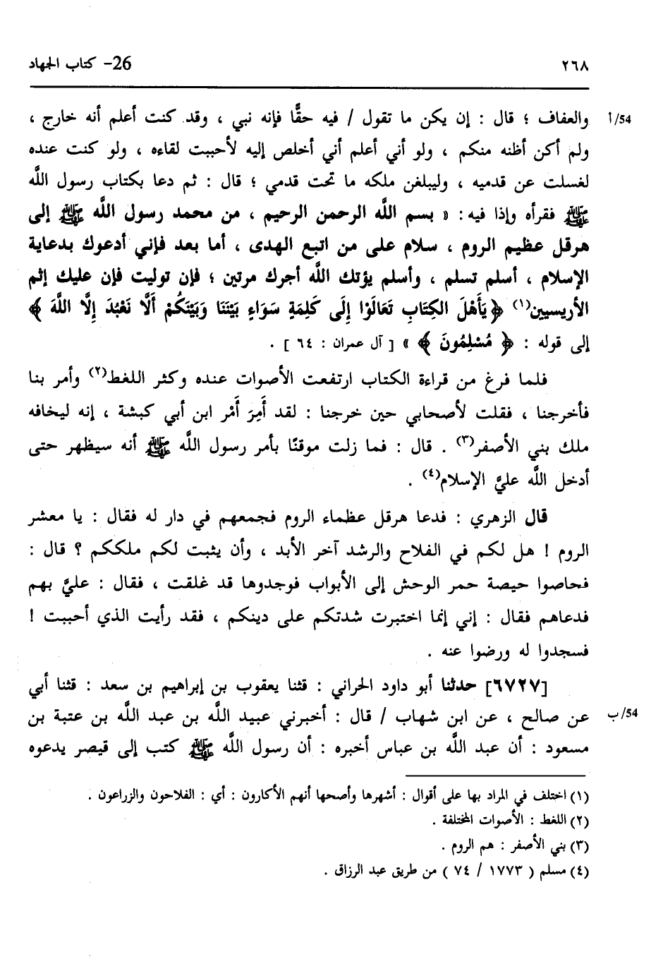 6727 - حَدَّثَنَا أَبُو دَاوُدَ الْحَرَّانِيُّ، قثنا يَعْقُوبُ بْنُ إِبْرَاهِيمَ بْنِ سَعْدٍ، قثنا أَبِي، عَنْ صَالِحٍ، عَنِ ابْنِ شِهَابٍ، قَالَ: أَخْبَرَنِي عُبَيْدُ اللَّهِ بْنُ عَبْدِ اللَّهِ بْنِ عُتْبَةَ بْنِ مَسْعُودٍ، أَنَّ عَبْدَ اللَّهِ بْنَ عَبَّاسٍ، أَخْبَرَهُ: أَنَّ §رَسُولَ اللَّهِ صَلَّى اللهُ عَلَيْهِ وَسَلَّمَ كَتَبَ إِلَى قَيْصَرَ يَدْعُوهُ -[269]- إِلَى الْإِسْلَامِ، وَبَعَثَ بِكِتَابِهِ مَعَ دِحْيَةَ الْكَلْبِيِّ، وَأَمَرَهُ رَسُولُ اللَّهِ صَلَّى اللهُ عَلَيْهِ وَسَلَّمَ أَنْ يَدْفَعَهُ إِلَى عَظِيمِ بُصْرَى يَدْفَعُهُ إِلَى قَيْصَرَ فَدَفَعَهُ عَظِيمُ بُصْرَى إِلَى قَيْصَرَ، وَكَانَ قَيْصَرُ لَمَّا كَشَفَ اللَّهُ عَنْهُ جُنُودَ فَارِسَ مَشَى مِنْ حِمْصَ إِلَى إِيلِيَاءَ شُكْرًا لَمَّا أَبْلَاهُ اللَّهُ، فَلَمَّا جَاءَ قَيْصَرَ كِتَابُ رَسُولِ اللَّهِ صَلَّى اللهُ عَلَيْهِ وَسَلَّمَ، قَالَ حِينَ قَرَأَهُ: الْتَمِسُوا، هَلْ هَهُنَا مِنْ قَوْمِهِ أَحَدٌ لِنَسْأَلَهُ عَنْ رَسُولِ اللَّهِ صَلَّى اللهُ عَلَيْهِ وَسَلَّمَ؟، قَالَ ابْنُ عَبَّاسٍ: فَأَخْبَرَنِي أَبُو سُفْيَانَ بْنُ حَرْبٍ أَنَّهُ كَانَ بِالشَّامِ فِي رِجَالٍ مِنْ قُرَيْشٍ قَدِمُوا تُجَّارًا فِي الْمُدَّةِ الَّتِي كَانَتْ بَيْنَ رَسُولِ اللَّهِ صَلَّى اللهُ عَلَيْهِ وَسَلَّمَ وَبَيْنَ كُفَّارِ قُرَيْشٍ، قَالَ أَبُو سُفْيَانَ: فَوَجَدْنَا رَسُولَ قَيْصَرَ بِبَعْضِ الشَّامِ فَانْطَلَقَ بِي وَبِأَصْحَابِي حَتَّى قَدِمْنَا إِيلِيَاءَ فَأَدْخَلَنَا عَلَيْهِ، فَإِذَا هُوَ جَالِسٌ فِي مَجْلِسِ مُلْكِهِ وَعَلَيْهِ التَّاجُ، وَحَوْلَهُ عُظَمَاءُ الرُّومِ، فَقَالَ لِتَرْجُمَانِهِ: سَلْهُمْ أَيُّهُمْ أَقْرَبُ نَسَبًا إِلَى هَذَا الرَّجُلِ الَّذِي يَزْعُمُ أَنَّهُ نَبِيٌّ؟، قَالَ أَبُو سُفْيَانَ: فَقُلْتُ: أَنَا أَقْرَبُهُمْ إِلَيْهِ نَسَبًا، فَقَالُوا: مَا قَرَابَةُ بَيْنَكَ وَبَيْنَهُ؟، قَالَ: قُلْتُ: هُوَ ابْنُ عَمِّي، قَالَ: وَلَيْسَ فِي الرَّكْبِ يَوْمَئِذٍ رَجُلٌ مِنْ بَنِي عَبْدِ مَنَافٍ غَيْرِي، قَالَ: فَقَالَ قَيْصَرُ: أَدْنُوهُ مِنِّي، قَالَ: ثُمَّ أَمَرَ أَصْحَابِي فَجُعِلُوا خَلْفَ ظَهْرِي عِنْدَ كَتِفَيَّ، قَالَ: ثُمَّ قَالَ لِتَرْجُمَانِهِ: قُلْ لِأَصْحَابِهِ إِنِّي سَائِلٌ هَذَا عَنْ هَذَا الرَّجُلِ الَّذِي يَزْعُمُ أَنَّهُ نَبِيٌّ فَإِنْ كَذَبَ فَكَذِّبُوهُ، قَالَ أَبُو سُفْيَانُ: وَاللَّهِ لَوْلَا الْحَيَاءُ يَوْمَئِذٍ مِنْ أَنْ يَأْثُرَ أَصْحَابِي عَلَيَّ الْكَذِبَ لَكَذَبْتُهُ عَنْهُ حِينَ سَأَلَنِي، وَلَكِنِ اسْتَحْيَيْتُ أَنْ يَأْثِرُوا عَلَيَّ الْكَذِبَ فَصَدَقْتُهُ عَنْهُ، ثُمَّ قَالَ لِتَرْجُمَانِهِ: كَيْفَ نَسَبُ هَذَا الرَّجُلِ فِيكُمْ؟، قُلْتُ: هُوَ فِينَا ذُو نَسَبٍ، قَالَ: فَهَلْ قَالَ هَذَا الْقَوْلَ مِنْكُمْ أَحَدٌ قَبْلَهُ؟، قَالَ: قُلْتُ: لَا، قَالَ: فَهَلْ كُنْتُمْ تَتَّهِمُونَهُ بِالْكَذِبِ قَبْلَ أَنْ يَقُولَ مَا قَالَ؟، قَالَ: قُلْتُ: لَا، قَالَ: فَهَلْ كَانَ مِنْ آبَائِهِ مَلِكٌ؟، قَالَ: قُلْتُ: لَا، قَالَ: قَالَ: فَأَشْرَافُ النَّاسِ اتَّبَعُوهُ أَمْ ضُعَفَاؤُهُمْ؟، قَالَ: قُلْتُ: بَلْ ضُعَفَاؤُهُمْ، قَالَ: أَفَيَزَيدُونَ أَمْ يَنْقُصُونَ؟، قَالَ: قُلْتُ: بَلْ يَزِيدُونَ، قَالَ: قَالَ: فَهَلْ يَرْتَدُّ أَحَدٌ سَخْطَةً لِدِينِهِ بَعْدَ أَنْ يَدْخُلَ فِيهِ؟، قَالَ: قُلْتُ: لَا، قَالَ: فَهَلْ يَغْدِرُ؟، قَالَ: قُلْتُ: لَا وَنَحْنُ مِنْهُ الْآنَ فِي مُدَّةٍ وَنَحْنُ نَخَافُ أَنْ يَغْدِرَ، قَالَ: وَقَالَ أَبُو سُفْيَانَ: وَلَمْ تُمْكِنِّي كَلِمَةٌ أَدْخِلُ فِيهَا شَيْئًا أَنْتَقِصُهُ بِهِ لَا أَخَافُ أَنْ يُؤْثَرَ عَنِّي غَيْرَهَا، قَالَ: فَهَلْ قَاتَلْتُمُوهُ وَهَلْ