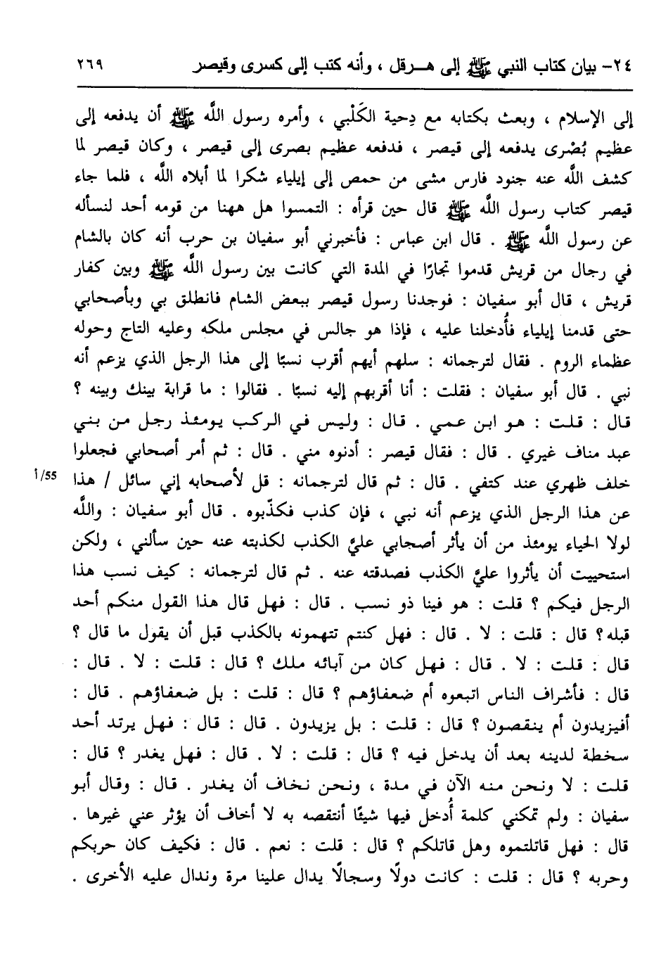 6727- حَدَّثَنَا أَبُو دَاوُدَ الْحَرَّانِيُّ ، قَالَ : حَدَّثَنَا يَعْقُوبُ بْنُ إِبْرَاهِيمَ بْنِ سَعْدٍ ، قَالَ : حَدَّثَنَا أَبِي ، عَنْ صَالِحٍ ، عَنِ ابْنِ شِهَابٍ ، قَالَ : أَخْبَرَنِي عُبَيْدُ اللهِ بْنُ عَبْدِ اللهِ بْنِ عُتْبَةَ بْنِ مَسْعُودٍ ، أَنَّ عَبْدَ اللهِ بْنَ عَبَّاسٍ ، أَخْبَرَهُ : أَنَّ رَسُولَ اللهِ صَلَّى الله عَلَيهِ وسَلَّم كَتَبَ إِلَى قَيْصَرَ يَدْعُوهُ إِلَى الإِسْلامِ ، وَبَعَثَ بِكِتَابِهِ مَعَ دِحْيَةَ الْكَلْبِيِّ ، وَأَمَرَهُ رَسُولُ اللهِ صَلَّى الله عَلَيهِ وسَلَّم أَنْ يَدْفَعَهُ إِلَى عَظِيمِ بُصْرَى يَدْفَعُهُ إِلَى قَيْصَرَ ، فَدَفَعَهُ عَظِيمُ بُصْرَى إِلَى قَيْصَرَ ، وَكَانَ قَيْصَرُ لَمَّا كَشَفَ اللَّهُ عَنْهُ جُنُودَ فَارِسَ مَشَى مِنْ حِمْصَ إِلَى إِيلِيَاءَ شُكْرًا لِما أَبْلاهُ اللَّهُ ، فَلَمَّا جَاءَ قَيْصَرَ كِتَابُ رَسُولِ اللهِ صَلَّى الله عَلَيهِ وسَلَّم ، قَالَ حِينَ قَرَأَهُ : الْتَمِسُوا ، هَلْ هَاهُنَا مِنْ قَوْمِهِ أَحَدٌ لِنَسْأَلَهُ عَنْ رَسُولِ اللهِ صَلَّى الله عَلَيهِ وسَلَّم ؟ قَالَ ابْنُ عَبَّاسٍ : فَأَخْبَرَنِي أَبُو سُفْيَانَ بْنُ حَرْبٍ ، أَنَّهُ كَانَ بِالشَّامِ فِي رِجَالٍ مِنْ قُرَيْشٍ قَدِمُوا تُجَّارًا فِي الْمُدَّةِ الَّتِي كَانَتْ بَيْنَ رَسُولِ اللهِ صَلَّى الله عَلَيهِ وسَلَّم وَبَيْنَ كُفَّارِ قُرَيْشٍ ، قَالَ أَبُو سُفْيَانَ : فَوَجَدْنَا رَسُولَ قَيْصَرَ بِبَعْضِ الشَّامِ فَانْطَلَقَ بِي وَبِأَصْحَابِي حَتَّى قَدِمْنَا إِيلِيَاءَ فَأَدْخَلَنَا عَلَيْهِ ، فَإِذَا هُوَ جَالِسٌ فِي مَجْلِسِ مُلْكِهِ وَعَلَيْهِ التَّاجُ ، وَحَوْلَهُ عُظَمَاءُ الرُّومِ ، فَقَالَ لِتَرْجُمَانِهِ : سَلْهُمْ أَيُّهُمْ أَقْرَبُ نَسَبًا إِلَى هَذَا الرَّجُلِ الَّذِي يَزْعُمُ أَنَّهُ نَبِيٌّ ؟ قَالَ أَبُو سُفْيَانَ : فَقُلْتُ : أَنَا أَقْرَبُهُمْ إِلَيْهِ نَسَبًا ، فَقَالُوا : مَا قَرَابَةُ بَيْنَكَ وَبَيْنَهُ ؟ قَالَ : قُلْتُ : هُوَ ابْنُ عَمِّي ، قَالَ : وَلَيْسَ فِي الرَّكْبِ يَوْمَئِذٍ رَجُلٌ مِنْ بَنِي عَبْدِ مَنَافٍ غَيْرِي ، قَالَ : فَقَالَ قَيْصَرُ : أَدْنُوهُ مِنِّي ، قَالَ : ثُمَّ أَمَرَ أَصْحَابِي فَجُعِلُوا خَلْفَ ظَهْرِي عِنْدَ كَتِفَيَّ ، قَالَ : ثُمَّ قَالَ لِتَرْجُمَانِهِ : قُلْ لأَصْحَابِهِ إِنِّي سَائِلٌ هَذَا عَنْ هَذَا الرَّجُلِ الَّذِي يَزْعُمُ أَنَّهُ نَبِيٌّ فَإِنْ كَذَبَ فَكَذِّبُوهُ ، قَالَ أَبُو سُفْيَانُ : وَاللَّهِ لَوْلا الْحَيَاءُ يَوْمَئِذٍ مِنْ أَنْ يَأْثُرَ أَصْحَابِي عَلَيَّ الْكَذِبَ لَكَذَبْتُهُ عَنْهُ حِينَ سَأَلَنِي ، وَلَكِنِ اسْتَحْيَيْتُ أَنْ يَأْثِرُوا عَلَيَّ الْكَذِبَ فَصَدَقْتُهُ عَنْهُ ، ثُمَّ قَالَ لِتَرْجُمَانِهِ : كَيْفَ نَسَبُ هَذَا الرَّجُلِ فِيكُمْ ؟ قُلْتُ : هُوَ فِينَا ذُو نَسَبٍ ، قَالَ : فَهَلْ قَالَ هَذَا الْقَوْلَ مِنْكُمْ أَحَدٌ قَبْلَهُ ؟ قَالَ : قُلْتُ : لاَ ، قَالَ : فَهَلْ كُنْتُمْ تَتَّهِمُونَهُ بِالْكَذِبِ قَبْلَ أَنْ يَقُولَ مَا قَالَ ؟ قَالَ : قُلْتُ : لاَ ، قَالَ : فَهَلْ كَانَ مِنْ آبَائِهِ مَلِكٌ ؟ قَالَ : قُلْتُ : لاَ ، قَالَ : قَالَ : فَأَشْرَافُ النَّاسِ اتَّبَعُوهُ أَمْ ضُعَفَاؤُهُمْ ؟ قَالَ : قُلْتُ : بَلْ ضُعَفَاؤُهُمْ ، قَالَ : أَفَيَزِيدُونَ أَمْ يَنْقُصُونَ ؟ قَالَ : قُلْتُ : بَلْ يَزِيدُونَ ، قَالَ : قَالَ : فَهَلْ يَرْتَدُّ أَحَدٌ سَخْطَةً لِدِينِهِ بَعْدَ أَنْ يَدْخُلَ فِيهِ ؟ قَالَ : قُلْتُ : لاَ ، قَالَ : فَهَلْ يَغْدِرُ ؟ قَالَ : قُلْتُ : لاَ , وَنَحْنُ مِنْهُ الآنَ فِي مُدَّةٍ وَنَحْنُ نَخَافُ أَنْ يَغْدِرَ ، قَالَ : وَقَالَ أَبُو سُفْيَانَ : وَلَمْ تُمْكِنِّي كَلِمَةٌ أُدْخِلُ فِيهَا شَيْئًا أَنْتَقِصُهُ بِهِ لاَ أَخَافُ أَنْ يُؤْثَرَ عَنِّي غَيْرَهَا ، قَالَ : فَهَلْ قَاتَ