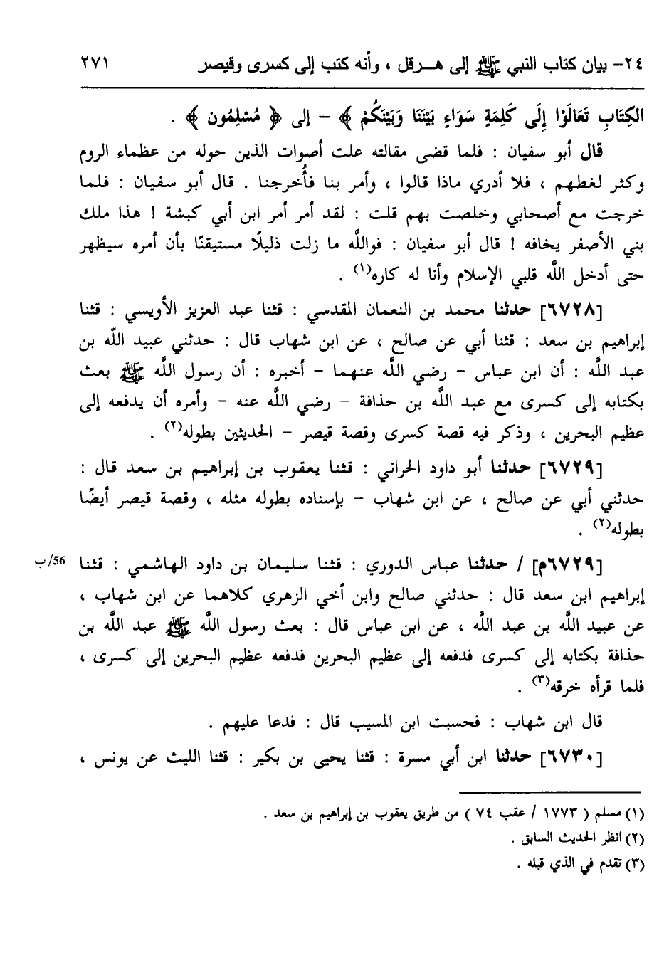 6731 - حَدَّثَنَا أَبُو سَعْدٍ المَخْضُوفُ الْهَرَوِيُّ، بِبَغْدَادَ وَاسْمُهُ يَحْيَى بْنُ مَنْصُورٍ وَيُعْرَفُ بِيَحْيَى بْنِ أَبِي نَصْرٍ، قثنا سُوَيْدُ بْنُ نَصْرٍ، قَالَ: أنبا ابْنُ الْمُبَارَكِ، عَنْ يُونُسَ، عَنِ الزُّهْرِيِّ، قَالَ: أَخْبَرَنِي عُبَيْدُ اللَّهِ بْنُ عَبْدِ اللَّهِ، أَنَّ ابْنَ عَبَّاسٍ، أَخْبَرَهُ: أَنَّ أَبَا سُفْيَانَ بْنَ حَرْبٍ أَخْبَرَهُ: أَنَّ هِرَقْلَ أَرْسَلَ إِلَى نَفَرٍ مِنْ قُرَيْشٍ، وَكَانُوا تُجَّارًا بِالشَّامِ فَأَتَوْهُ، وَذَكَرَ الْحَدِيثَ بِطُولِهِ، قَالَ: ثُمَّ دَعَا بِكِتَابِ رَسُولِ اللَّهِ صَلَّى اللهُ عَلَيْهِ وَسَلَّمَ فَقُرِئَ فَإِذَا فِيهِ: «بِسْمِ اللَّهِ الرَّحْمَنِ الرَّحِيمِ، مِنْ مُحَمَّدٍ عَبْدِ اللَّهِ وَرَسُولِهِ إِلَى هِرَقْلَ عَظِيمِ الرُّومِ سَلَّامٌ عَلَى مَنِ اتَّبَعَ الْهُدَى أَمَّا بَعْدُ» ،
