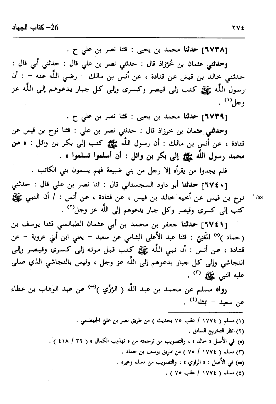 6741 - حَدَّثَنَا جَعْفَرُ بْنُ مُحَمَّدِ بْنِ أَبِي عُثْمَانَ الطَّيَالِسِيُّ، قثنا يُوسُفُ بْنُ حَمَّادٍ الْمَعْنِيُّ، قثنا عَبْدُ الْأَعْلَى السَّامِيُّ، عَنْ سَعِيدٍ يَعْنِي ابْنَ أَبِي عَرُوبَةَ، عَنْ قَتَادَةَ، عَنْ أَنَسٍ: «أَنَّ §نَبِيَّ اللَّهِ صَلَّى اللهُ عَلَيْهِ وَسَلَّمَ كَتَبَ قَبْلَ مَوْتِهِ إِلَى كِسْرَى وَقَيْصَرَ وَإِلَى النَّجَاشِيِّ وَإِلَى كُلِّ جَبَّارٍ يَدْعُوهُمْ إِلَى اللَّهِ عَزَّ وَجَلَّ، وَلَيْسَ بِالنَّجَاشِيِّ الَّذِي صَلَّى عَلَيْهِ النَّبِيُّ صَلَّى اللهُ عَلَيْهِ وَسَلَّمَ» . رَوَاهُ مُسْلِمٌ، عَنْ مُحَمَّدِ بْنِ عَبْدِ اللَّهِ الرَّزِّيُّ، عَنْ عَبْدِ الْوَهَّابِ بْنِ عَطَاءٍ، عَنْ سَعِيدٍ بِمِثْلِهِ