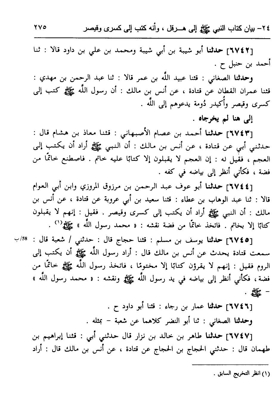 6742 - حَدَّثَنَا أَبُو شَيْبَةَ بْنُ أَبِي شَيْبَةَ، وَمُحَمَّدُ بْنُ عَلِيِّ بْنِ دَاوُدَ، قَالَا: ثنا أَحْمَدُ بْنُ حَنْبَلٍ، ح وَحَدَّثَنَا الصَّغَانِيُّ، قثنا عُبَيْدُ اللَّهِ بْنُ عُمَرَ، قَالَا: ثنا عَبْدُ الرَّحْمَنِ بْنُ مَهْدِيٍّ، قثنا عِمْرَانُ الْقَطَّانُ، عَنْ قَتَادَةَ، عَنْ أَنَسِ بْنِ مَالِكٍ: «أَنَّ §رَسُولَ اللَّهِ صَلَّى اللهُ عَلَيْهِ وَسَلَّمَ كَتَبَ إِلَى كِسْرَى وَقَيْصَرَ، وَأُكَيْدِرَ دُومَةَ يَدْعُوهُمْ إِلَى اللَّهِ» . إِلَى هُنَا لَمْ يُخَرِّجَاهُ