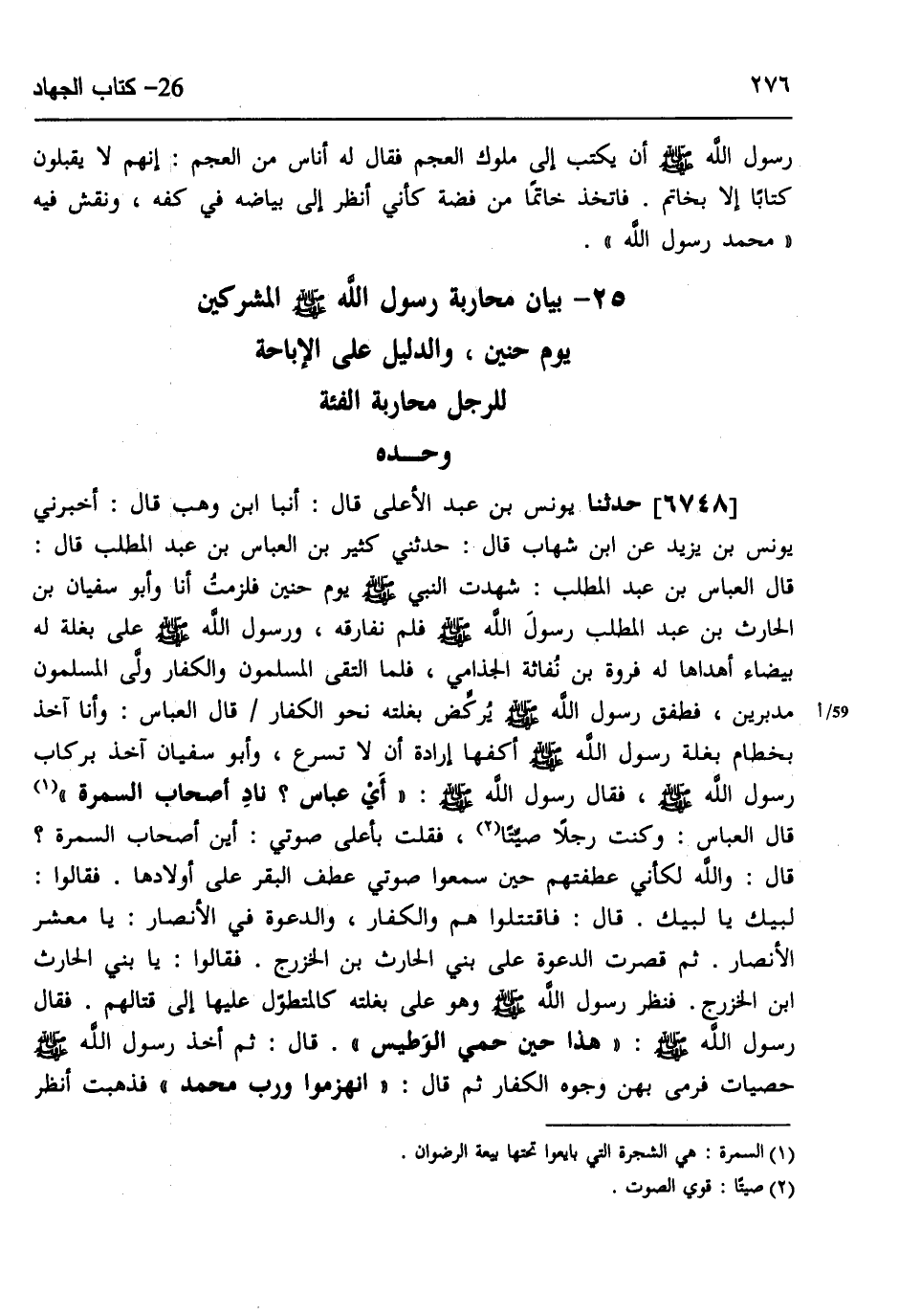 6748 - حَدَّثَنَا يُونُسُ بْنُ عَبْدِ الْأَعْلَى، قَالَ: أَنْبَا ابْنُ وَهْبٍ، قَالَ: أَخْبَرَنِي يُونُسُ بْنُ يَزِيدَ، عَنِ ابْنِ شِهَابٍ، قَالَ: حَدَّثَنِي كَثِيرُ بْنُ الْعَبَّاسِ بْنِ عَبْدِ الْمُطَّلِبِ، قَالَ: قَالَ الْعَبَّاسُ بْنُ عَبْدِ الْمُطَّلِبِ: §شَهِدْتُ النَّبِيَّ صَلَّى اللهُ عَلَيْهِ وَسَلَّمَ يَوْمَ حُنَيْنٍ، فَلَزِمْتُ أَنَا وَأَبُو سُفْيَانَ بْنُ الْحَارِثِ بْنِ عَبْدِ الْمُطَّلِبِ رَسُولَ اللَّهِ صَلَّى اللهُ عَلَيْهِ وَسَلَّمَ، فَلَمْ نُفَارِقْهُ، وَرَسُولُ اللَّهِ صَلَّى اللهُ عَلَيْهِ وَسَلَّمَ عَلَى بَغْلَةٍ لَهُ بَيْضَاءَ أَهْدَاهَا لَهُ فَرْوَةُ بْنُ نُفَاثَةَ الْجُذَامِيُّ، فَلَمَّا الْتَقَى الْمُسْلِمُونَ وَالْكُفَّارَ وَلَّى الْمُسْلِمُونَ مُدْبِرِينَ فَطَفِقَ رَسُولُ اللَّهِ صَلَّى اللهُ عَلَيْهِ وَسَلَّمَ يُرْكِضُ بَغْلَتَهُ نَحْوَ الْكُفَّارِ، قَالَ الْعَبَّاسُ: وَأَنَا آخِذٌ بِخِطَامِ بَغْلَةِ رَسُولِ اللَّهِ صَلَّى اللهُ عَلَيْهِ وَسَلَّمَ أَكُفُّهَا إِرَادَةَ أَنْ لَا تُسْرِعَ وَأَبُو سُفْيَانَ آخِذٌ بِرِكَابِ رَسُولِ اللَّهِ صَلَّى اللهُ عَلَيْهِ وَسَلَّمَ، فَقَالَ رَسُولُ اللَّهِ صَلَّى اللهُ عَلَيْهِ وَسَلَّمَ: «أَيْ عَبَّاسُ نَادِ أَصْحَابَ السَّمُرَةِ» ، قَالَ الْعَبَّاسُ: وَكُنْتُ رَجُلًا صَيِّتًا، فَقُلْتُ بِأَعْلَى صَوْتِي: أَيْنَ أَصْحَابُ السَّمُرَةِ؟، قَالَ: وَاللَّهِ لَكَأَنِّي عَطَفْتُهُمْ حِينَ سَمِعُوا صَوْتِي عَطْفَ الْبَقَرِ عَلَى أَوْلَادِهَا، فَقَالُوا: لَبَّيْكَ يَا لَبَّيْكَ، قَالَ: فَاقْتَتَلُوا هُمْ وَالْكُفَّارُ، وَالدَّعْوَةُ فِي الْأَنْصَارِ: يَا مَعْشَرَ الْأَنْصَارِ، ثُمَّ قُصِرَتِ الدَّعْوَةُ عَلَى بَنِي الْحَارِثِ بْنِ الْخَزْرَجِ، فَقَالُوا: يَا بَنِي الْحَارِثِ بْنِ الْخَزْرَجِ، فَنَظَرَ رَسُولُ اللَّهِ صَلَّى اللهُ عَلَيْهِ وَسَلَّمَ وَهُوَ عَلَى بَغْلَتِهِ كَالْمُتَطَوِّلِ عَلَيْهَا إِلَى قِتَالِهِمْ، فَقَالَ رَسُولُ اللَّهِ صَلَّى اللهُ عَلَيْهِ وَسَلَّمَ: «هَذَا حِينَ حَمِيَ الْوَطِيسُ» ، قَالَ: ثُمَّ أَخَذَ رَسُولُ اللَّهِ صَلَّى اللهُ عَلَيْهِ وَسَلَّمَ حَصَيَاتٍ فَرَمَى بِهِنَّ وجُوهَ الْكُفَّارِ، ثُمَّ قَالَ: «انْهَزَمُوا وَرَبِّ مُحَمَّدٍ» ، فَذَهَبْتُ أَنْظُرُ -[277]- فَإِذَا الْقِتَالُ عَلَى هَيْئَتِهِ عَلَى مَا أَرَى، قَالَ: فَوَاللَّهِ مَا هُوَ إِلَّا أَنْ رَمَاهُمْ رَسُولُ اللَّهِ صَلَّى اللهُ عَلَيْهِ وَسَلَّمَ بِحَصَيَاتِهِ فَمَا زِلْتُ أَرَى حَدَّهُمْ كَلِيلًا وَأَمَرَهُمْ مُدْبِرًا