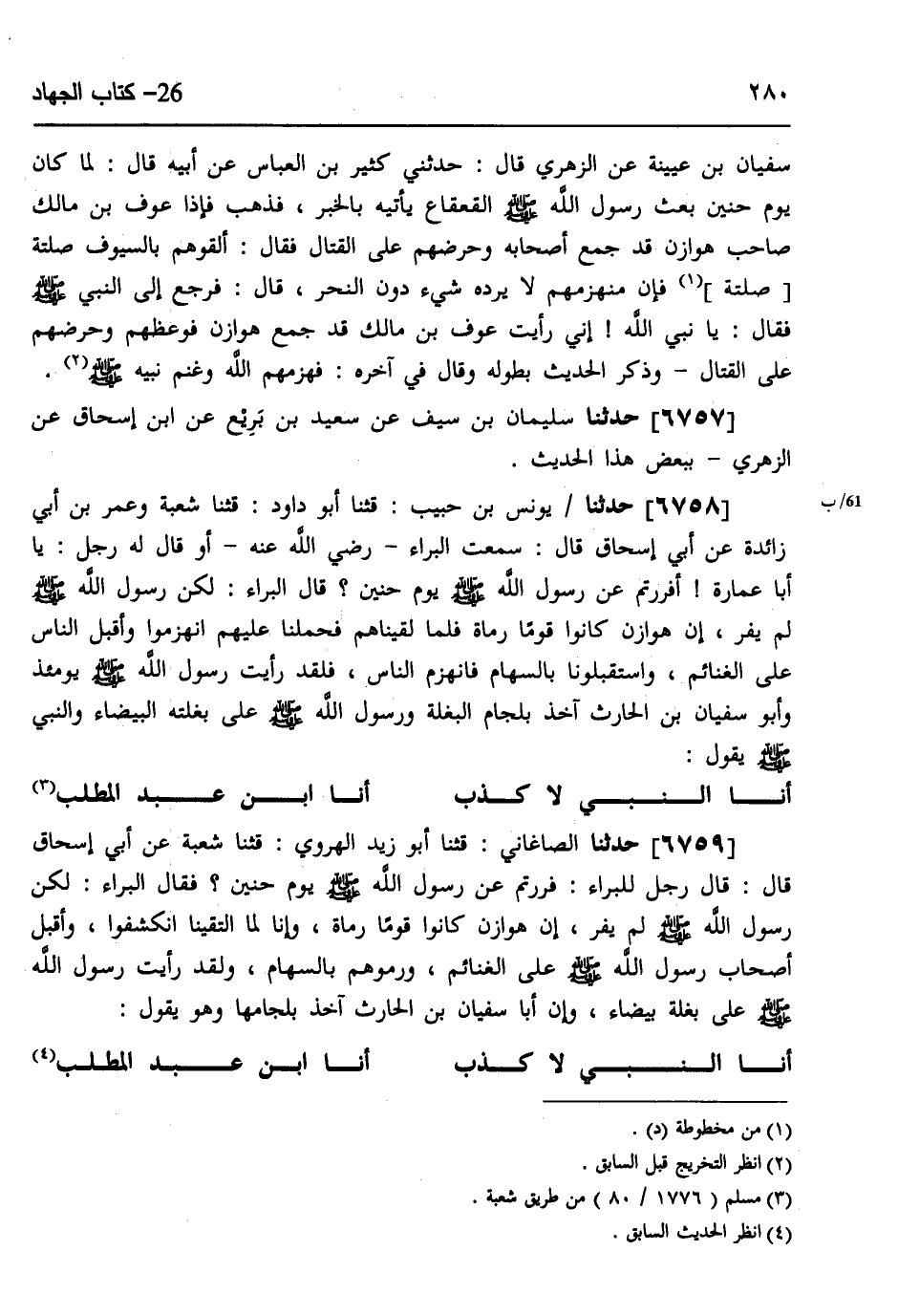 6759 - حَدَّثَنَا الصَّاغَانِيُّ، قثنا أَبُو زَيْدٍ الْهَرَوِيُّ، قثنا شُعْبَةُ، عَنْ أَبِي إِسْحَاقَ، قَالَ: قَالَ رَجُلٌ لِلْبَرَاءِ: فَرَرْتُمْ عَنْ رَسُولِ اللَّهِ صَلَّى اللهُ عَلَيْهِ وَسَلَّمَ يَوْمَ حُنَيْنٍ، فَقَالَ الْبَرَاءُ: لَكِنَّ رَسُولَ اللَّهِ صَلَّى اللهُ عَلَيْهِ وَسَلَّمَ لَمْ يَفِرَّ، §إِنَّ هَوَازِنَ كَانُوا قَوْمًا رُمَاةً، وَإِنَّا لَمَّا الْتَقَيْنَا انْكَشَفُوا، وَأَقْبَلَ أَصْحَابُ رَسُولِ اللَّهِ صَلَّى اللهُ عَلَيْهِ وَسَلَّمَ عَلَى الْغَنَائِمِ، وَرَمَوْهُمْ بِالسِّهَامِ، وَلَقَدْ رَأَيْتُ رَسُولَ اللَّهِ صَلَّى اللهُ عَلَيْهِ وَسَلَّمَ عَلَى بَغْلَةٍ بَيْضَاءَ، وَإِنَّ أَبَا سُفْيَانَ بْنَ الْحَارِثِ آخِذٌ بِلِجَامِهَا، وَهُوَ يَقُولُ: «أَنَا النَّبِيُّ لَا كَذِبْ أَنَا ابْنُ عَبْدِ الْمُطَّلِبْ»