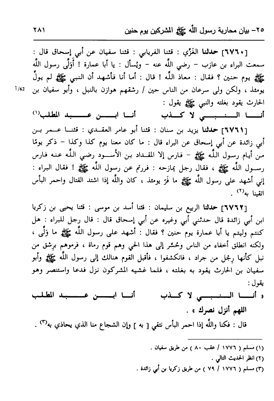 6760 - حَدَّثَنَا الْغَزِّيُّ، قثنا الْفِرْيَابِيُّ، قثنا سُفْيَانُ، عَنْ أَبِي إِسْحَاقَ، قَالَ: سَمِعْتُ الْبَرَاءَ بْنَ عَازِبٍ رَضِيَ اللَّهُ عَنْهُ وَيَسْأَلُ: يَا أَبَا عُمَارَةَ §أَوَلَّى رَسُولُ اللَّهِ صَلَّى اللهُ عَلَيْهِ وَسَلَّمَ يَوْمَ حُنَيْنٍ؟، فَقَالَ: مَعَاذَ اللَّهِ، قَالَ: أَمَّا أَنَا فَأَشْهَدُ أَنَّ النَّبِيَّ صَلَّى اللهُ عَلَيْهِ وَسَلَّمَ لَمْ يُوَلِّ يَوْمَئِذٍ، وَلَكِنْ وَلَّى سَرَعَانُ مِنَ النَّاسِ حِينَ رَشَقَهُمْ هَوَازِنُ بِالنَّبْلِ، وَأَبُو سُفْيَانَ بْنُ الْحَارِثِ يَقُودُ بَغْلَتَهُ، وَالنَّبِيُّ صَلَّى اللهُ عَلَيْهِ وَسَلَّمَ يَقُولُ: «أَنَا النَّبِيُّ لَا كَذِبْ أَنَا ابْنُ عَبْدِ الْمُطَّلِبْ»