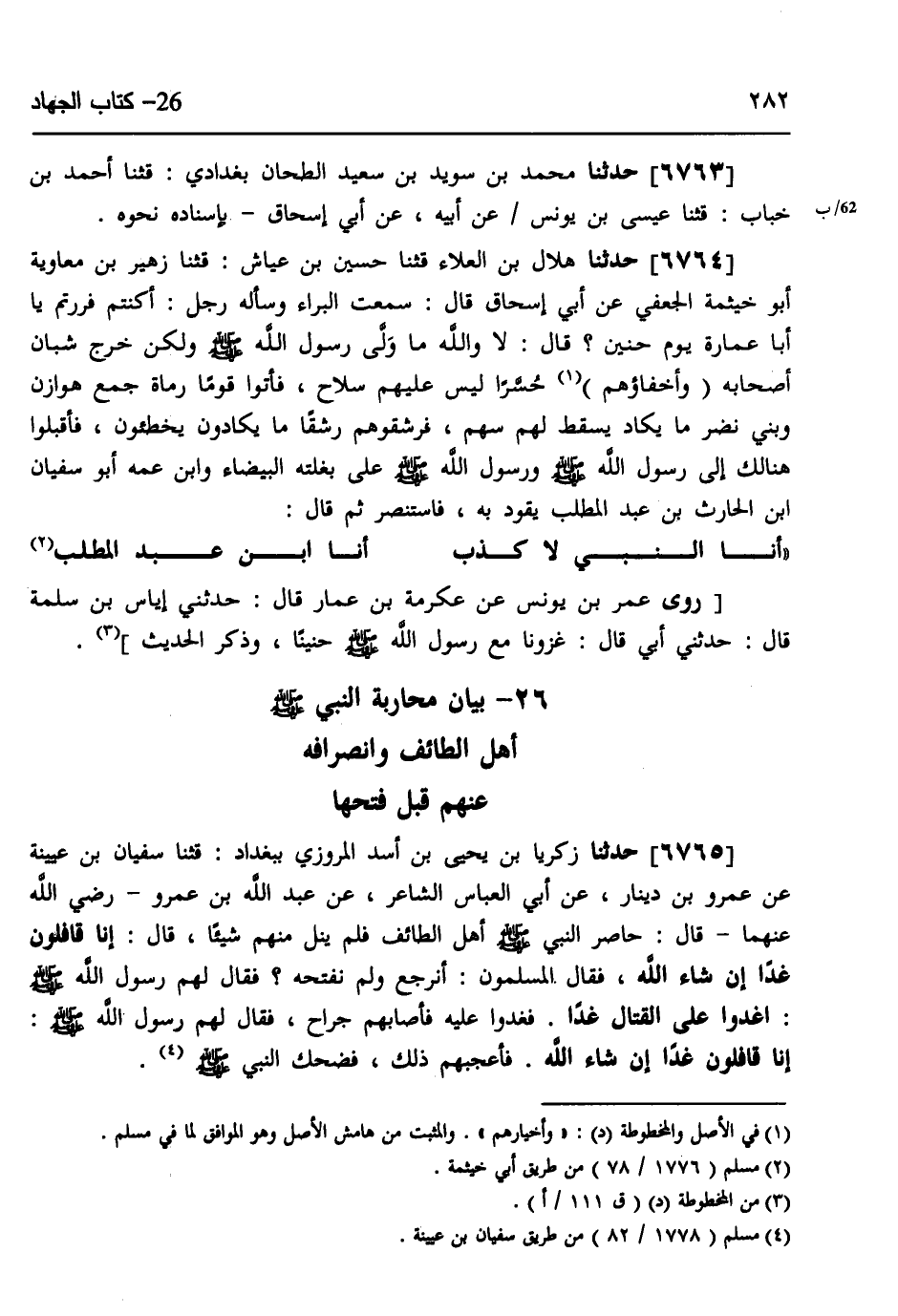 6765 - حَدَّثَنَا زَكَرِيَّا بْنُ يَحْيَى بْنِ أَسَدٍ الْمَرْوَزِيُّ، بِبَغْدَادَ، قثنا سُفْيَانُ بْنُ عُيَيْنَةَ، عَنْ عَمْرِو بْنِ دِينَارٍ، عَنْ أَبِي الْعَبَّاسِ الشَّاعِرِ، عَنْ عَبْدِ اللَّهِ بْنِ عَمْرٍو رَضِيَ اللَّهُ عَنْهُمَا، قَالَ: §حَاصَرَ النَّبِيُّ صَلَّى اللهُ عَلَيْهِ وَسَلَّمَ أَهْلَ الطَّائِفِ، فَلَمْ يَنَلْ مِنْهُمْ شَيْئًا، قَالَ: «إِنَّا قَافِلُونَ غَدًا إِنْ شَاءَ اللَّهُ» ، فَقَالَ الْمُسْلِمُونَ: أَنَرْجِعُ وَلَمْ نَفْتَحْهُ؟، فَقَالَ لَهُمْ رَسُولُ اللَّهِ صَلَّى اللهُ عَلَيْهِ وَسَلَّمَ: «اغْدُوا عَلَى الْقِتَالِ غَدًا» ، فَغَدَوْا عَلَيْهِ فَأَصَابَهُمْ جِرَاحٌ، فَقَالَ لَهُمْ رَسُولُ اللَّهِ صَلَّى اللهُ عَلَيْهِ وَسَلَّمَ: «إِنَّا قَافِلُونَ غَدًا إِنْ شَاءَ اللَّهُ» ، فَأَعْجَبَهُمْ ذَلِكَ فَضَحِكَ النَّبِيُّ صَلَّى اللهُ عَلَيْهِ وَسَلَّمَ -[283]-،