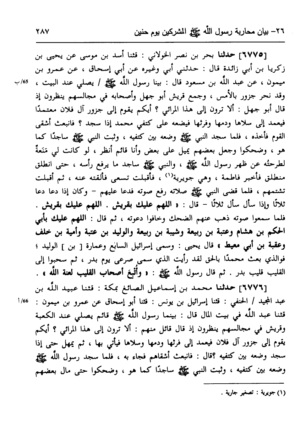 6775 - حَدَّثَنَا بَحْرُ بْنُ نَصْرٍ الْخَوْلَانِيُّ، قثنا أَسَدُ بْنُ مُوسَى، عَنْ يَحْيَى بْنِ زَكَرِيَّا بْنِ أَبِي زَائِدَةَ، قَالَ: حَدَّثَنِي أَبِي وَغَيْرُهُ، عَنْ أَبِي إِسْحَاقَ، عَنْ عَمْرِو بْنِ مَيْمُونٍ، عَنْ عَبْدِ اللَّهِ بْنِ مَسْعُودٍ، قَالَ: بَيْنَا §رَسُولُ اللَّهِ صَلَّى اللهُ عَلَيْهِ وَسَلَّمَ يُصَلِّي عِنْدَ الْبَيْتِ، وَقَدْ نُحِرَ جَزُورٌ بِالْأَمْسِ، وَجَمْعُ قُرَيْشٍ أَبُو جَهْلٍ وَأَصْحَابُهُ فِي مَجَالِسِهِمْ يَنْظُرُونَ، إِذْ قَالَ أَبُو جَهْلٍ: أَلَا تَرَوْنَ إِلَى هَذَا الْمُرَائِي، أَيُّكُمْ يَقُومُ إِلَى جَزُورِ آلِ فُلَانٍ مُعْتَمِدًا فَيَعْمِدُ إِلَى سَلَاهَا وَدَمِهَا وَفَرْثِهَا فَيَضَعُهُ عَلَى كَتِفَيْ مُحَمَّدٍ إِذَا سَجَدَ، فَانْبَعَثَ أَشْقَى الْقَوْمِ، فَأَخَذَهُ فَلَمَّا سَجَدَ النَّبِيُّ صَلَّى اللهُ عَلَيْهِ وَسَلَّمَ وَضَعَهُ بَيْنَ كَتِفَيْهِ وَثَبَتَ النَّبِيُّ صَلَّى اللهُ عَلَيْهِ وَسَلَّمَ سَاجِدًا كَمَا هُوَ، وَضَحِكُوا وَجَعَلَ بَعْضُهُمْ يَمِيلُ عَلَى بَعْضٍ، وَأَنَا قَائِمٌ أَنْظُرُ لَوْ كَانَتْ لِي مَنَعَةٌ لَطَرَحْتُهُ عَنْ ظَهْرِ رَسُولِ اللَّهِ صَلَّى اللهُ عَلَيْهِ وَسَلَّمَ، وَالنَّبِيُّ صَلَّى اللهُ عَلَيْهِ وَسَلَّمَ سَاجِدٌ مَا يَرْفَعُ رَأْسَهُ، حَتَّى انْطَلَقَ مُنْطَلِقٌ فَأَخْبَرَ فَاطِمَةَ، وَهِيَ جُوَيْرِيَةٌ، فَأَقْبَلَتْ تَسْعَى فَأَلْقَتْهُ عَنْهُ، ثُمَّ أَقْبَلَتْ تَشْتِمُهُمْ، فَلَمَّا قَضَى النَّبِيُّ صَلَّى اللهُ عَلَيْهِ وَسَلَّمَ صَلَاتَهُ رَفَعَ صَوْتَهُ فَدَعَا عَلَيْهِمْ، وَكَانَ إِذَا دَعَا دَعَا ثَلَاثًا وَإِذَا سَأَلَ سَأَلَ ثَلَاثًا، قَالَ: «اللَّهُمَّ عَلَيْكَ بِقُرَيْشٍ، اللَّهُمَّ عَلَيْكَ بِقُرَيْشٍ» ، فَلَمَّا سَمِعُوا صَوْتَهُ ذَهَبَ عَنْهُمُ الضَّحِكَ وَخَافُوا دَعْوَتَهُ، ثُمَّ قَالَ: «اللَّهُمَّ عَلَيْكَ بِأَبِي الْحَكَمِ بْنِ هِشَامٍ، وَعُتْبَةَ بْنِ رَبِيعَةَ، وَشَيْبَةَ بْنِ رَبِيعَةَ، وَالْوَلِيدِ بْنِ عُتْبَةَ، وَأُمَيَّةَ بْنِ خَلَفٍ، وَعُقْبَةَ بْنِ أَبِي مُعَيْطٍ» قَالَ يَحْيَى: وَسَمَّى إِسْرَائِيلُ السَّابِعَ: وَعُمَارَةُ بْنُ الْوَلِيدِ، فَوَالَّذِي بَعَثَ مُحَمَّدًا بِالْحَقِّ لَقَدْ رَأَيْتُ الَّذِيَ سَمَّى صَرْعَى يَوْمَ بَدْرٍ، ثُمَّ سُحِبُوا إِلَى الْقَلِيبِ، قَلِيبِ بَدْرٍ، ثُمَّ قَالَ رَسُولُ اللَّهِ صَلَّى اللهُ عَلَيْهِ وَسَلَّمَ: «وَأُتْبِعَ أَصْحَابُ الْقَلِيبِ لَعْنَةَ اللَّهِ»