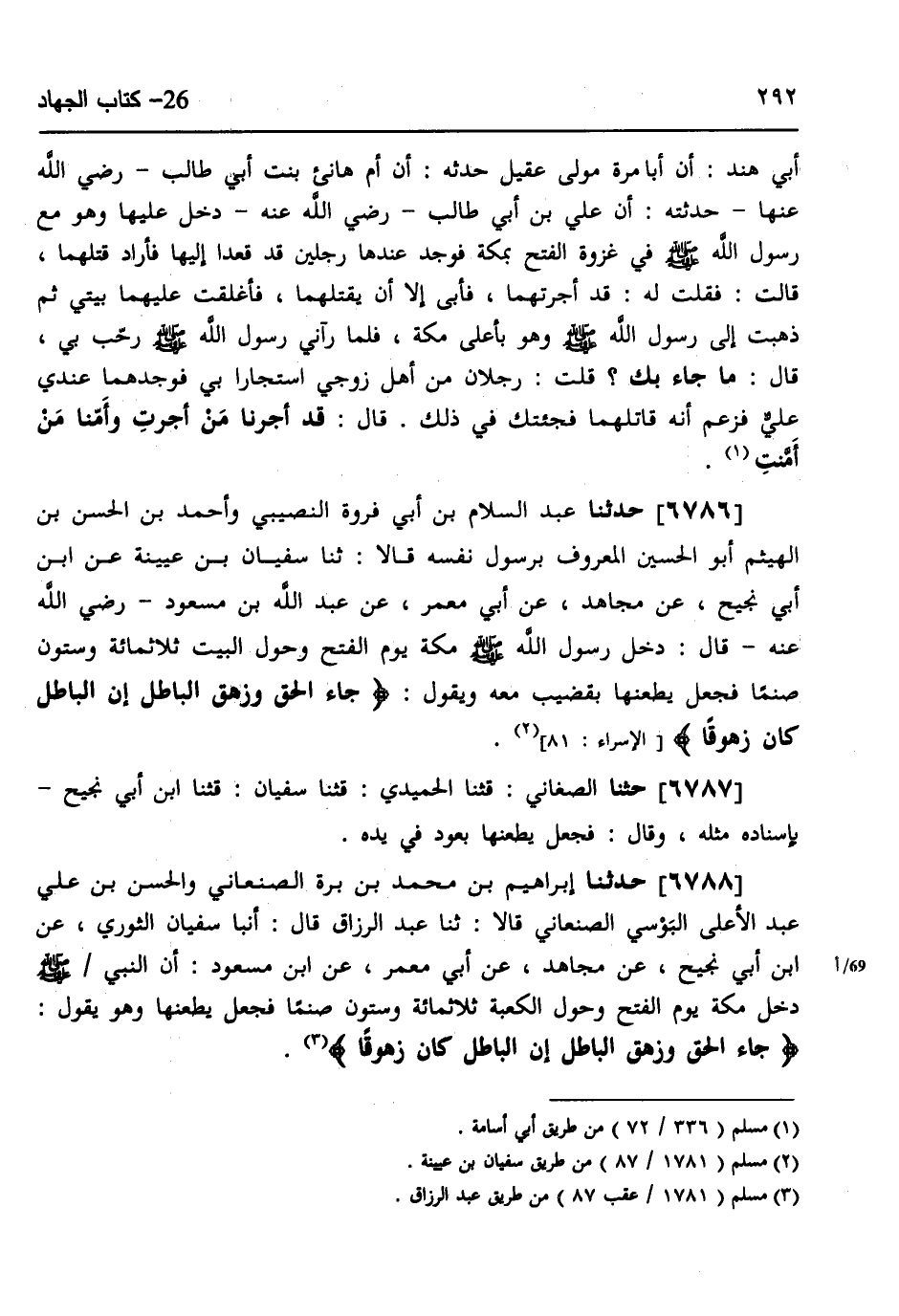 6786 - حَدَّثَنَا عَبْدُ السَّلَامِ بْنُ أَبِي فَرْوَةَ النَّصِيبِيُّ، وَأَحْمَدُ بْنُ الْحَسَنِ بْنِ الْهَيْثَمِ أَبُو الْحُسَيْنِ الْمَعْرُوفُ بِرَسُولِ نَفْسِهِ، قَالَا: ثنا سُفْيَانُ بْنُ عُيَيْنَةَ، عَنِ ابْنِ أَبِي نَجِيحٍ، عَنْ مُجَاهِدٍ، عَنْ أَبِي مَعْمَرٍ، عَنْ عَبْدِ اللَّهِ بْنِ مَسْعُودٍ رَضِيَ اللَّهُ عَنْهُ قَالَ: §دَخَلَ رَسُولُ اللَّهِ صَلَّى اللهُ عَلَيْهِ وَسَلَّمَ مَكَّةَ يَوْمَ الْفَتْحِ، وَحَوْلَ الْبَيْتِ ثَلَاثُمِائَةٍ وَسِتُّونَ صَنَمًا، فَجَعَلَ يَطْعَنُهَا بِقَضِيبٍ مَعَهُ، وَيَقُولُ: «جَاءَ الْحَقُّ وَزَهَقَ الْبَاطِلُ إِنَّ الْبَاطِلَ كَانَ زَهُوقًا» ،