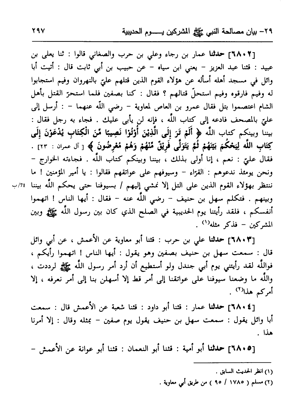 6802 - حَدَّثَنَا عَمَّارُ بْنُ رَجَاءٍ، وَعَلِيُّ بْنُ حَرْبٍ، والصَّغَانِيُّ، قَالُوا: ثنا يَعْلَى بْنُ عُبَيْدٍ، قثنا عَبْدُ الْعَزِيزِ يَعْنِي ابْنَ سِيَاهٍ، عَنْ حَبِيبِ بْنِ أَبِي ثَابِتٍ، قَالَ: أَتَيْتُ أَبَا وَائِلٍ فِي مَسْجِدِ أَهْلِهِ أَسْأَلُهُ عَنْ هَؤُلَاءِ الْقَوْمِ الَّذِينَ قَتَلَهُمْ عَلِيٌّ بِالنَّهْرَوَانِ وَفِيمَ اسْتَجَابُوا لَهُ، وَفِيمَ فَارَقُوهُ، وَفِيمَ اسْتَحَلَّ قِتَالَهُمْ، فَقَالَ: كُنَّا بِصِفِّينَ فَلَمَّا اسْتَحَرَّ الْقَتْلُ بِأَهْلِ الشَّامِ اعْتَصَمُوا بَتَلٍّ، فَقَالَ عَمْرُو بْنُ الْعَاصِ لِمُعَاوِيَةَ رَضِيَ اللَّهُ عَنْهُمَا: " أَرْسِلْ إِلَى عَلِيٍّ بِالْمُصْحَفِ فَادْعُهُ إِلَى كِتَابِ اللَّهِ فَإِنَّهُ لَنْ يَأْبَى عَلَيْكَ فَجَاءَ بِهِ رَجُلٌ، فَقَالَ: بَيْنَنَا وَبَيْنَكُمْ كِتَابُ اللَّهِ: {§أَلَمْ تَرَ إِلَى الَّذِينَ أُوتُوا نَصِيبًا مِنَ الْكِتَابِ يُدْعَوْنَ إِلَى كِتَابِ اللَّهِ لِيَحْكُمَ بَيْنَهُمْ ثُمَّ يَتَوَلَّى فَرِيقٌ مِنْهُمْ وَهُمْ مُعْرِضُونَ} [آل عمران: 23] ، فَقَالَ عَلِيٌّ: نَعَمْ إِنَّا أَوْلَى بِذَلِكَ بَيْنَنَا وَبَيْنَكُمْ كِتَابُ اللَّهِ، فَجَاءَتْهُ الْخَوَارِجُ، وَنَحْنُ يَوْمَئِذٍ نَدْعُوهُمُ الْقُرَّاءُ، وَسُيوفُهُمْ عَلَى عَوَاتِقِهِمْ، فَقَالُوا: يَا أَمِيرَ الْمُؤْمِنِينَ مَا نَنْتَظِرُ بِهَؤُلَاءِ الْقَوْمِ الَّذِينَ عَلَى التَّلِّ إِلَّا نَمْشِي إِلَيْهِمْ بِسُيوفِنَا حَتَّى يَحْكُمَ اللَّهُ بَيْنَنَا وَبَيْنَهُمْ، فَتَكَلَّمَ سَهْلُ بْنُ حُنَيْفٍ رَضِيَ اللَّهُ عَنْهُ، فَقَالَ: أَيُّهَا النَّاسُ اتَّهِمُوا أَنْفُسَكُمْ فَلَقَدْ رَأَيْتُنَا يَوْمَ الْحُدَيْبِيَةِ فِي الصُّلْحِ الَّذِي كَانَ بَيْنَ رَسُولِ اللَّهِ صَلَّى اللهُ عَلَيْهِ وَسَلَّمَ وَبَيْنَ الْمُشْرِكِينَ، فَذَكَرَ مِثْلَهُ