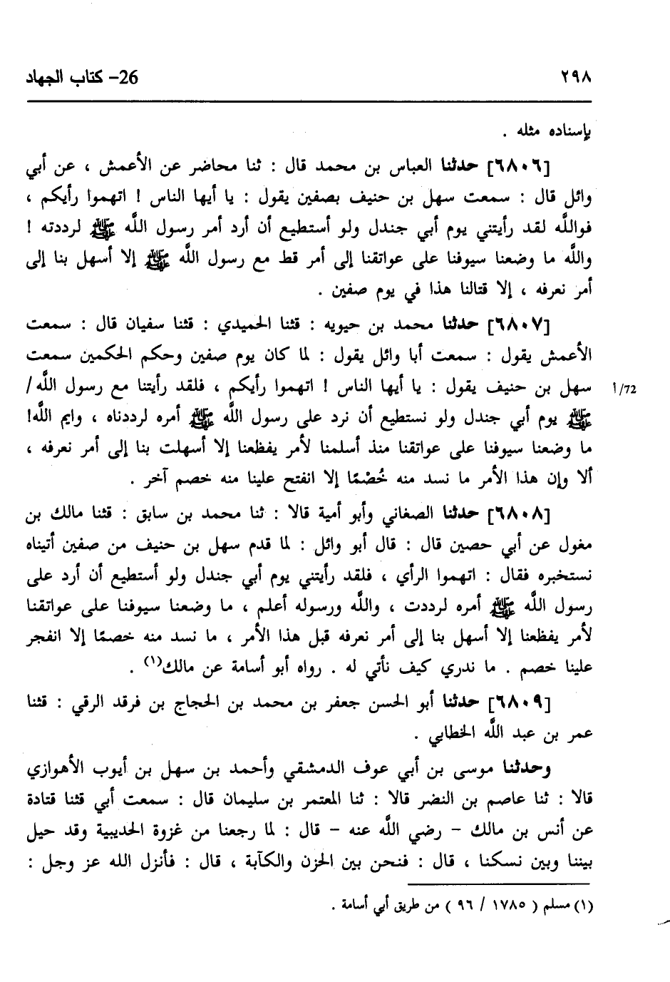 6807 - حَدَّثَنَا مُحَمَّدُ بْنُ حَيَّوَيْهِ، قثنا الْحُمَيْدِيُّ، قثنا سُفْيَانُ، قَالَ: سَمِعْتُ الْأَعْمَشَ، يَقُولُ: سَمِعْتُ أَبَا وَائِلٍ، يَقُولُ: لَمَّا كَانَ يَوْمُ صِفِّينَ وَحُكْمُ الْحَكَمَيْنِ سَمِعْتُ سَهْلَ بْنَ حُنَيْفٍ يَقُولُ: يَا أَيُّهَا النَّاسُ §اتَّهِمُوا رَأْيَكُمْ، فَلَقَدْ رَأَيْتُنَا مَعَ رَسُولِ اللَّهِ صَلَّى اللهُ عَلَيْهِ وَسَلَّمَ يَوْمَ أَبِي جَنْدَلٍ، وَلَوْ نَسْتَطِيعُ أَنْ نَرُدَّ عَلَى رَسُولِ اللَّهِ صَلَّى اللهُ عَلَيْهِ وَسَلَّمَ أَمْرَهُ لَرَدَدْنَاهُ، وَايْمُ اللَّهِ مَا وَضَعْنَا سُيوفَنَا عَلَى عَوَاتِقِنَا مُنْذُ أَسْلَمْنَا لِأَمْرٍ يُفْظِعُنَا إِلَّا أَسْهَلَتْ بِنَا إِلَى أَمْرٍ نَعْرِفُهُ أَلَا، وَإِنَّ هَذَا الْأَمْرَ مَا نَسُدُّ مِنْهُ خَصْمًا إِلَّا انْفَتَحَ عَلَيْنَا مِنْهُ خَصْمٌ آخِرُ "