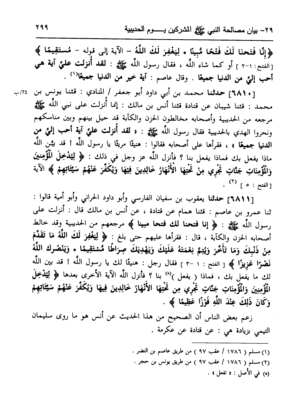 6811- حَدَّثَنَا يَعْقُوبُ بْنُ سُفْيَانَ الْفَارِسِيُّ ، وَأَبُو دَاوُدَ الْحَرَّانِيُّ ، وَأَبُو أُمَيَّةَ ، قَالُوا : حَدَّثَنَا عَمْرُو بْنُ عَاصِمٍ ، قَالَ : حَدَّثَنَا هَمَّامٌ ، عَنْ قَتَادَةَ ، عَنْ أَنَسِ بْنِ مَالِكٍ ، قَالَ : أُنْزِلَتْ عَلَى رَسُولِ اللهِ صَلَّى الله عَلَيهِ وسَلَّم : {إِنَّا فَتَحْنَا لَكَ فَتْحًا مُبِينًا} ، مَرْجِعَهُمْ مِنَ الْحُدَيْبِيَةِ ، وَقَدْ خَالَطَ أَصْحَابَهُ الْحُزْنَ وَالْكَآبَةَ ، قَالَ : فَقَرَأَهَا عَلَيْهِمْ حَتَّى بَلَغَ : {لِيَغْفِرَ لَكَ اللَّهُ مَا تَقَدَّمَ مِنْ ذَنْبِكَ وَمَا تَأَخَّرَ وَيُتِمَّ نِعْمَتَهُ عَلَيْكَ وَيَهْدِيَكَ صِرَاطًا مُسْتَقِيمًا وَيَنْصُرَكَ اللَّهُ نَصْرًا عَزِيزًا} ، فَقَالَ رَجُلٌ : هَنِيئًا لَكَ يَا رَسُولَ اللهِ ، قَدْ بَيَّنَ اللَّهُ لَكَ مَا يَفْعَلُ بِكَ ، فَمَاذَا يَفْعَلُ بِنَا ؟ فَأَنْزَلَ اللَّهُ الآيَةَ الأُخْرَى بَعْدَهَا : {لِيُدْخِلَ الْمُؤْمِنِينَ وَالْمُؤْمِنَاتِ جَنَّاتٍ تَجْرِي مِنْ تَحْتِهَا الأَنْهَارُ خَالِدِينَ فِيهَا وَيُكَفِّرَ عَنْهُمْ سَيِّئَاتِهِمْ وَكَانَ ذَلِكَ عِنْدَ اللهِ فَوْزًا عَظِيمًا}.
